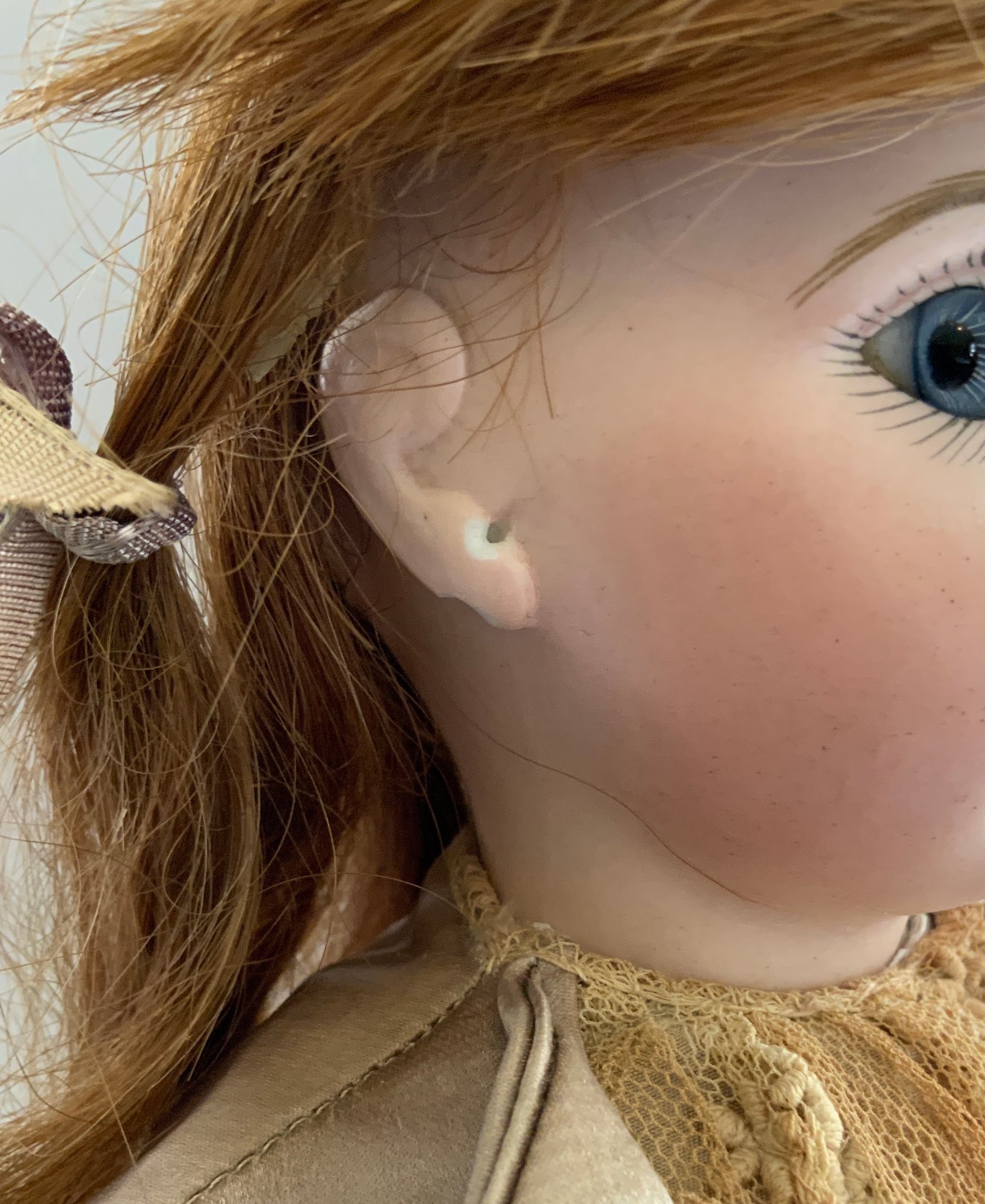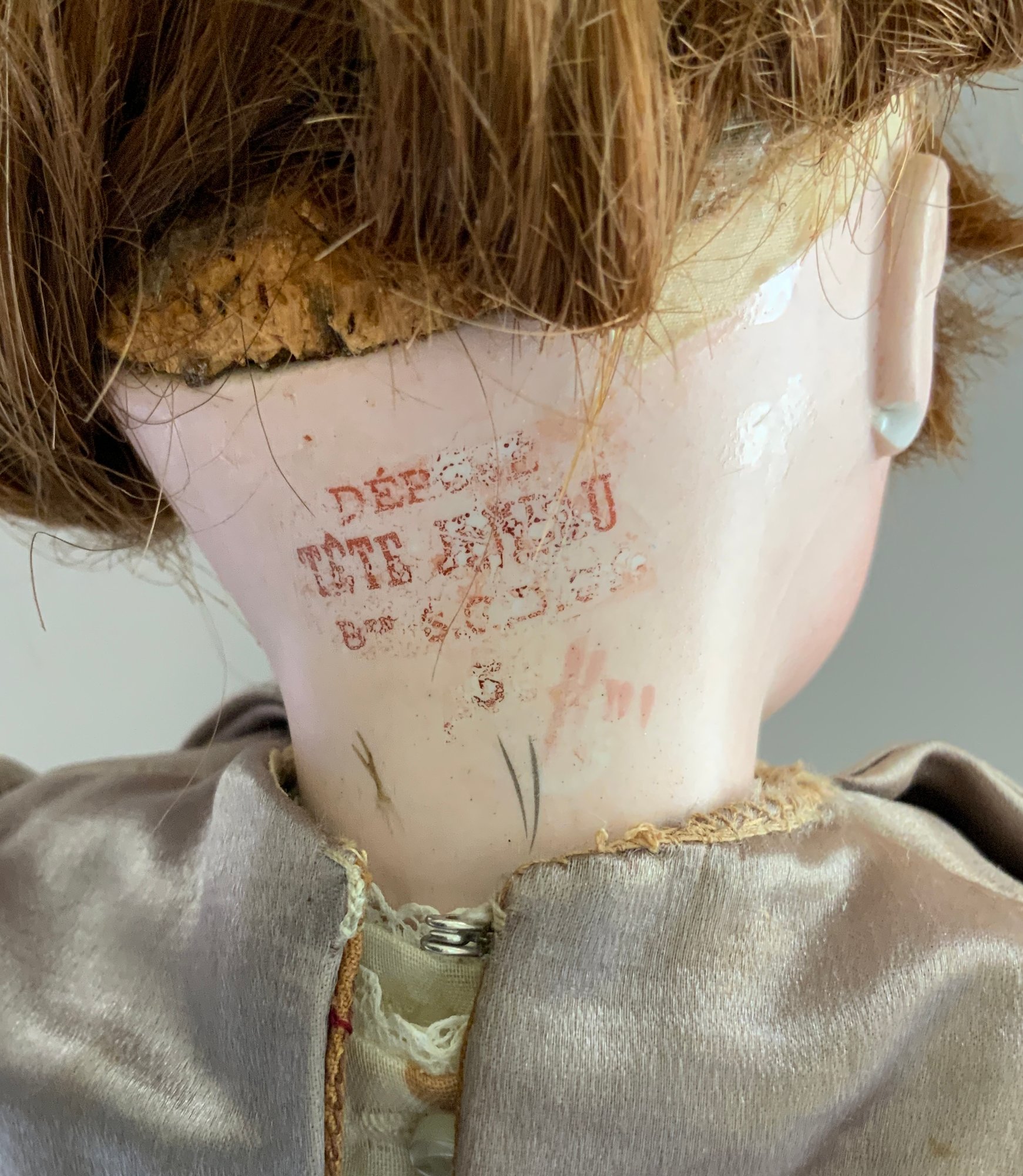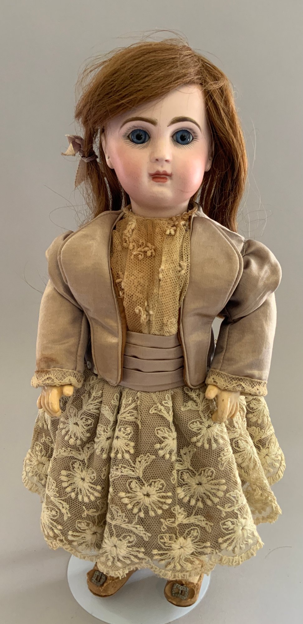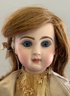14” Depose Tete Jumeau Bte S G D G 5 red stamp, blue glass paperweight eyes, CM, PE (nicks), red mohair wig, Blue stamp Jumeau compo body, brown silk dress with lace, (light stains, wig glued down),