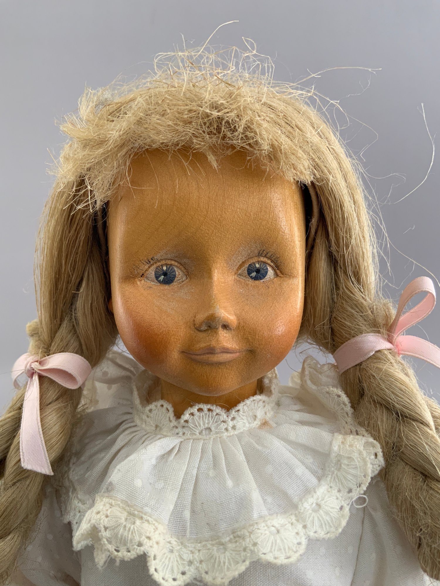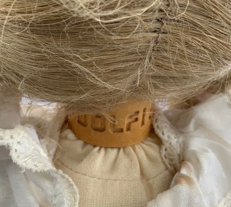 14” Dolfi Italy wood doll, marked DOLFI86, painted features, cloth body, blonde mohair wig, wood limbs, white dress (stain)