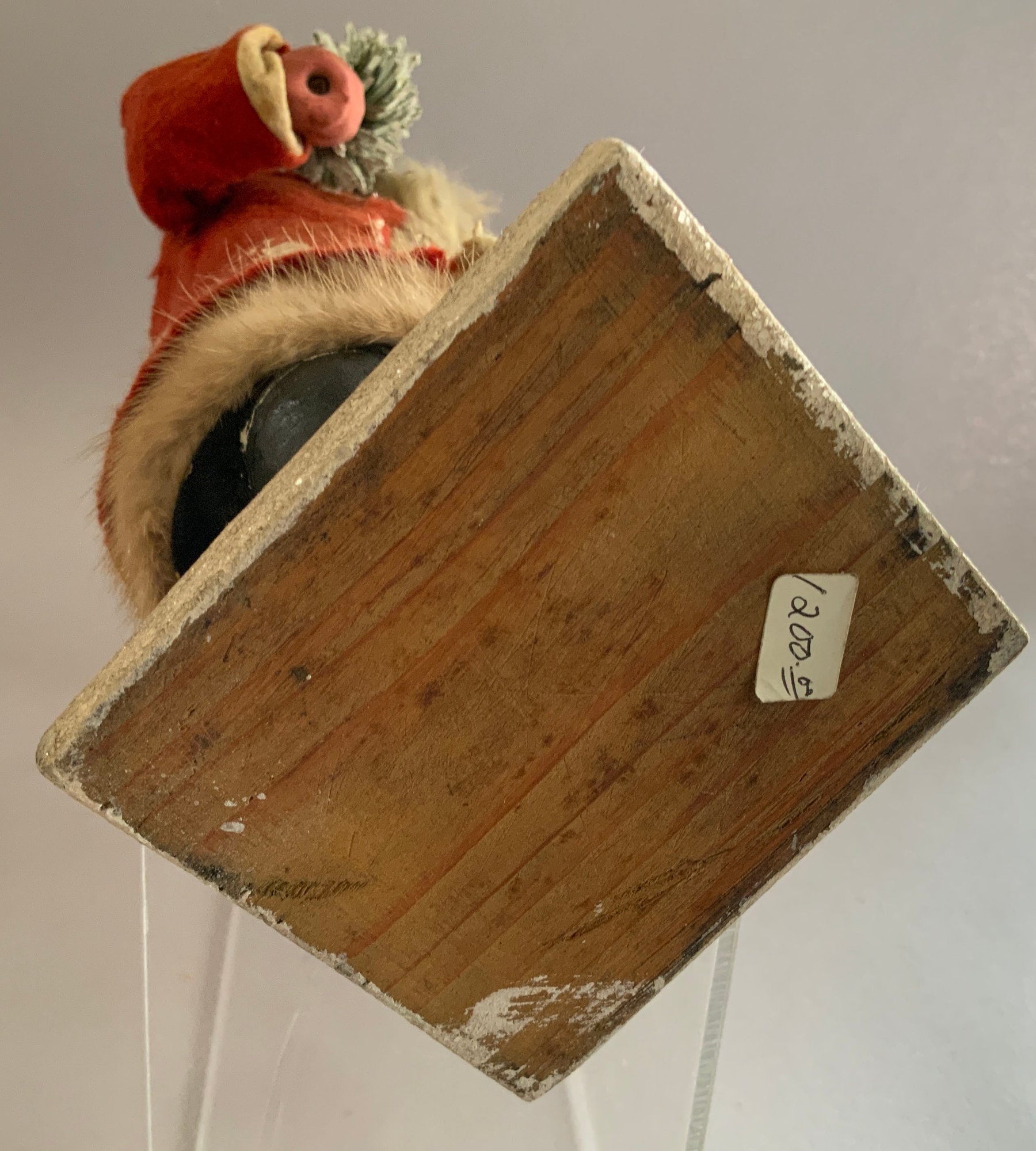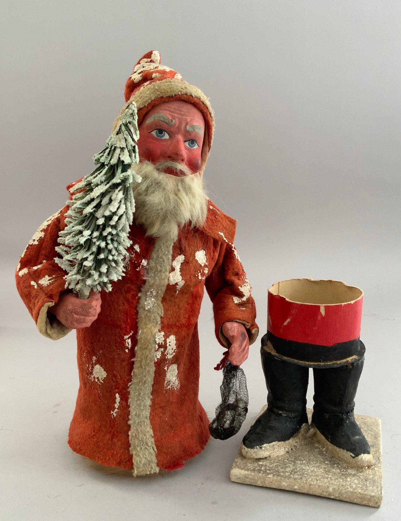 14” German paper mache Santa candy container holding a Christmas tree, painted features, red snow covered outfit, long white beard, black boots (repairs), good example