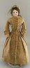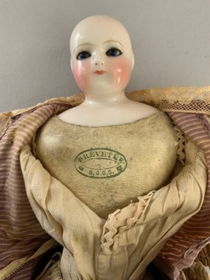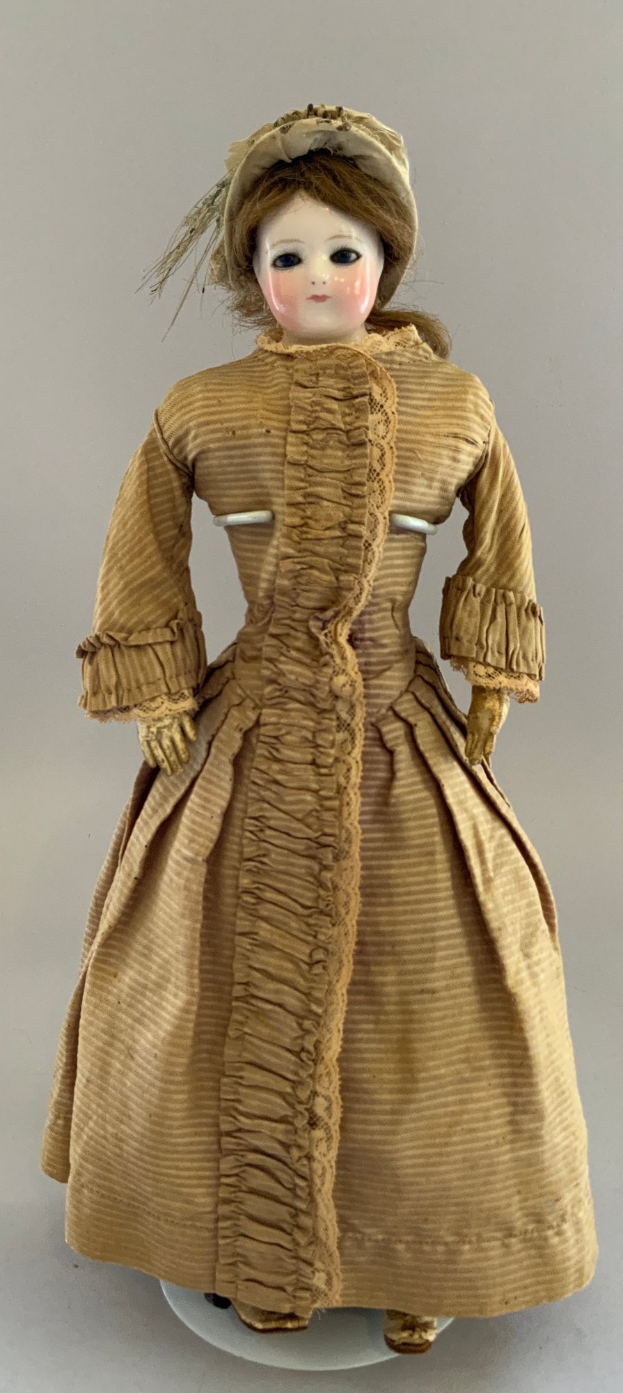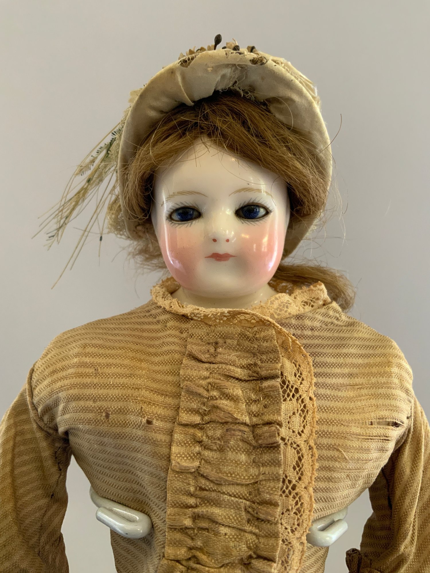 14” Glazed shoulder head Rohmer fashion, blue glass eyes, CM, brown HH wig, kid body with green oval breast stamp Brevette S.D.G.D., brown silk suit (faded), white leather boots