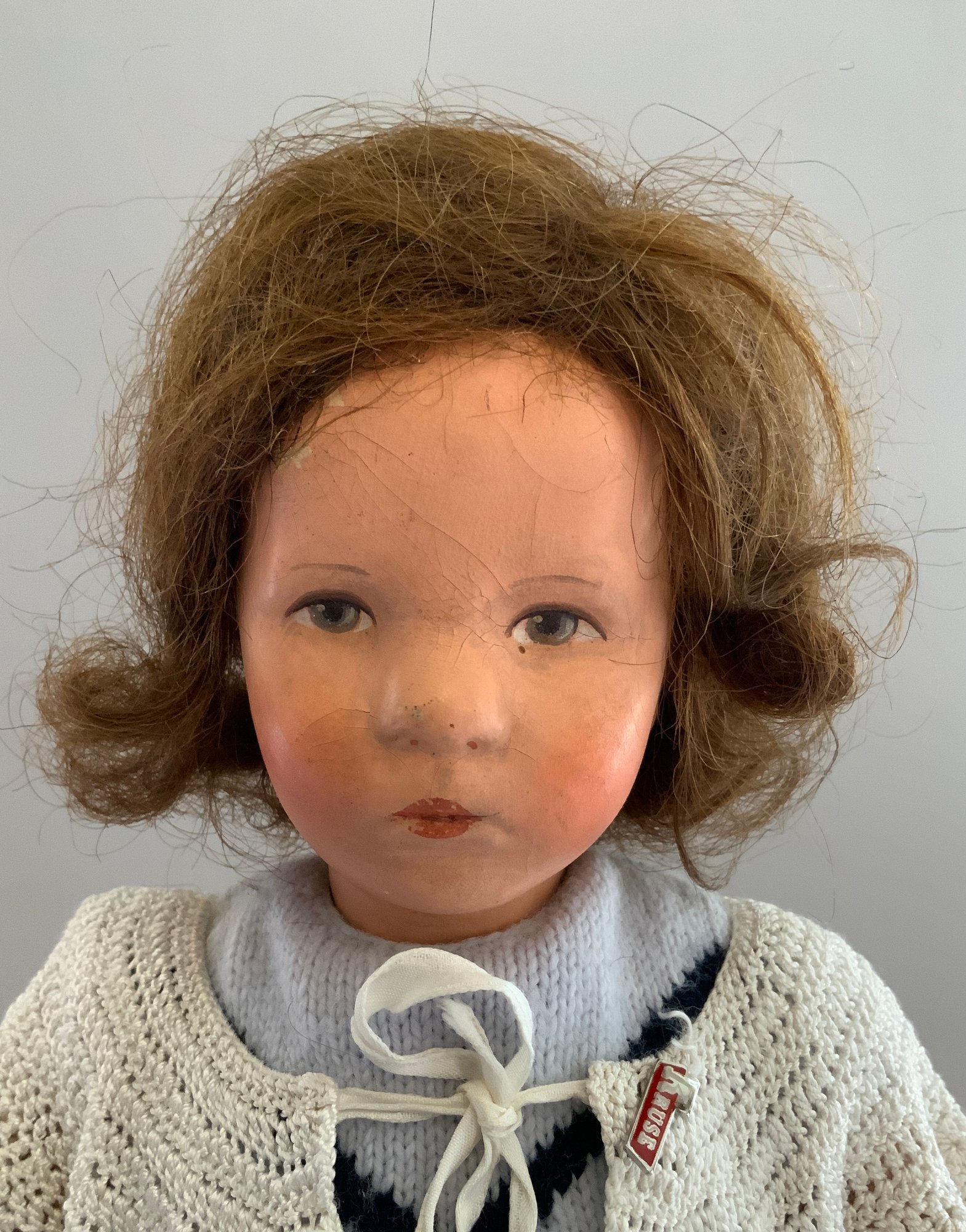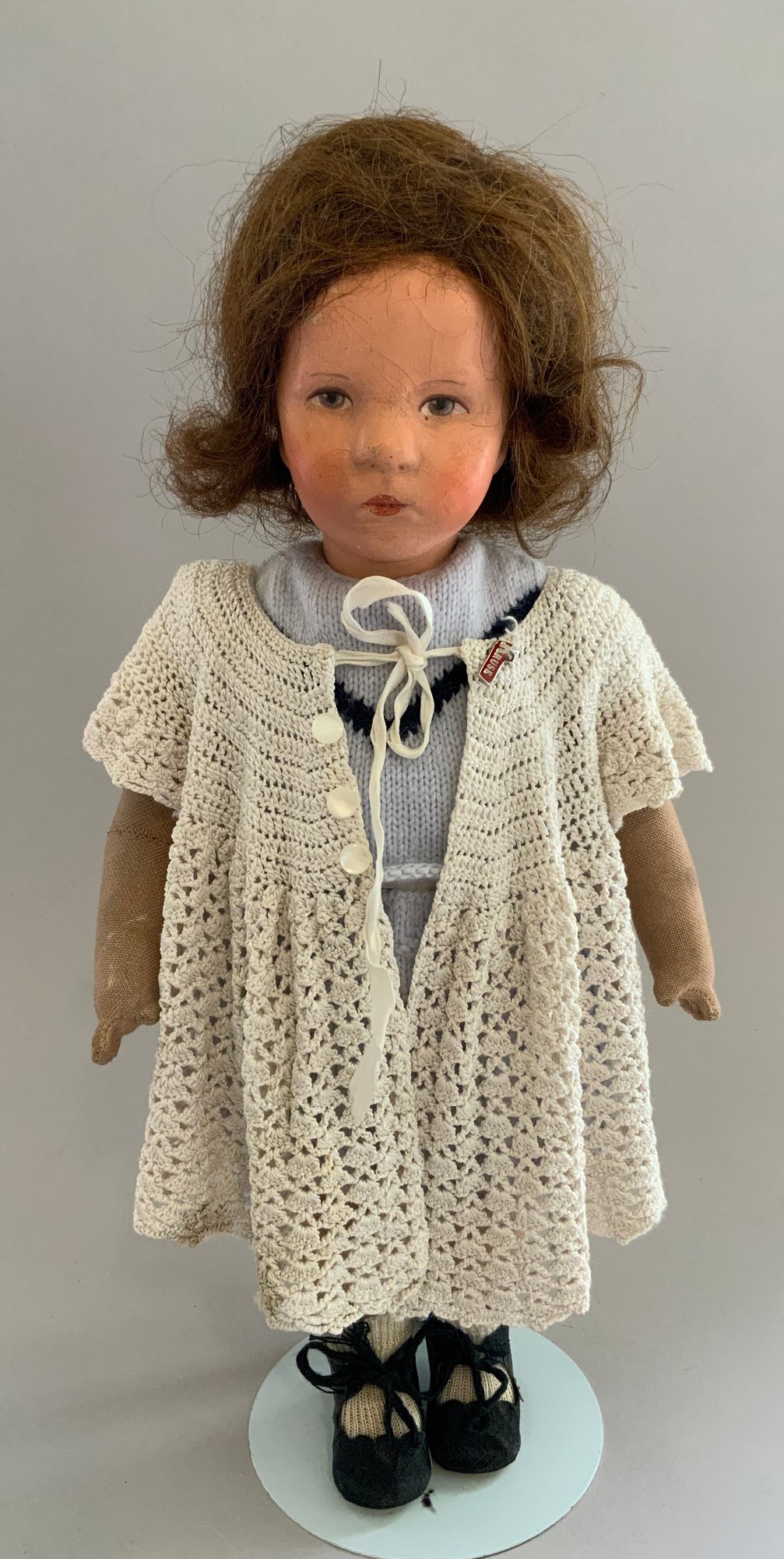 14” Kathe Kruse 1930’s, painted features (crazing), brown mohair wig, cloth body, knit outfit,