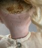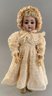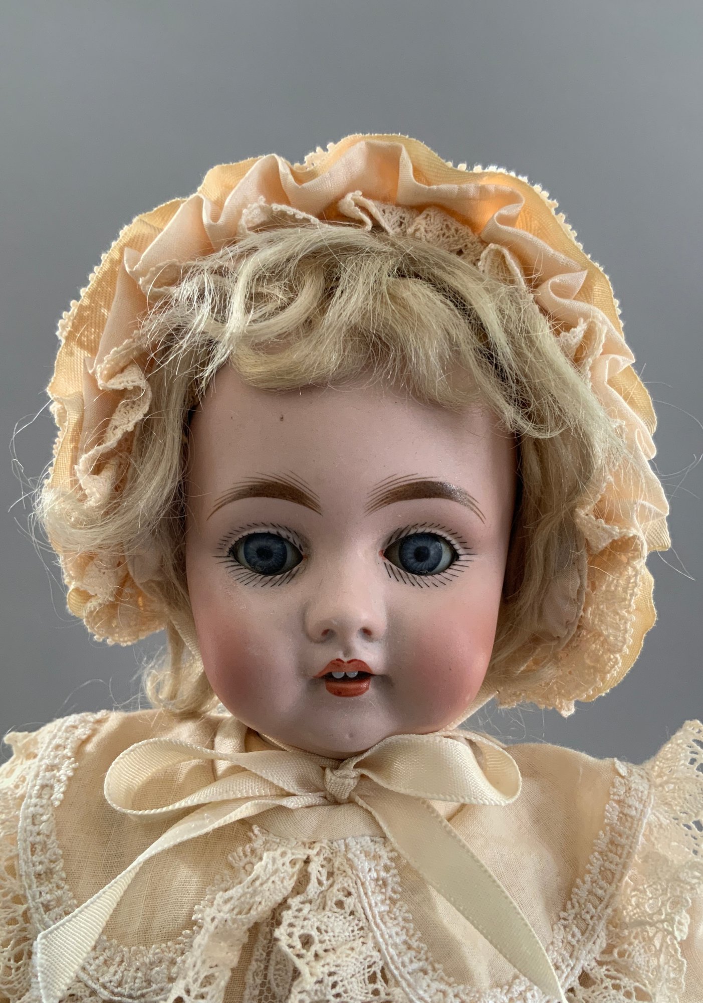 14 ½” Kestner 143, blue glass sleep eyes, OM with teeth, blonde mohair wig, BJCB, white needle work dress (neck rubs at socket)