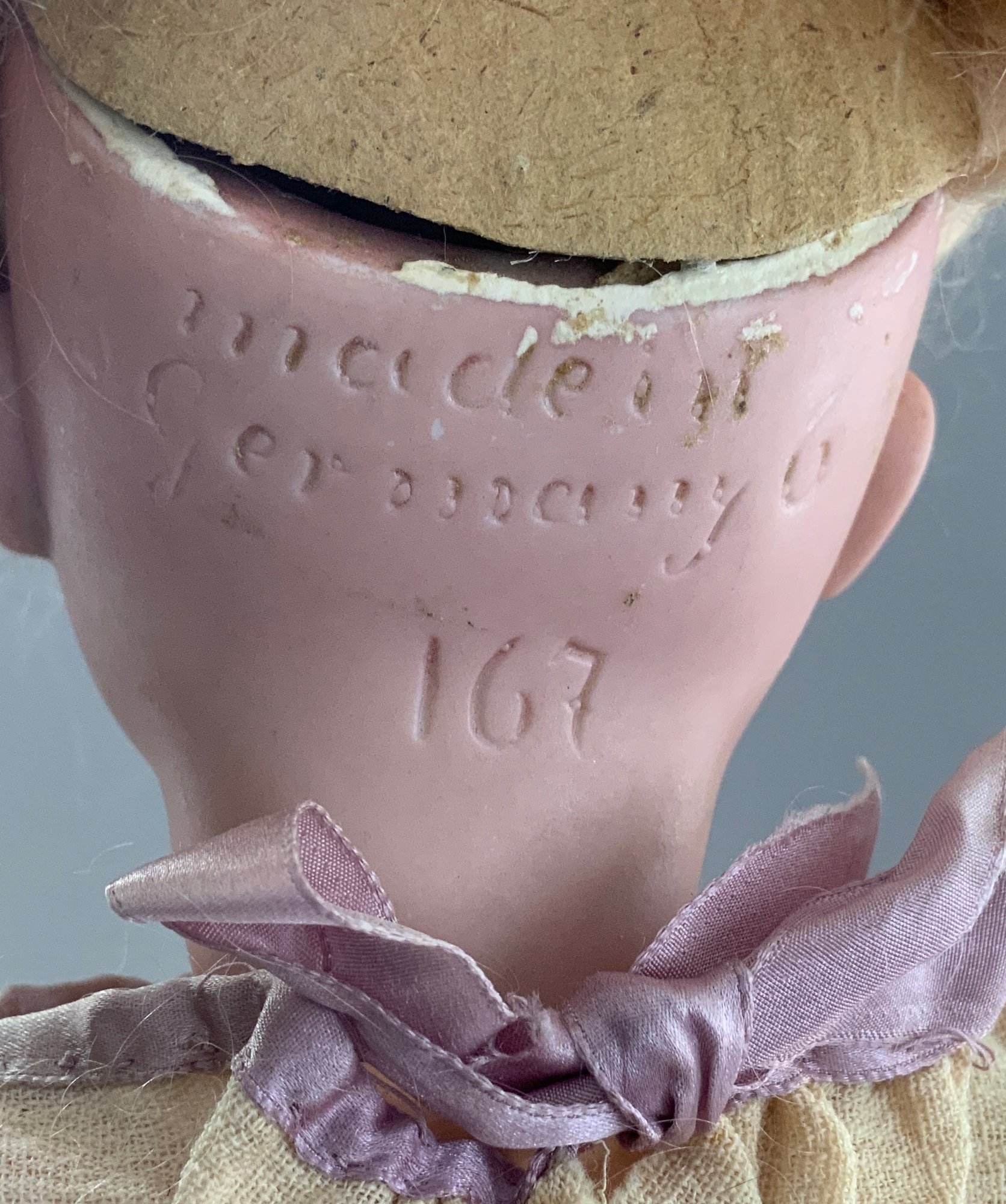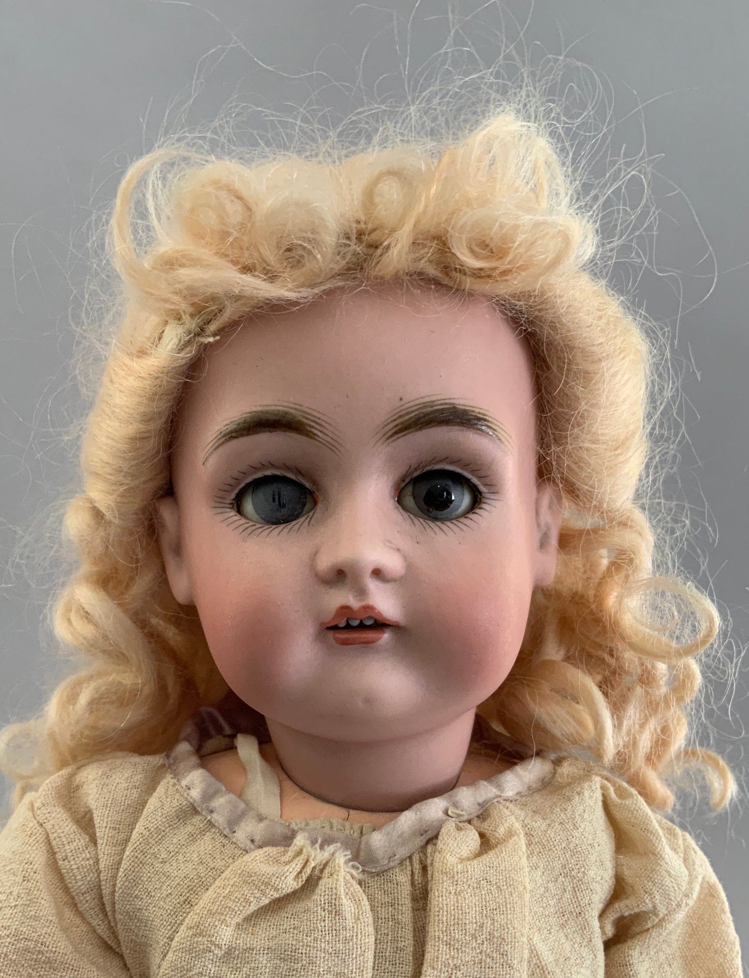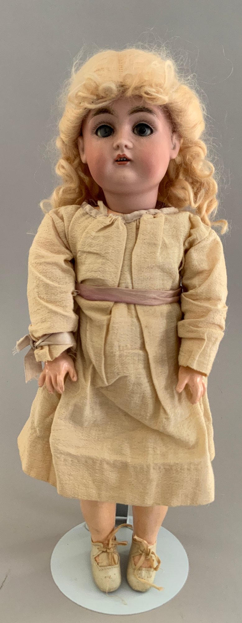 14” Kestner 167, blue glass sleep eyes, OM with teeth, blonde mohair wig, BJCB, off white dress
