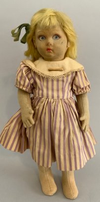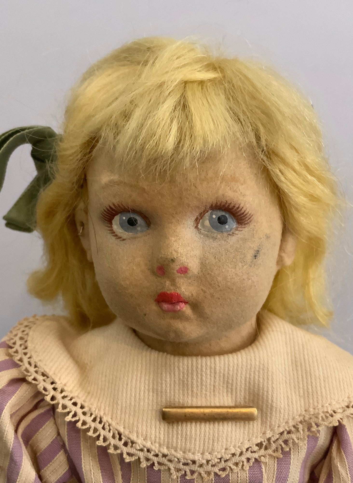 14” Lenci, painted features, blonde mohair wig, purple stripe dress, (soiled face)