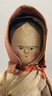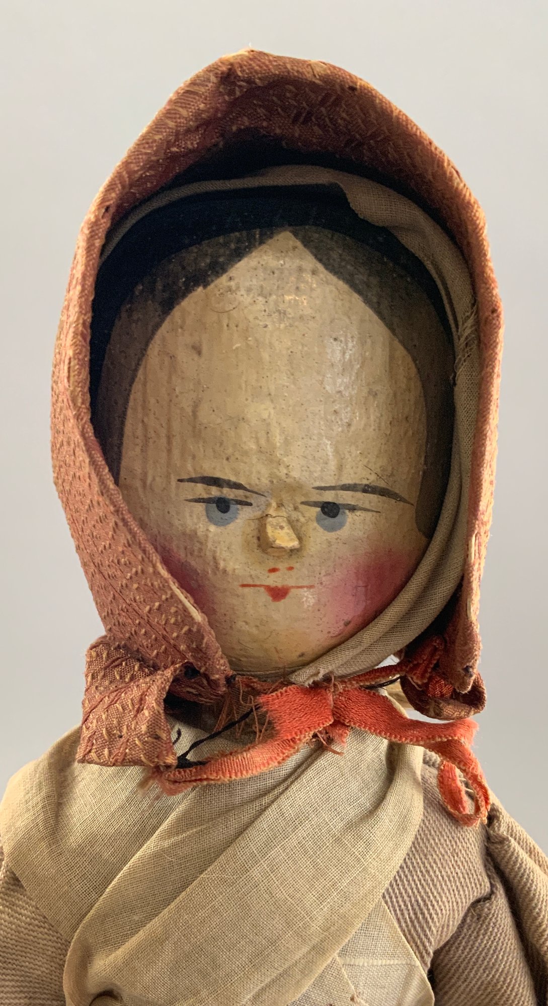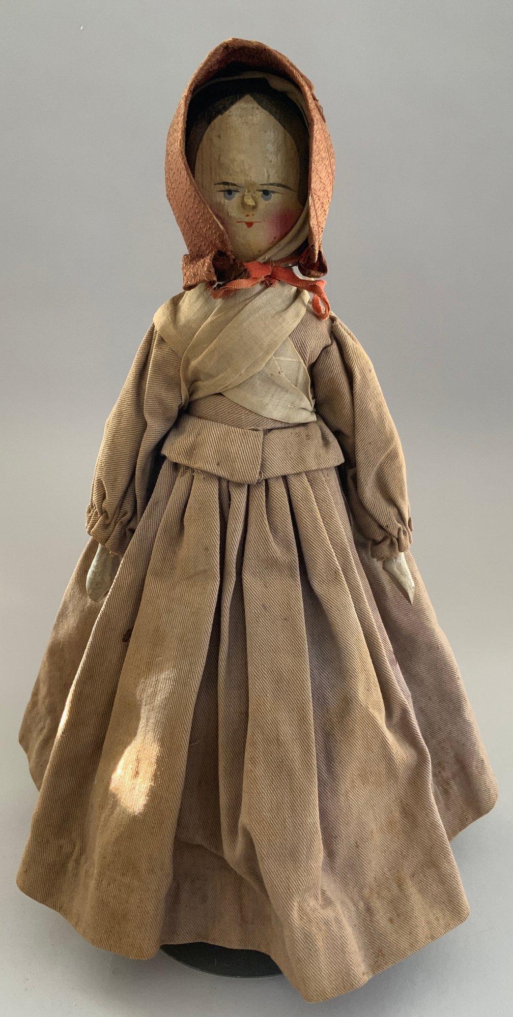 14” Peg wooden on jointed wood body, painted features (touchups), early twill outfit (stains), bonnet, painted black shoes