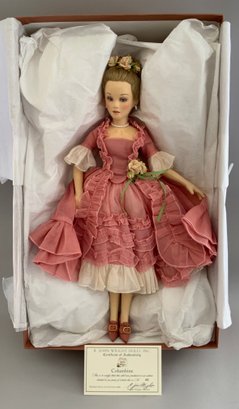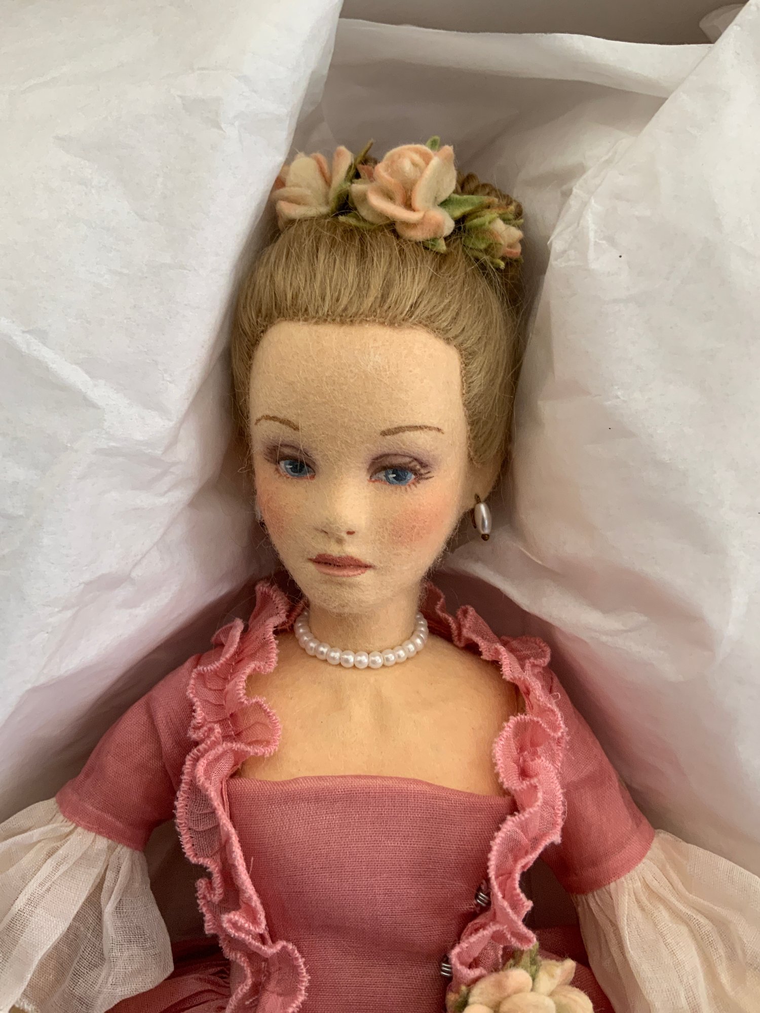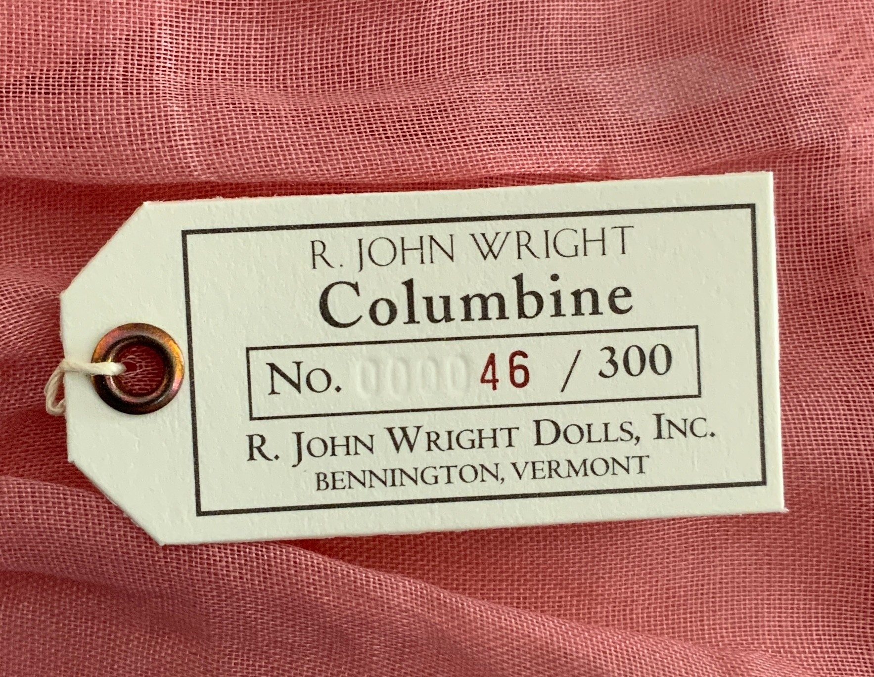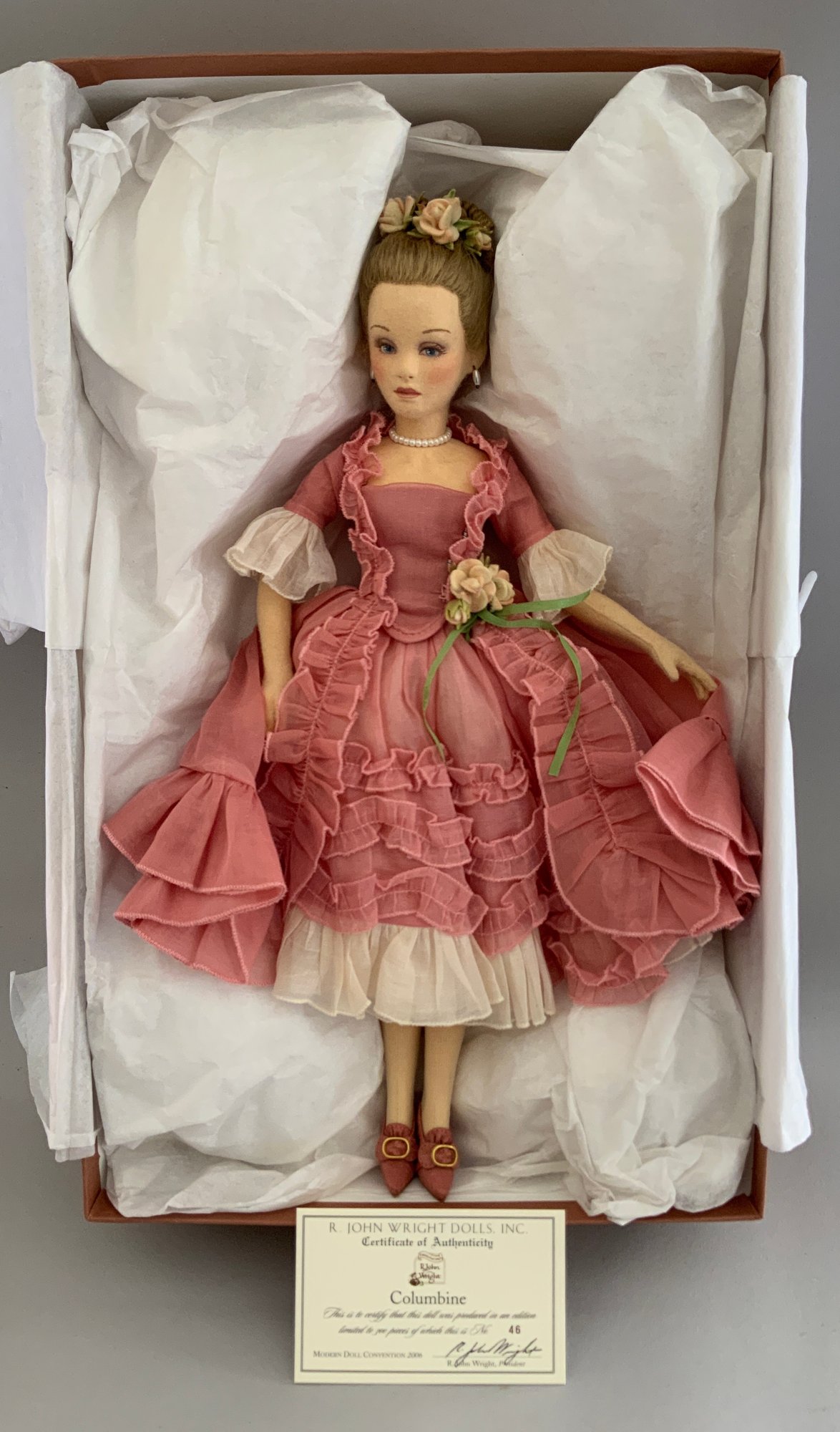 14” R John Wright felt doll, “Columbine” 46/300 Modern Doll Convention 2006, painted features, blonde hair, pink dress, with tags & original box, excellent condition