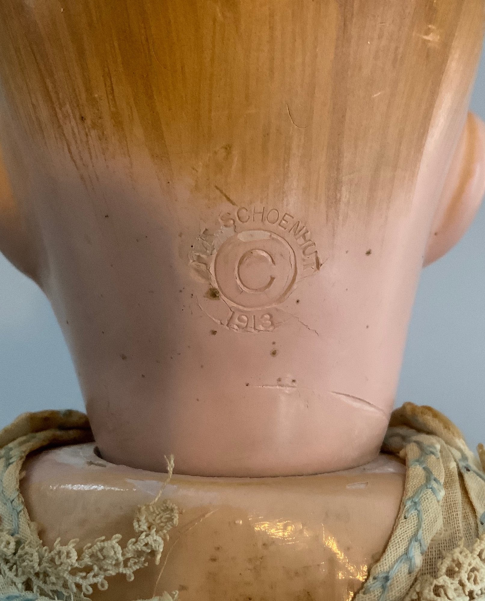 14” Schoenhut baby boy, painted features, (left wrist & leg cracks), faded outfit
