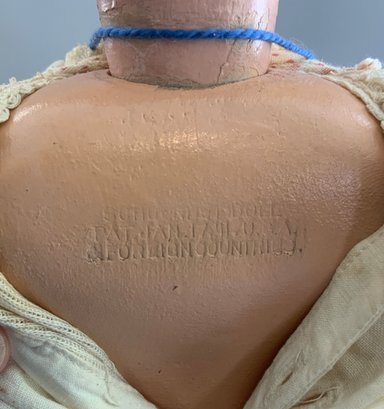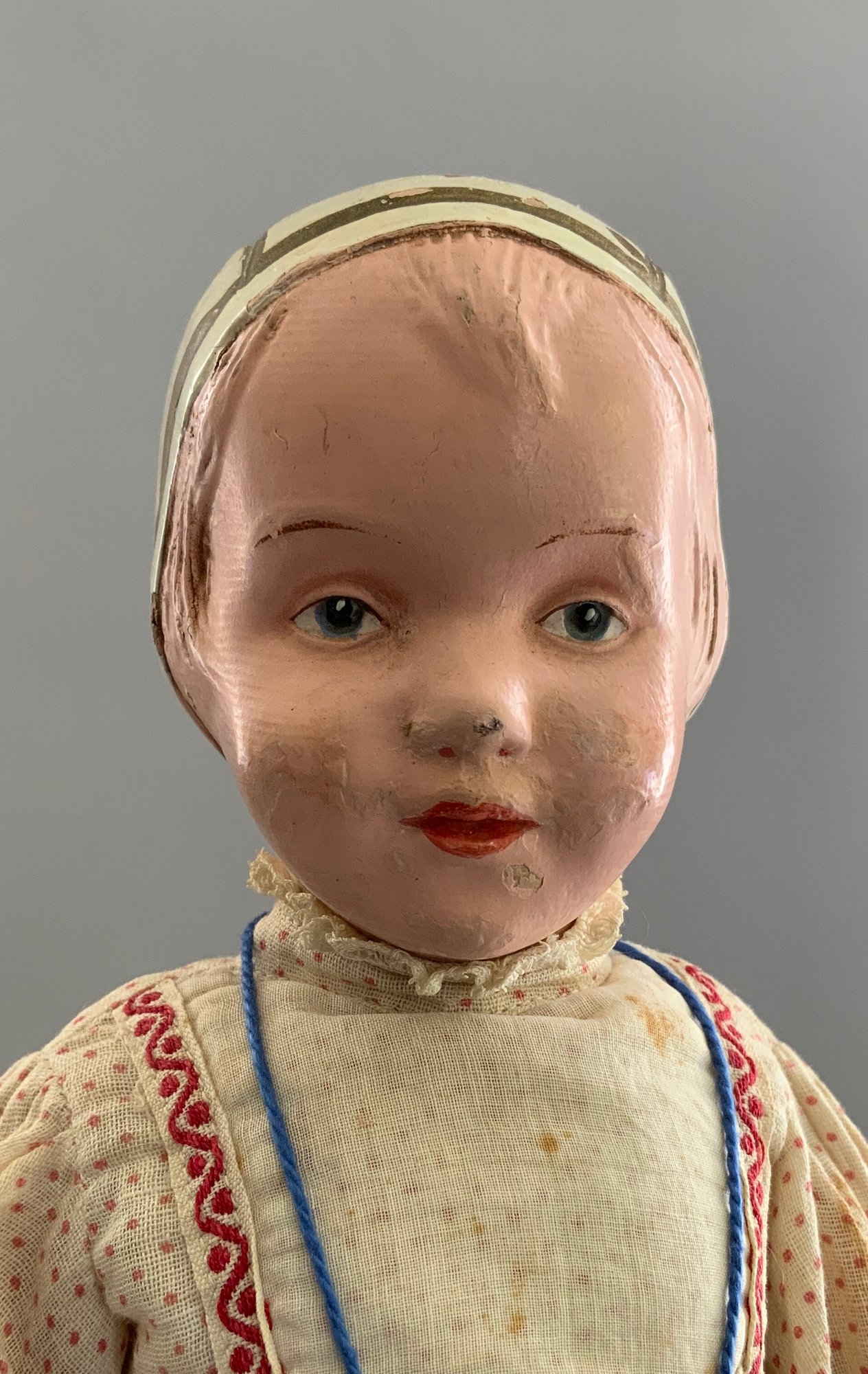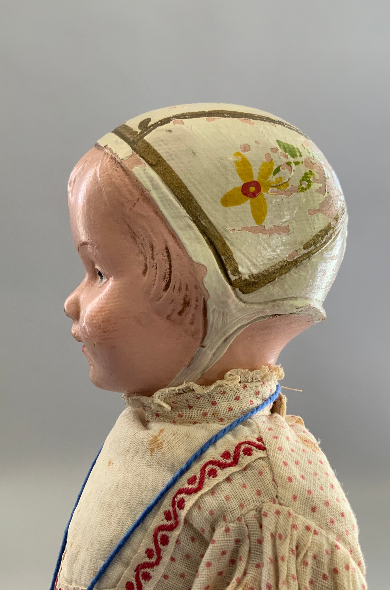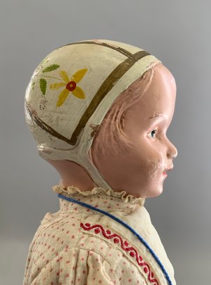 14” Schoenhut bonnet top girl, painted features & bonnet, incised mark, red/white outfit (fading, wear), Schoenhut shoes (rough), (areas of repaint)