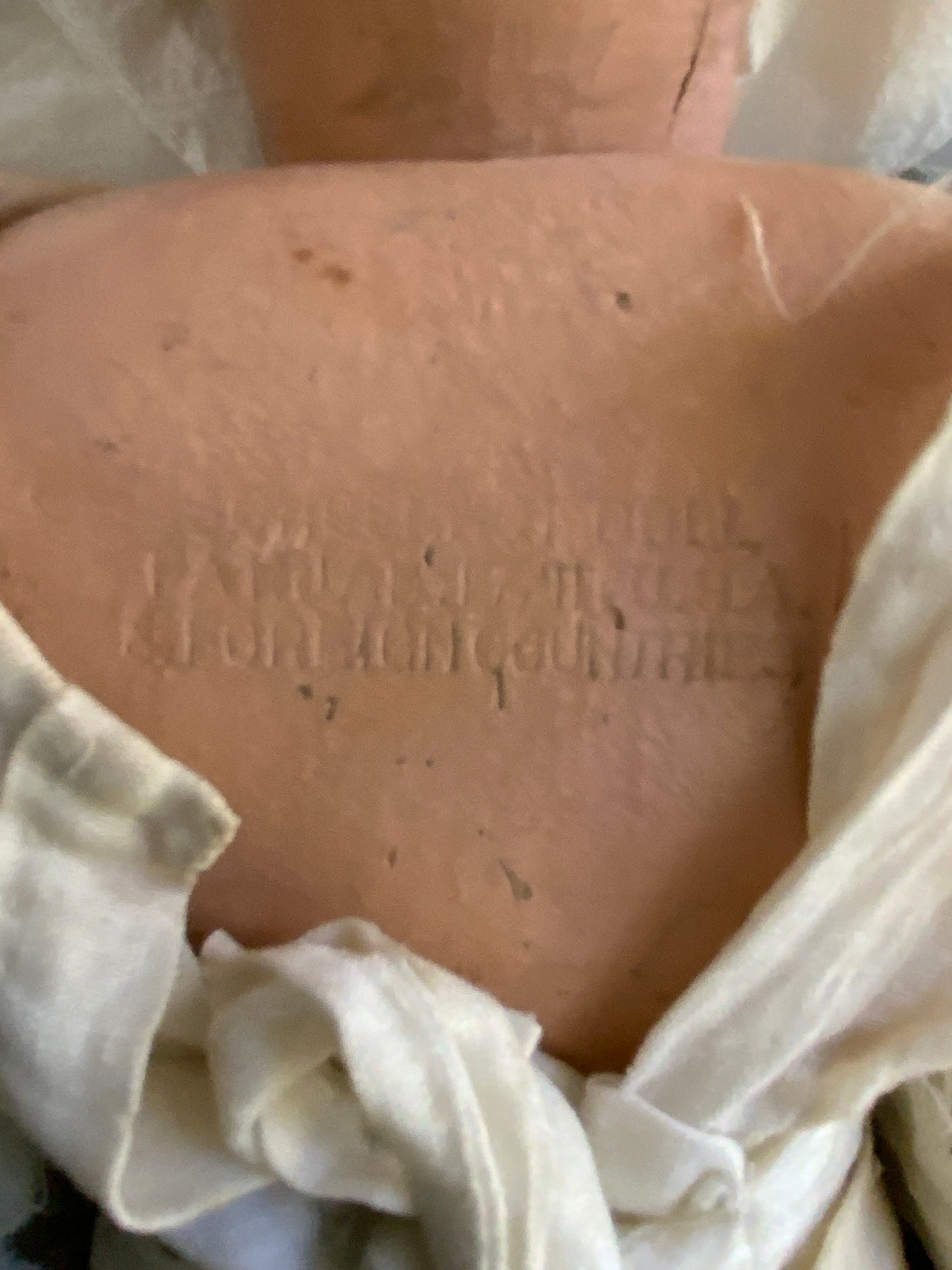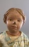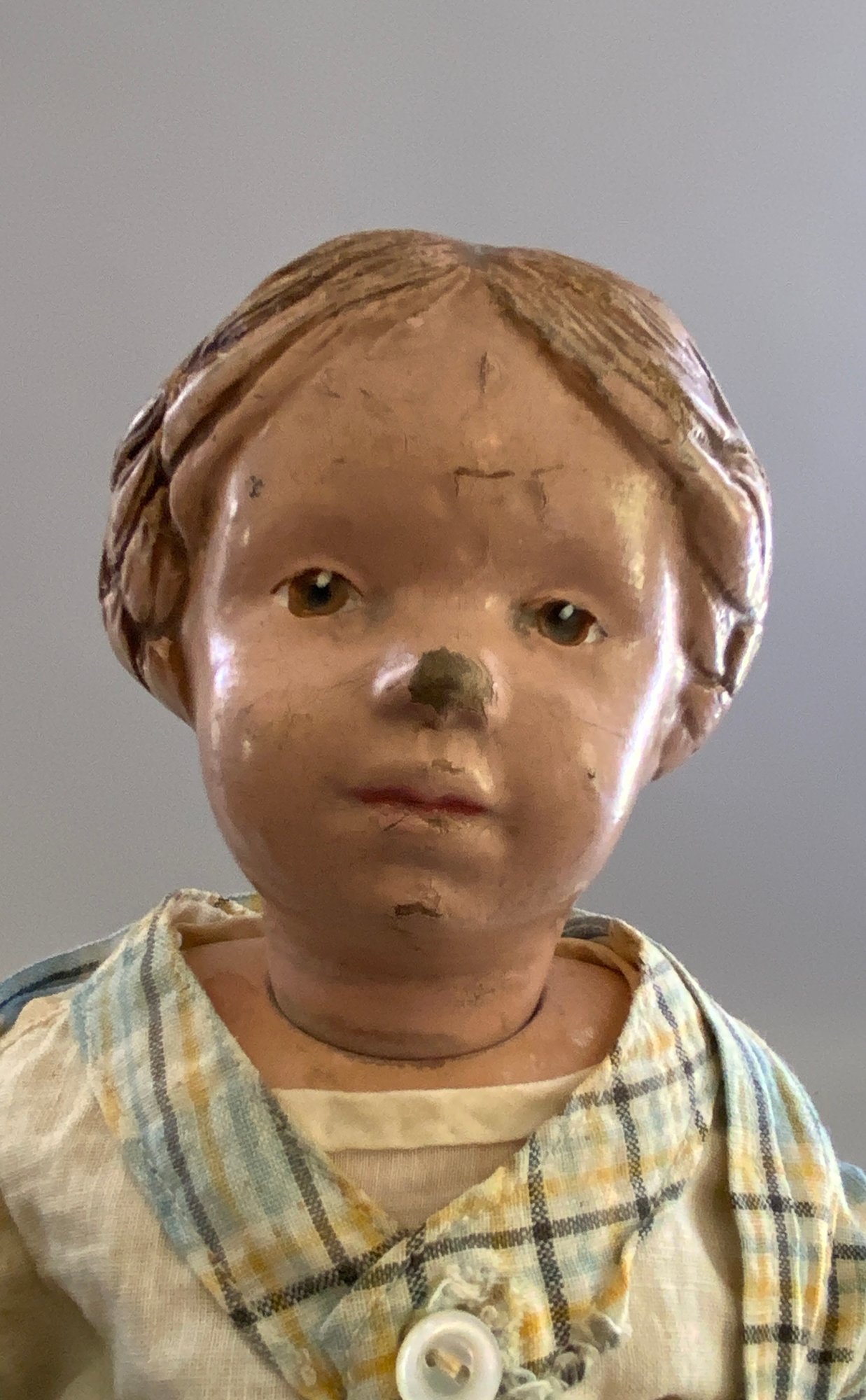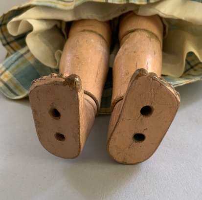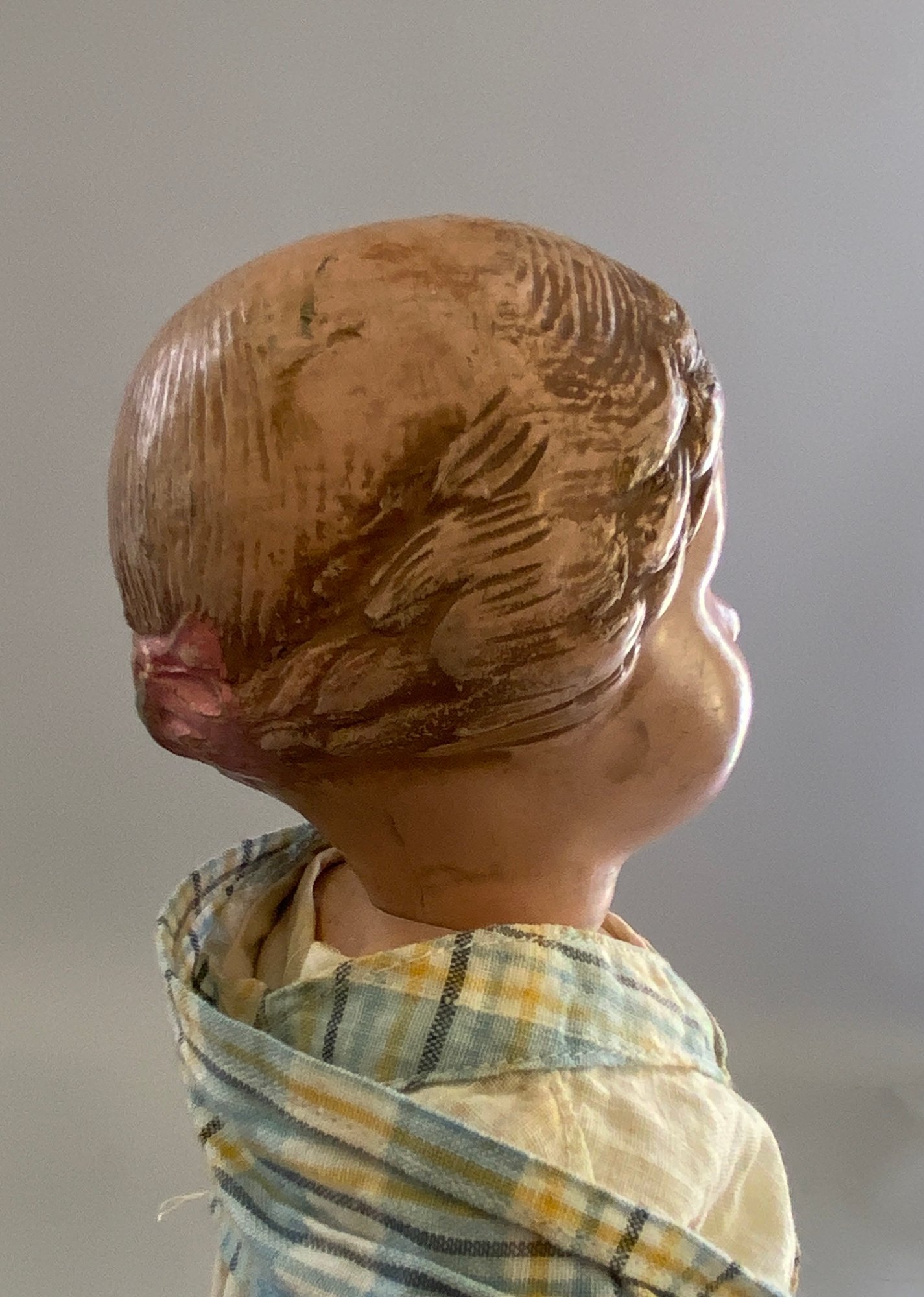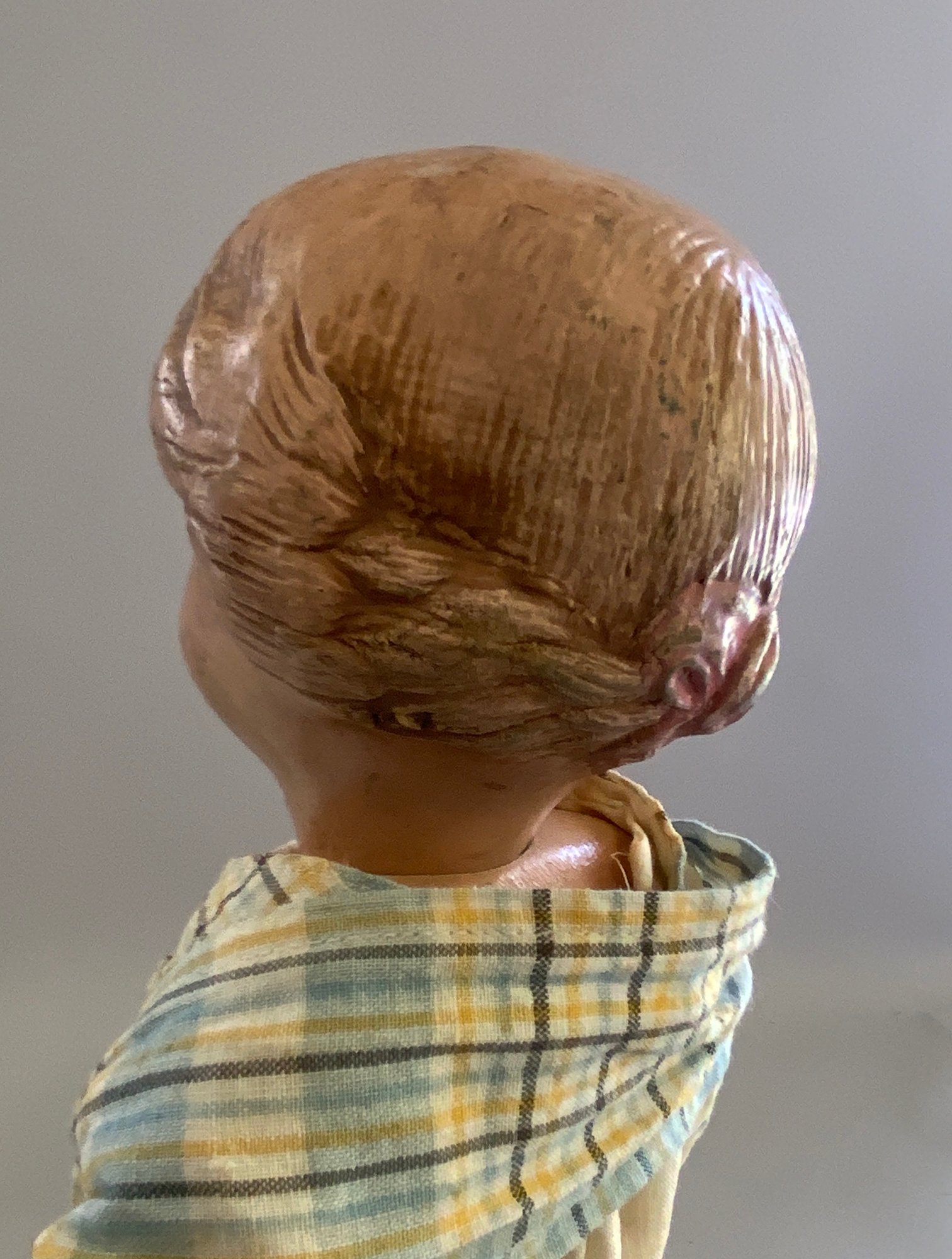 14” Schoenhut girl, painted features, center part sculpted hair with bow, incised mark, blue/yellow/white plaid outfit, (rubs & wear)