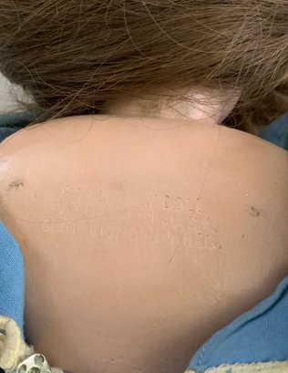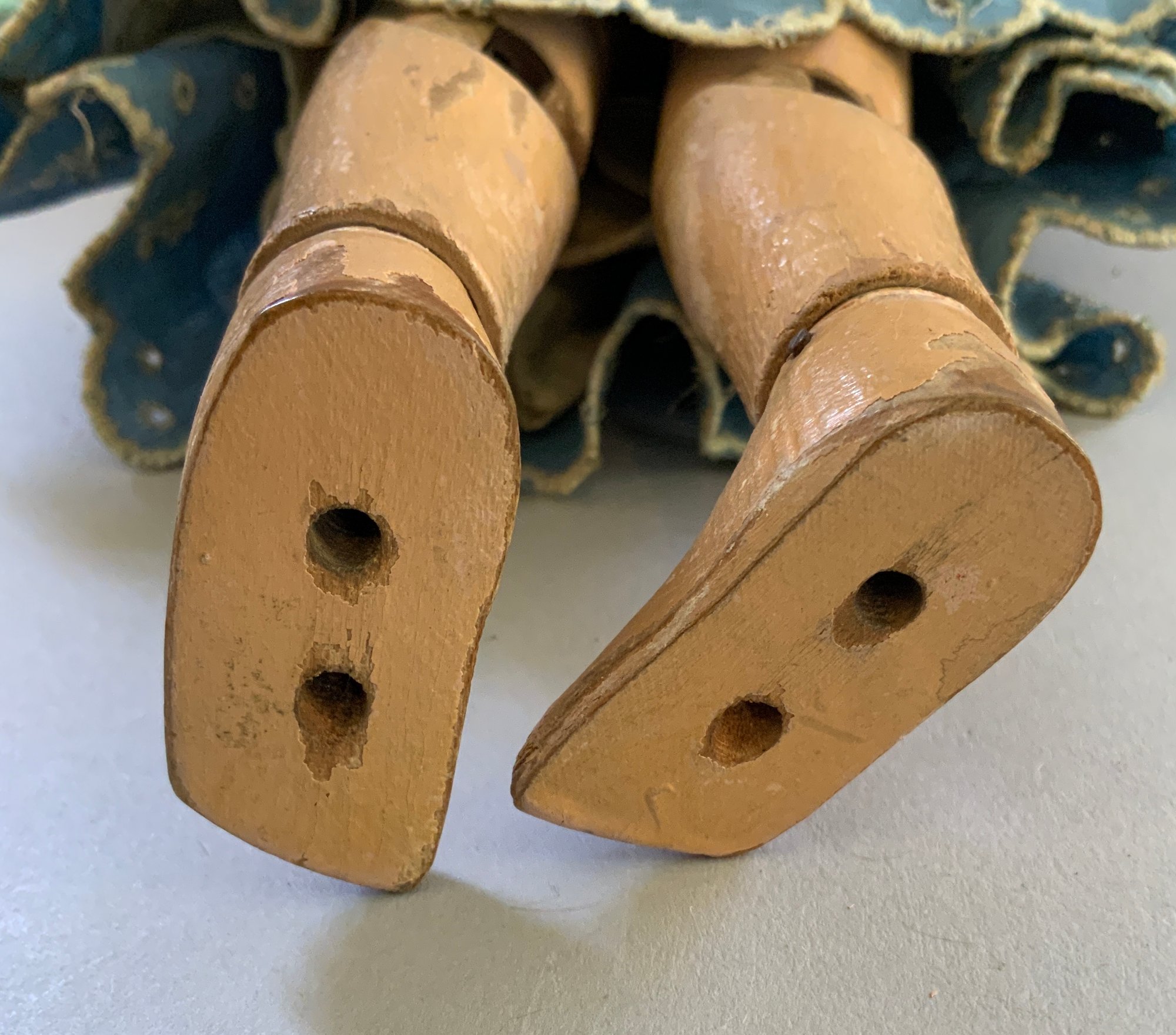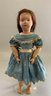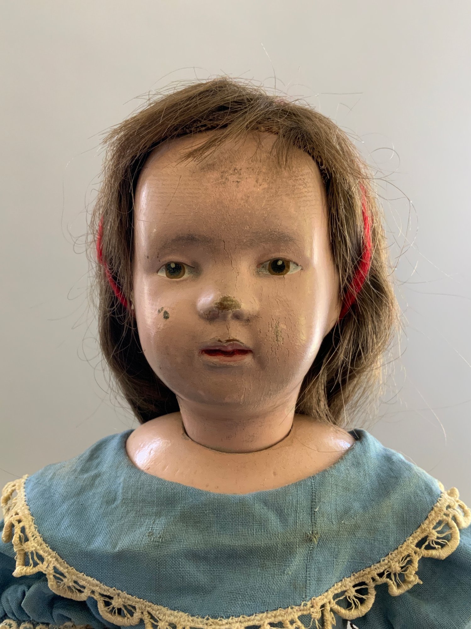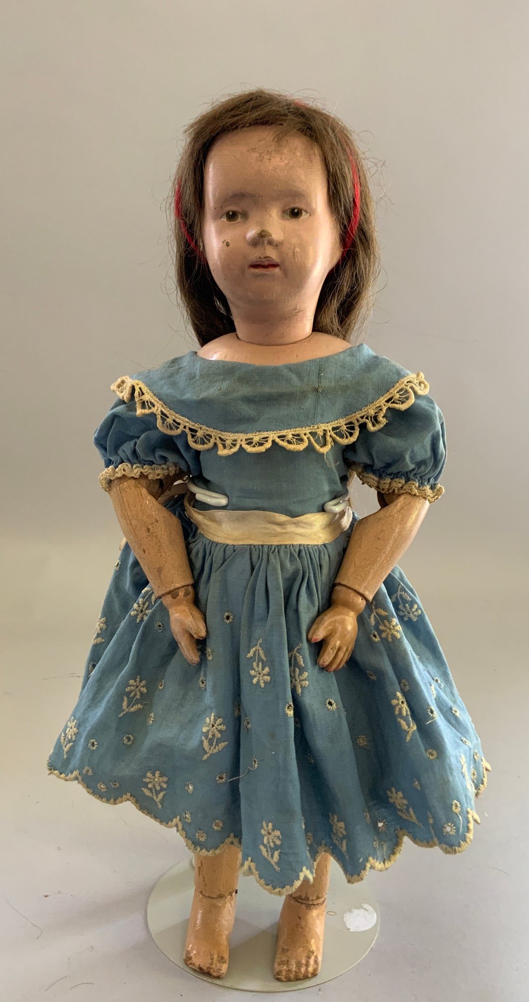 14” Schoenhut girl, painted features, brown mohair wig, incised mark, blue dress, (rubs & touchups)