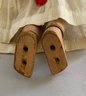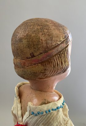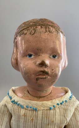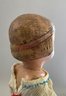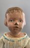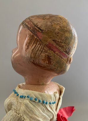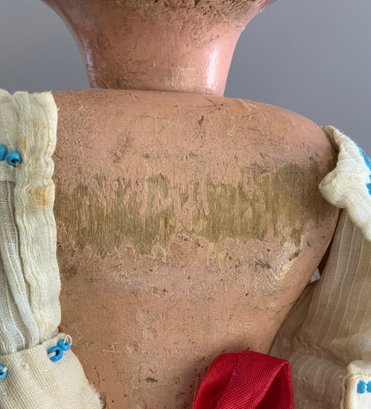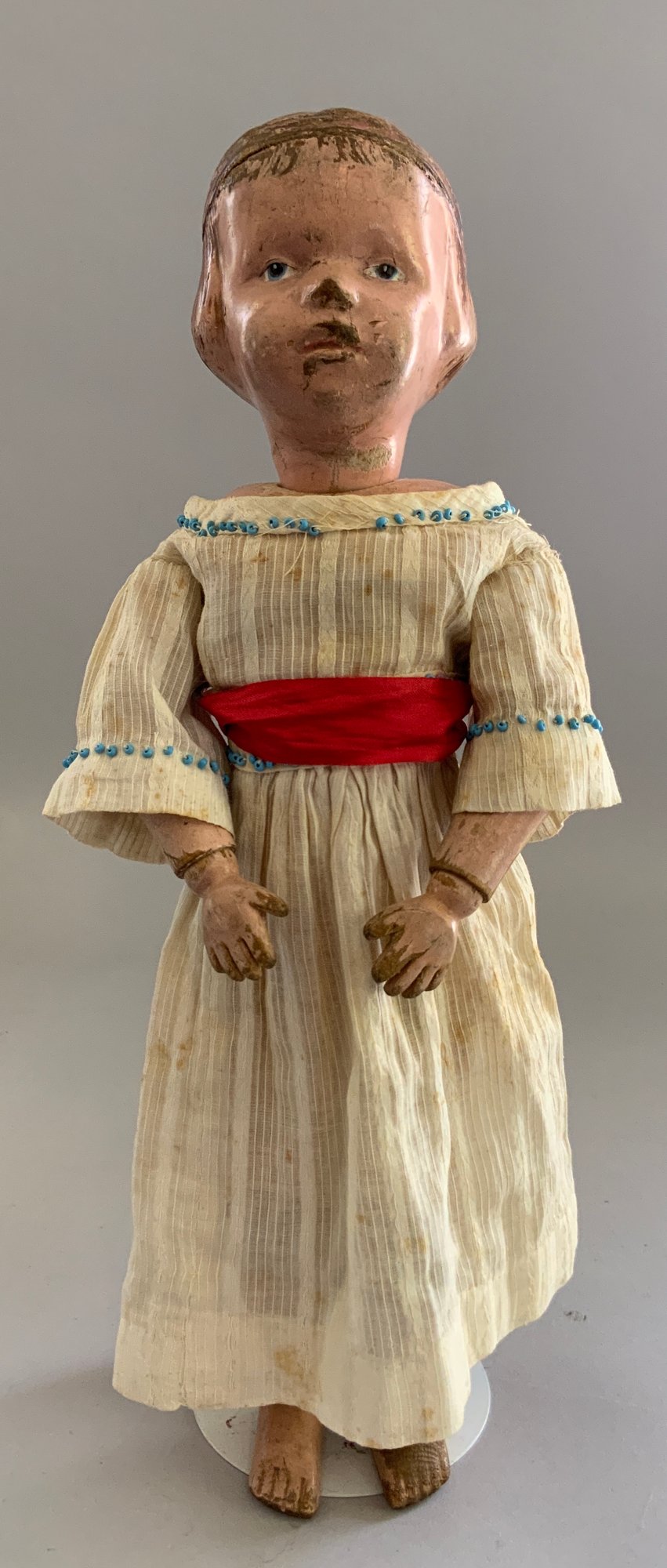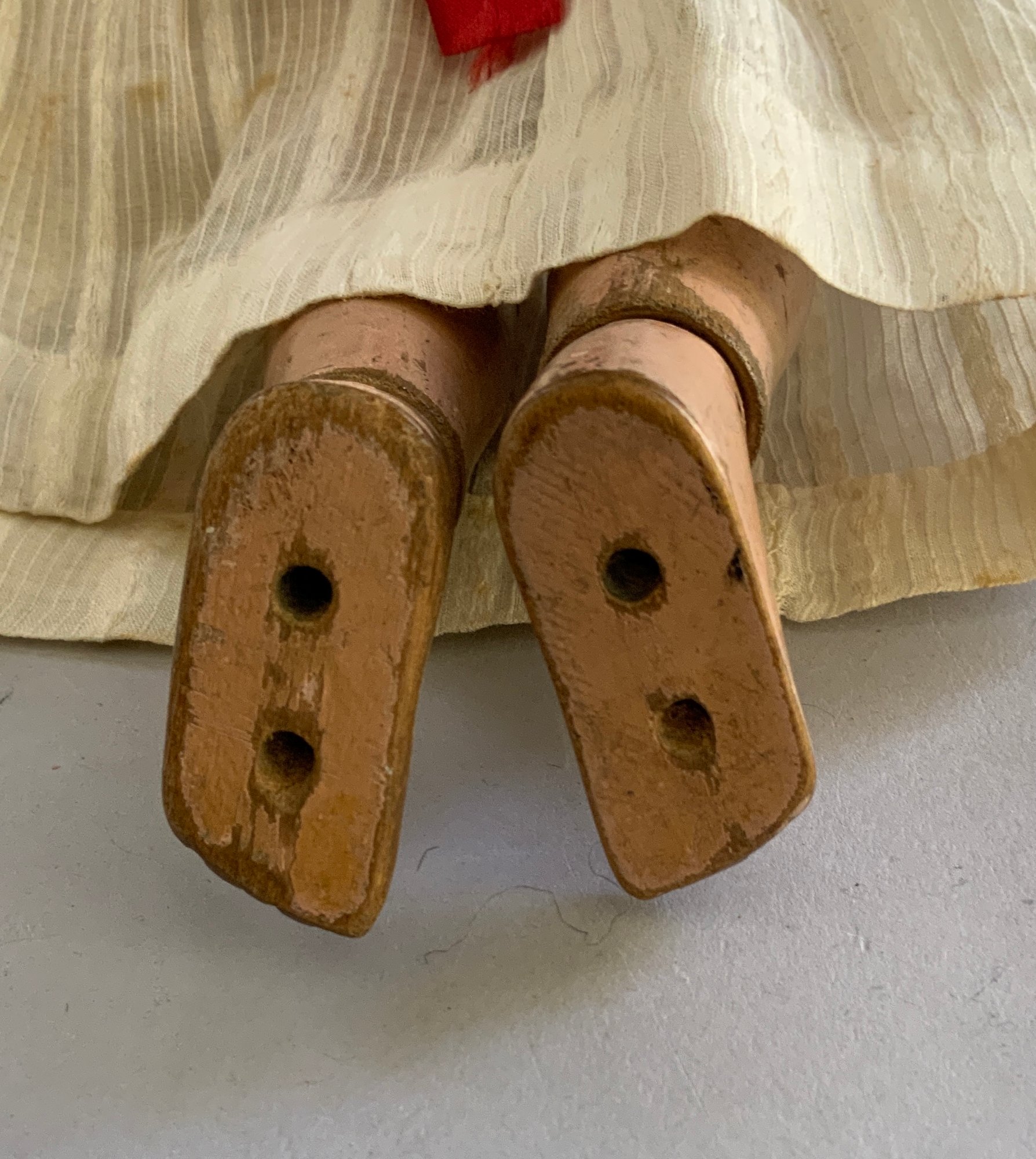 14” Schoenhut girl, painted features, sculpted hair with pink band, incised mark, white dress (fading stains), (rubs & crazing)
