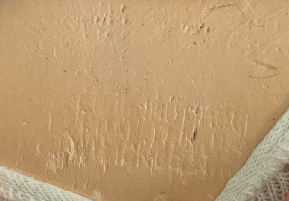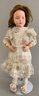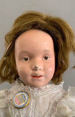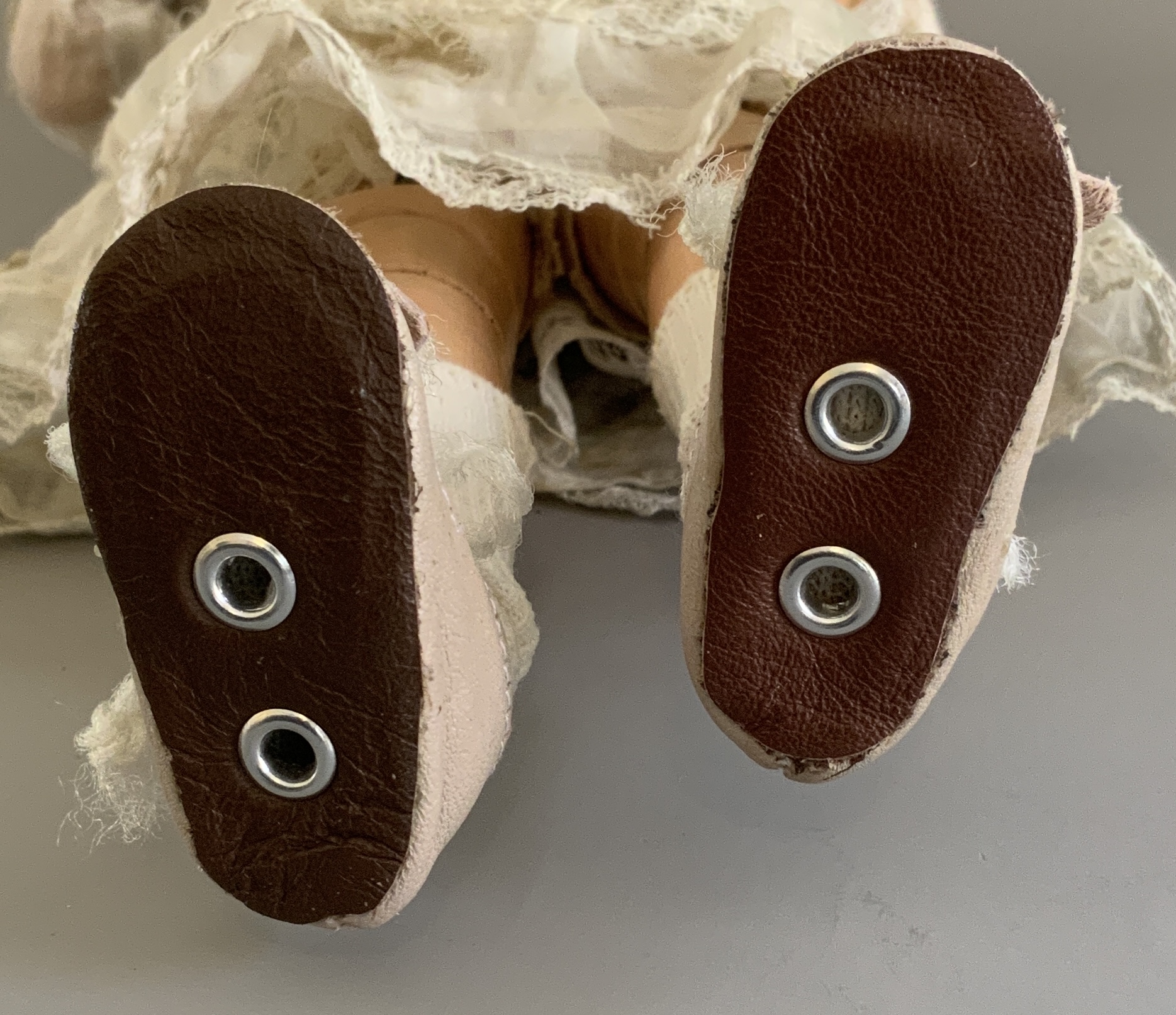 14” Schoenhut girl, painted features, brown mohair wig, white dress (faded tears, 2 hole gray shoes (nose & facial rubs)