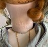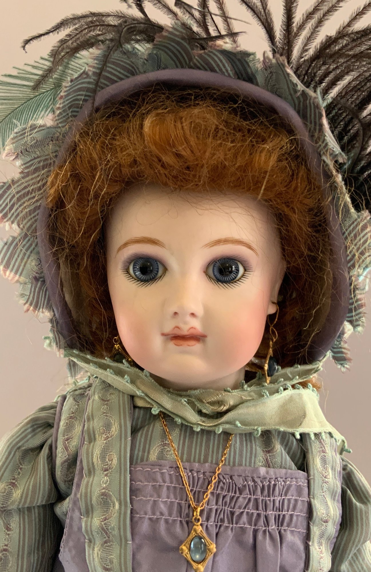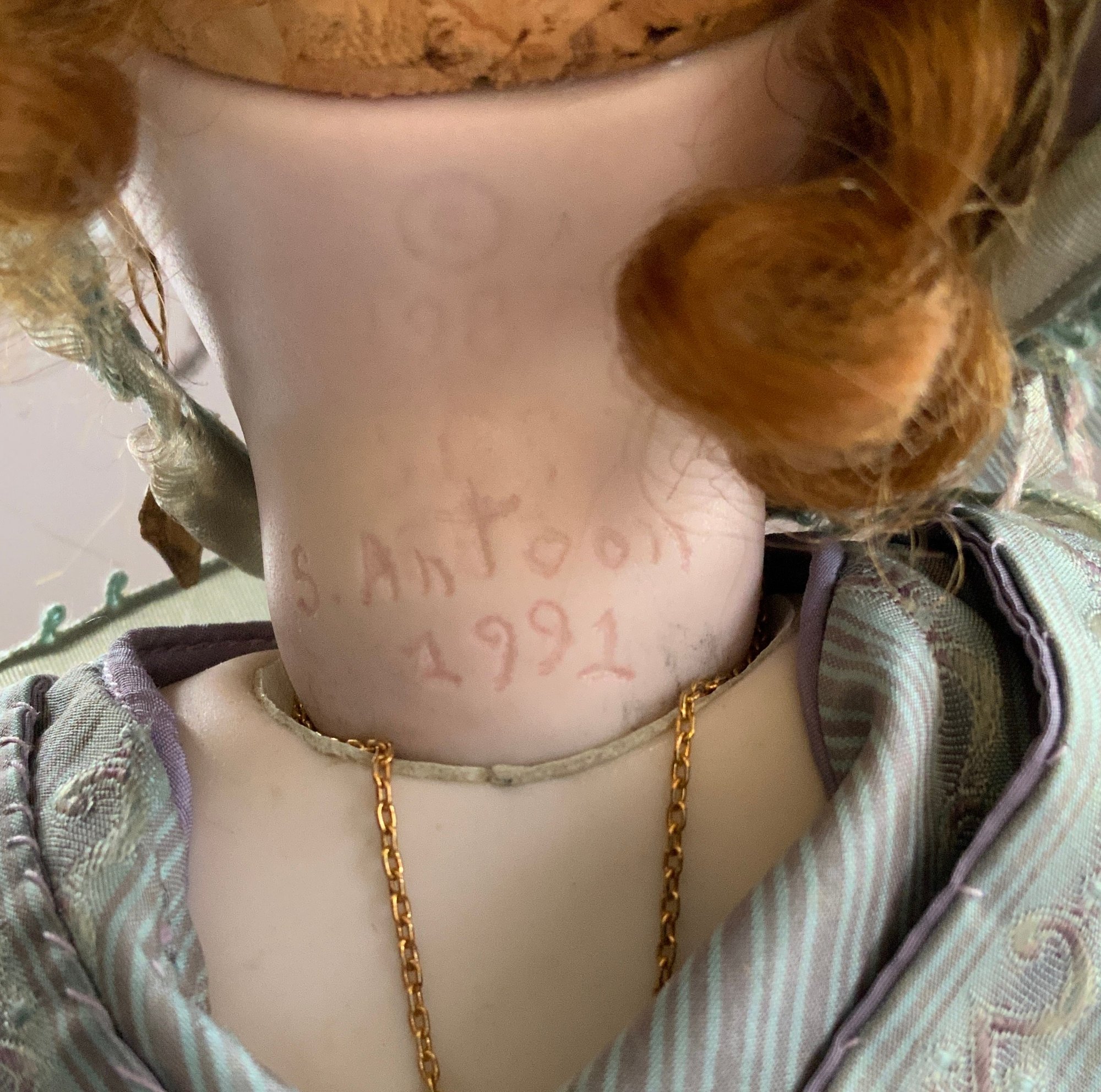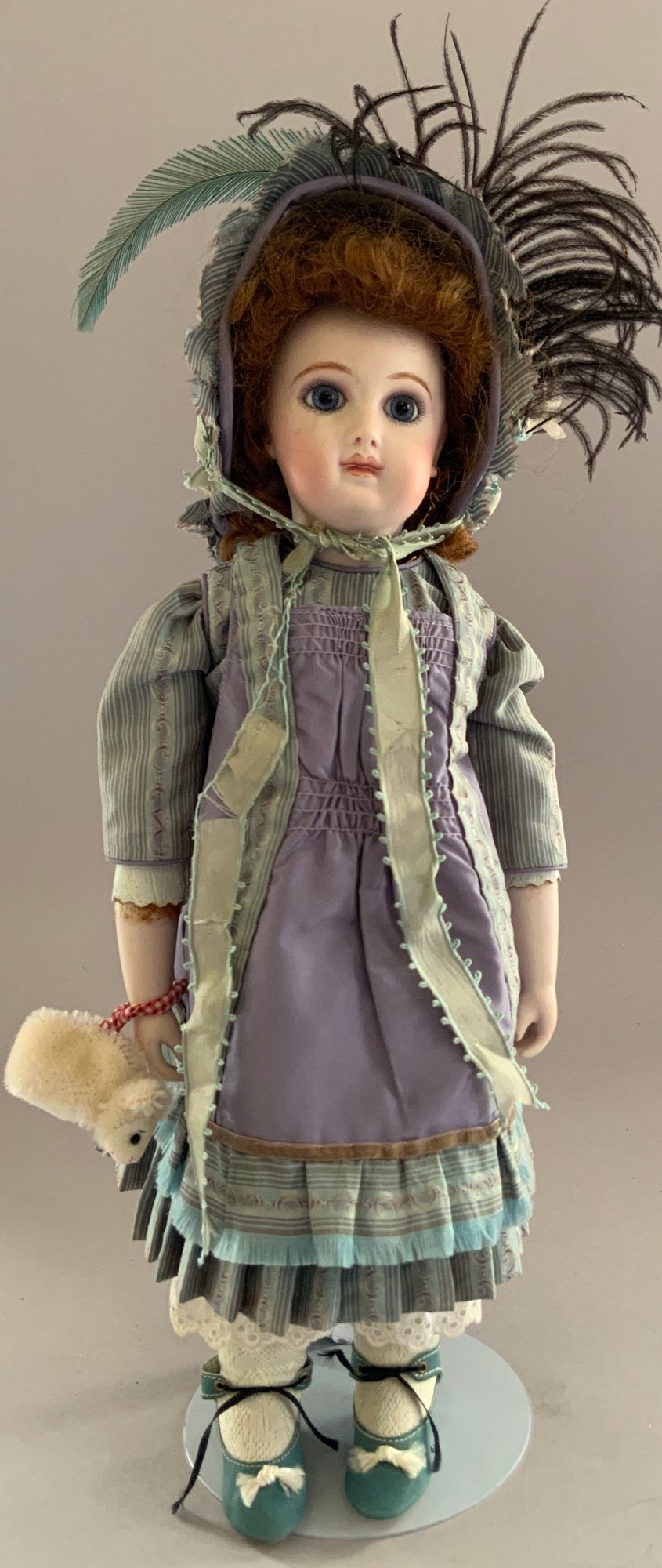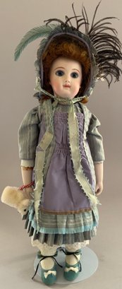 14” Shirley Antoon Bru artist doll 1992, blue glass eyes, CM, PE, brown mohair wig, kid body with bisque arms, blue/purple outfit, (glue marks right arm)