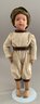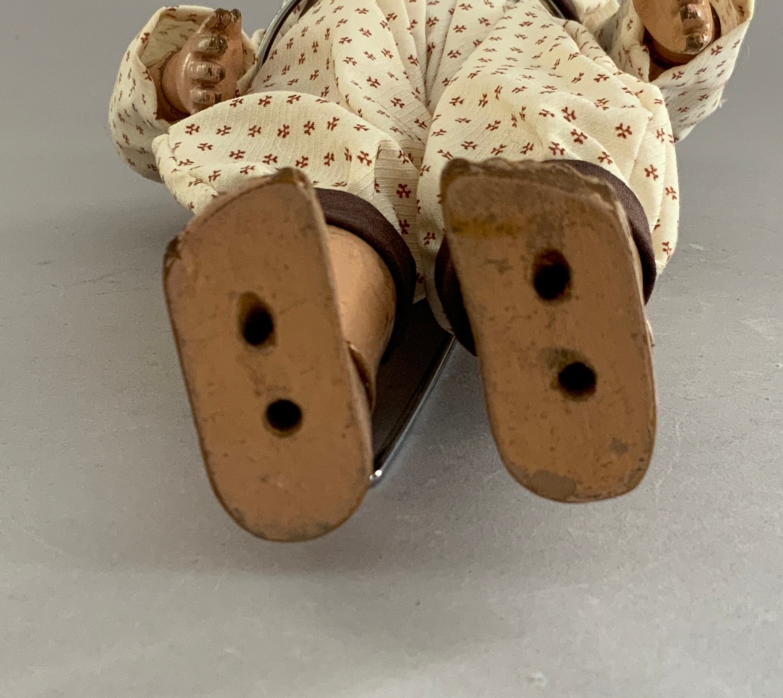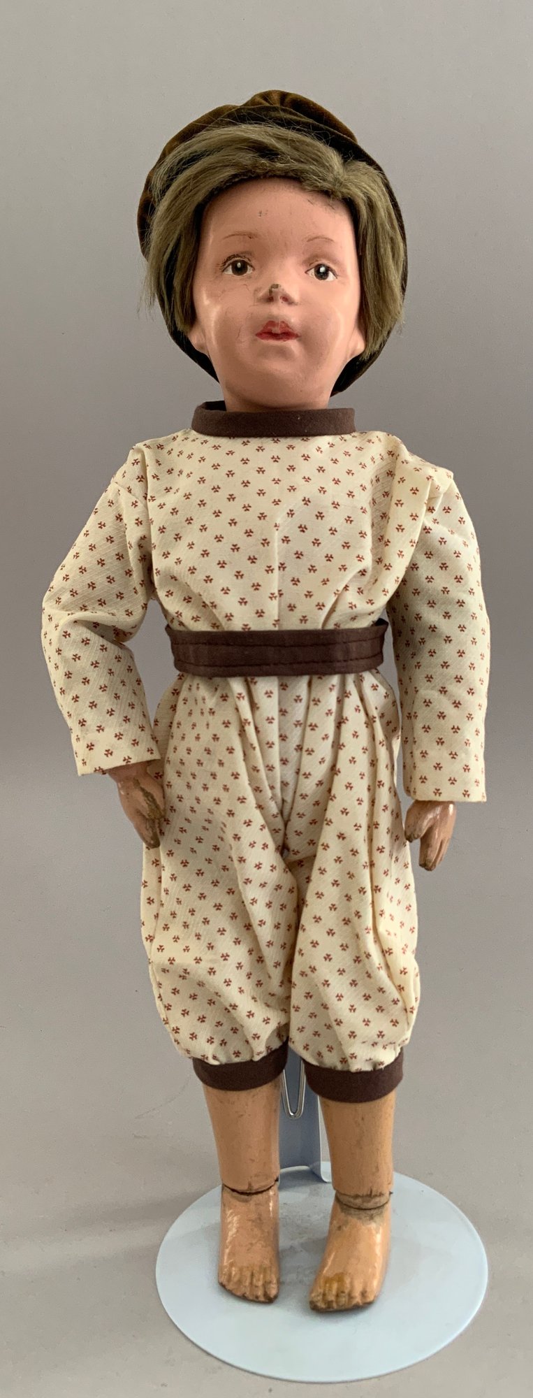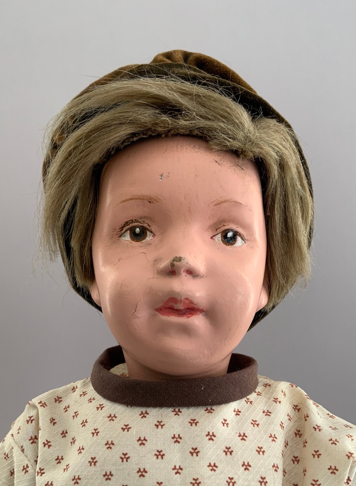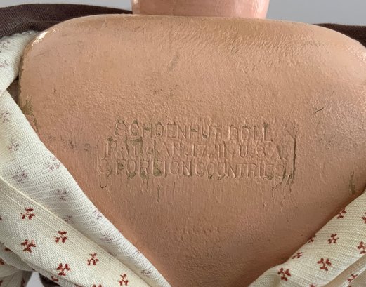 15 1/2" Schoenhut girl, painted features, blonde mohair wig, impressed mark, nose rubs, rough hands, white/brown pattern outfit