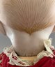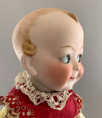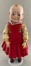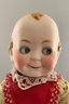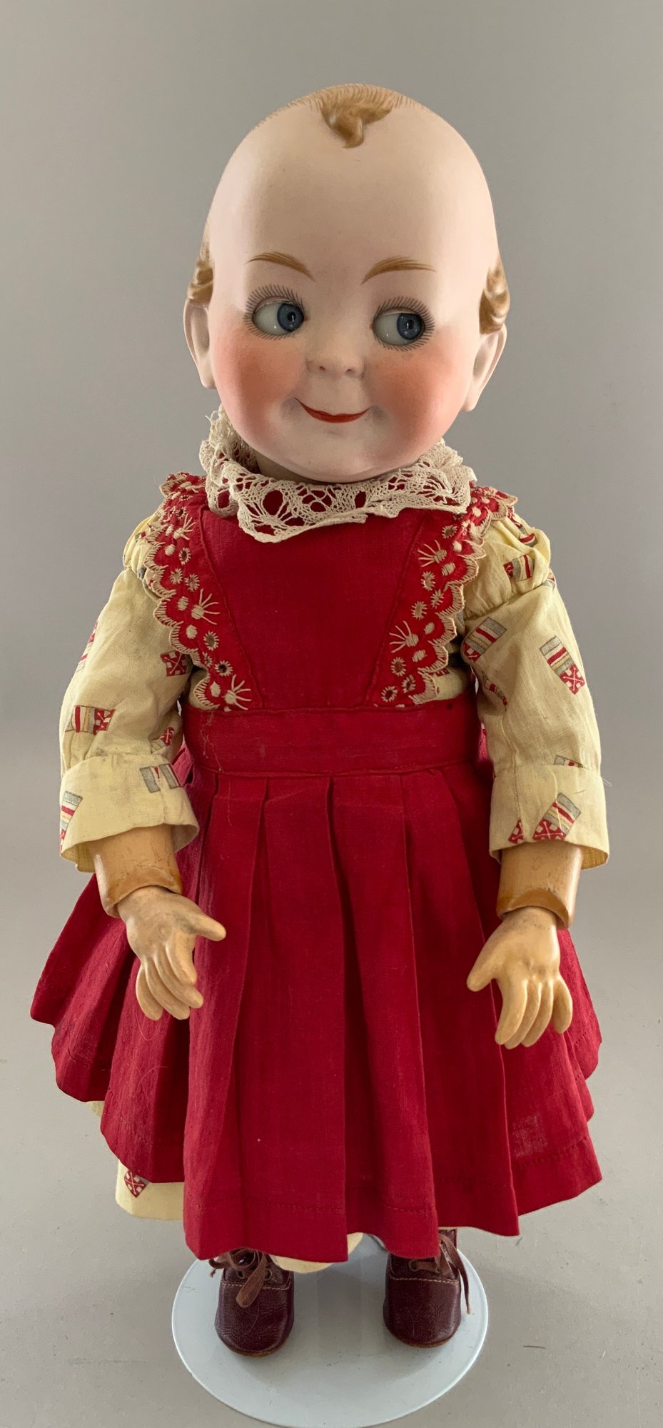 15 ½” Bisque Googly toddler incised 172-?, Hertel & Schwab & Co, left glancing blue glass Googly eyes, watermelon mouth, molded blonde painted hair, compo body, red & white outfit, red leather boots (in making mold line back of head. Tiny rub under left eye), a great example