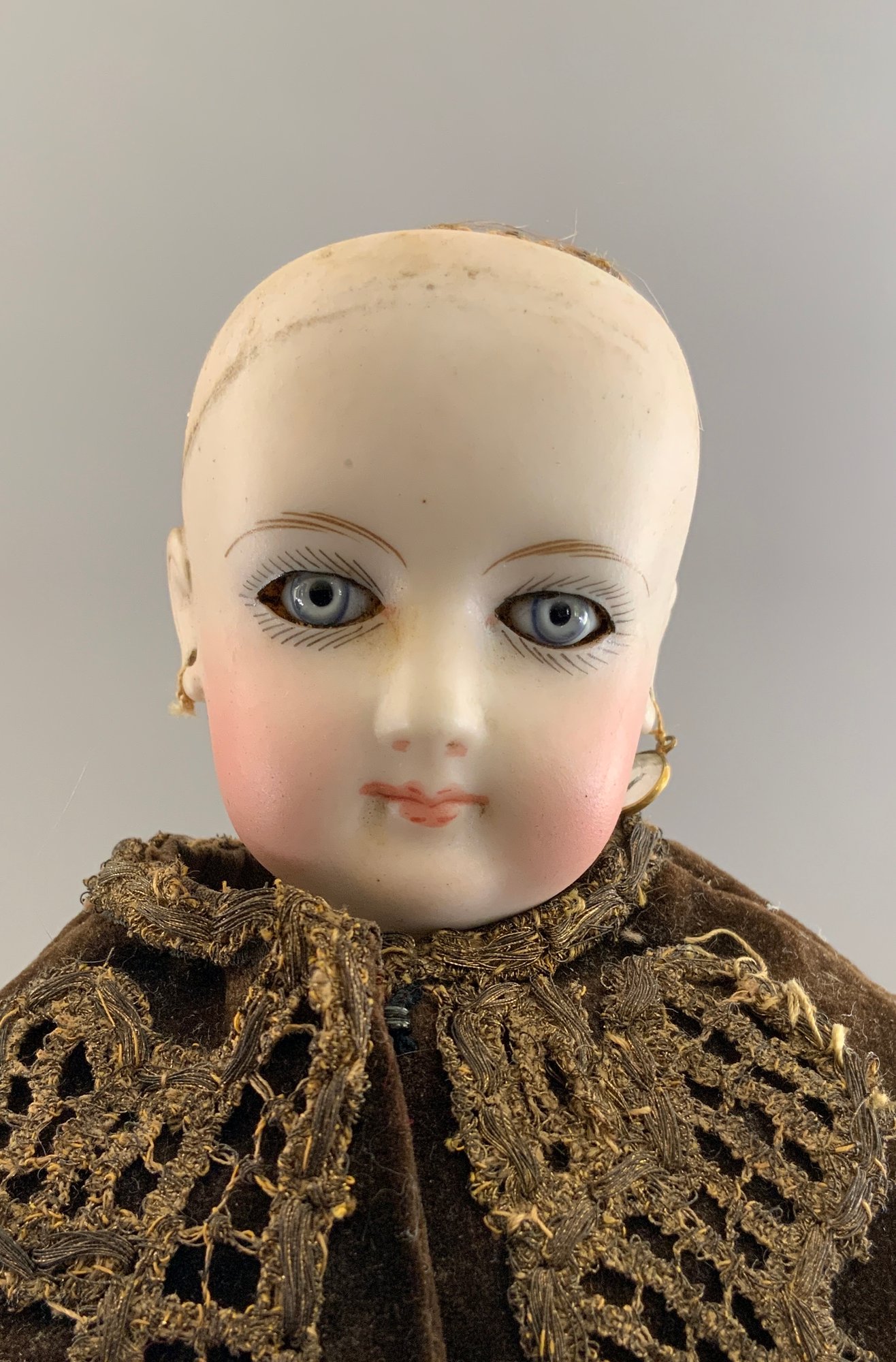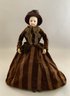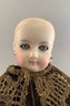 15” French Fashion incised 1, blue glass eyes, CM, PE, no wig, kid body, brown velvet stripe walking dress