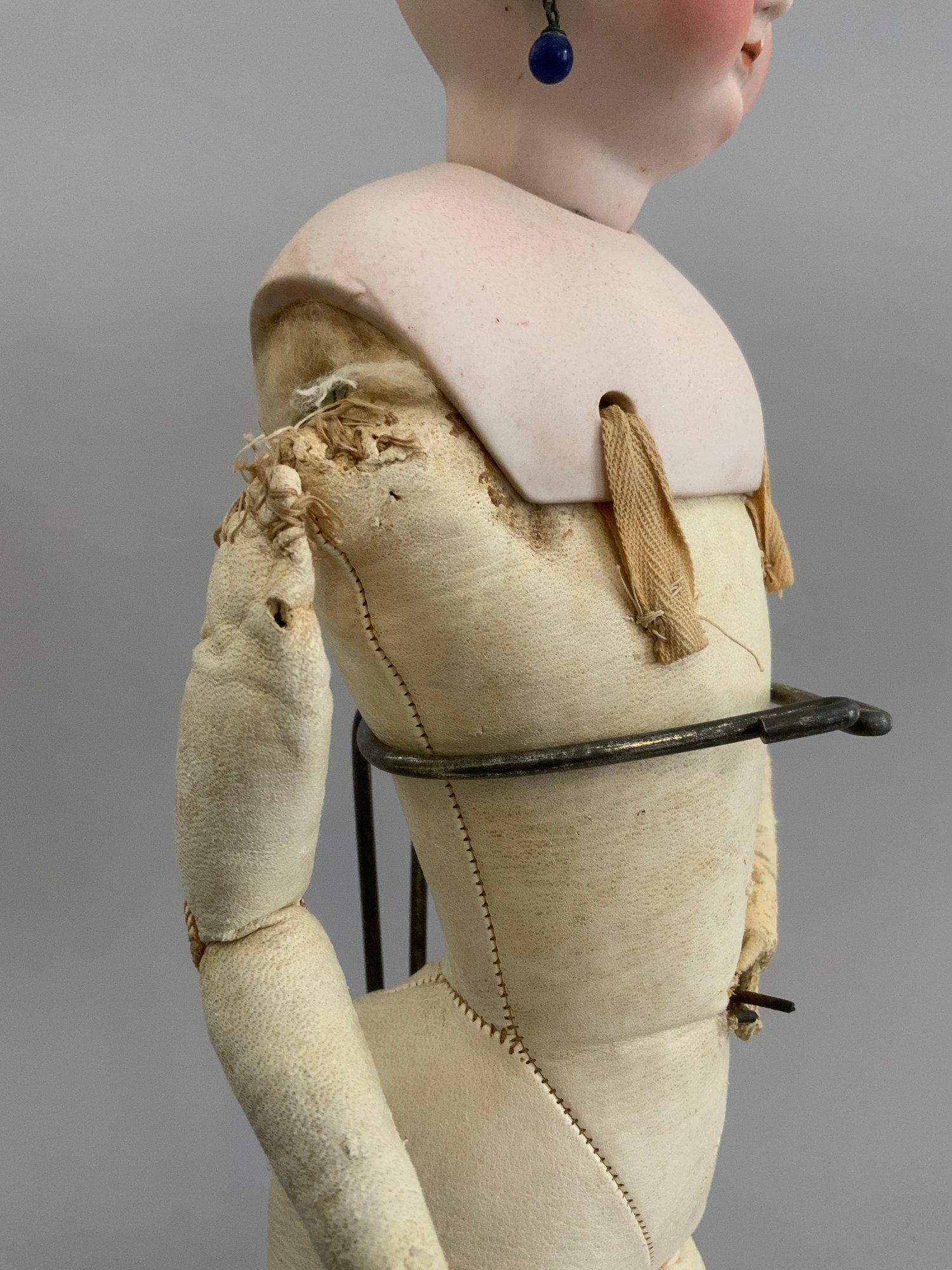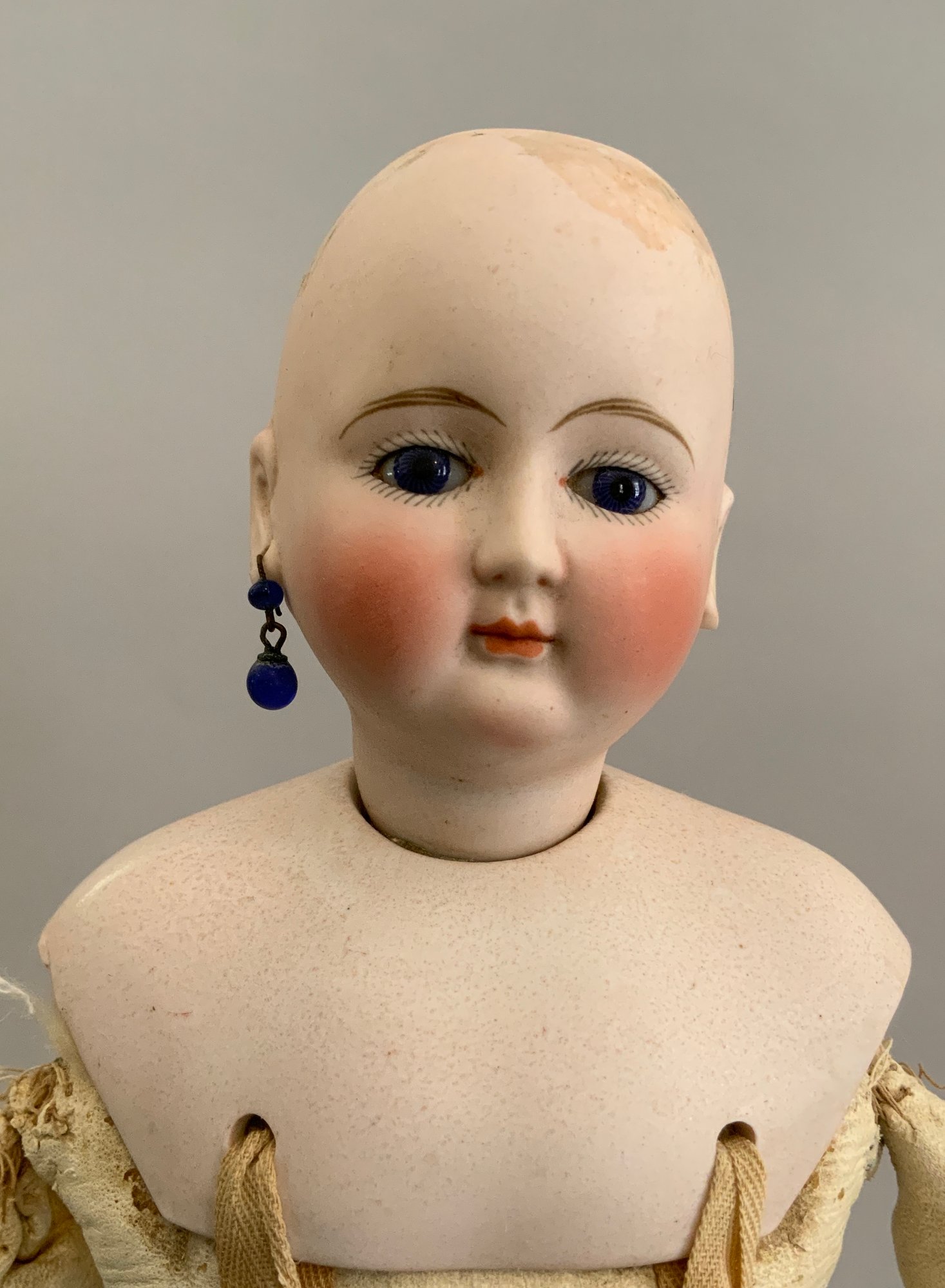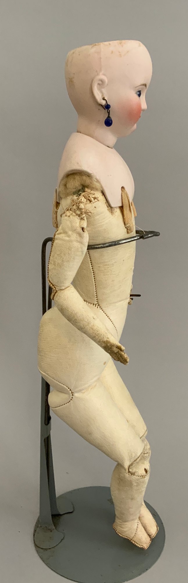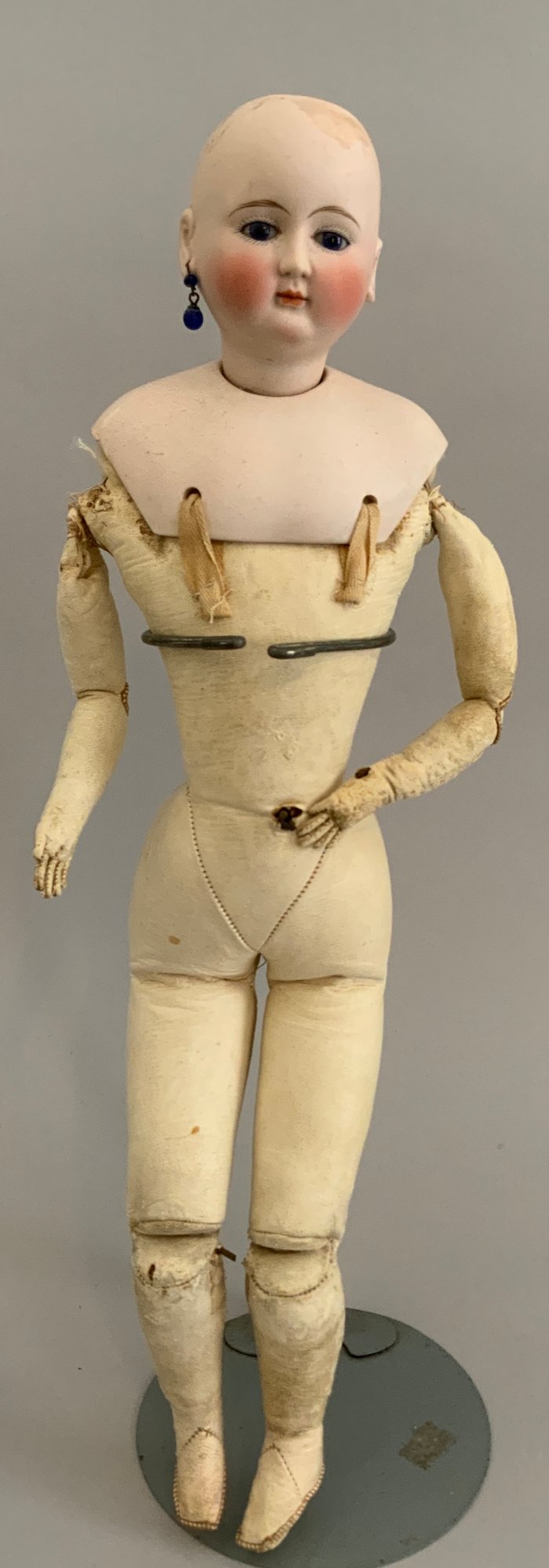 15” French Fashion swivel neck, blue glass eyes, CM, PE, no wig, kid body (as is), no clothes, excessive wig glue