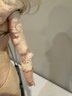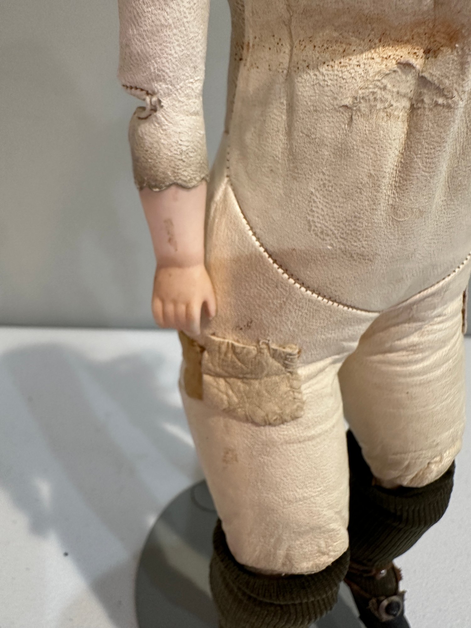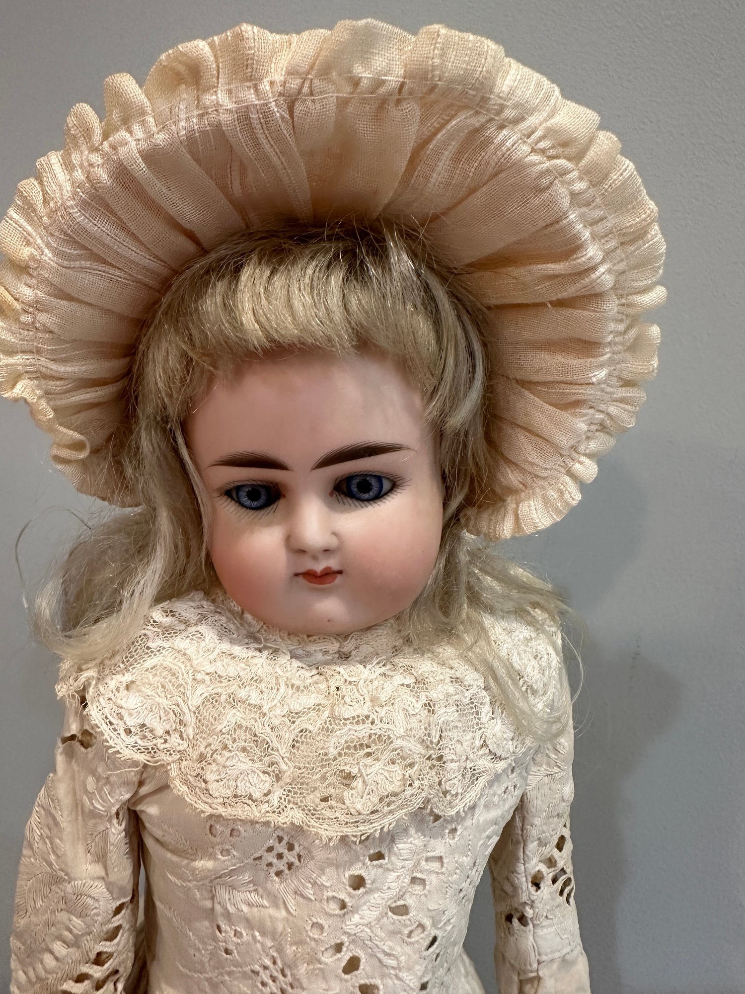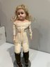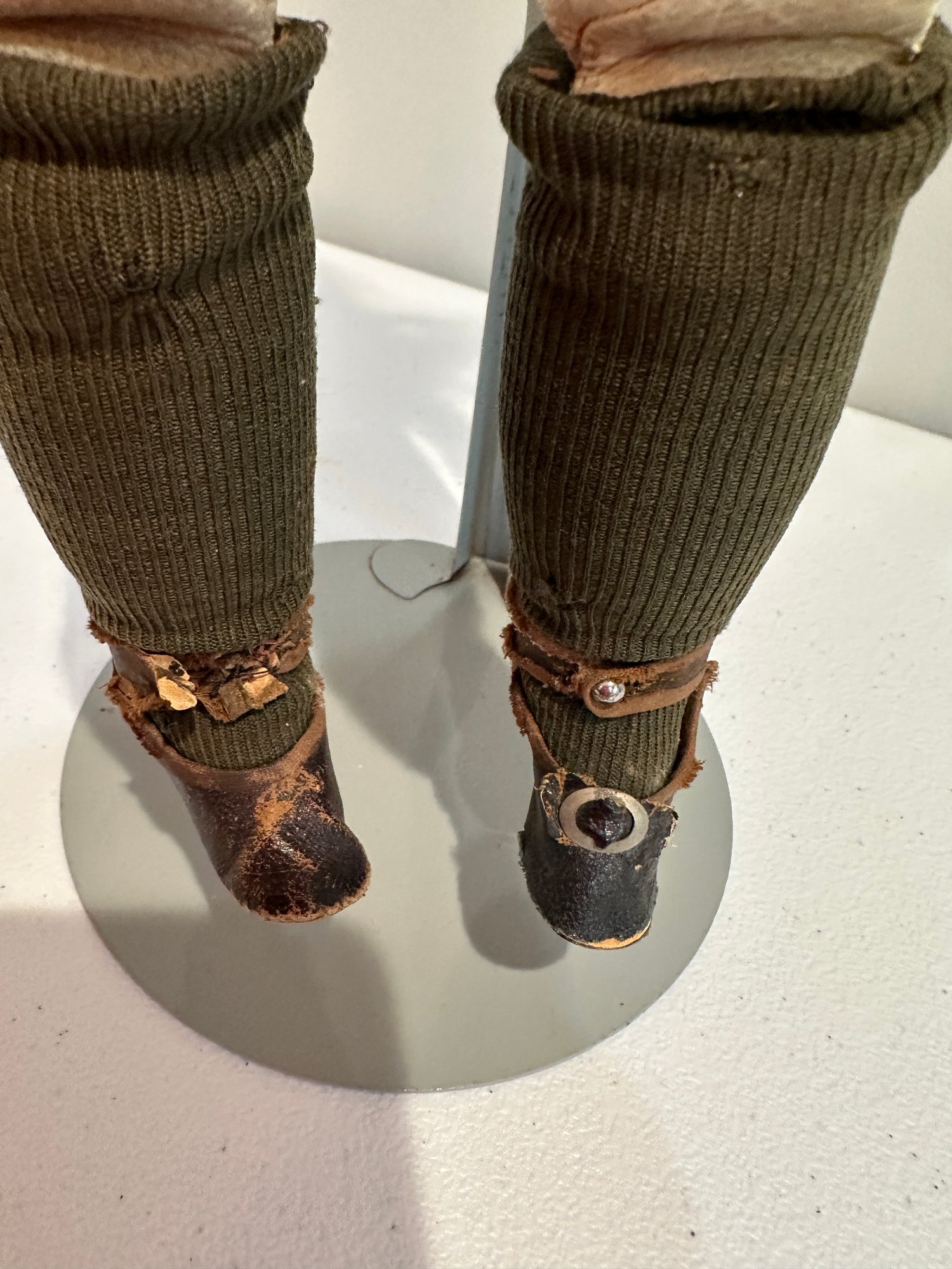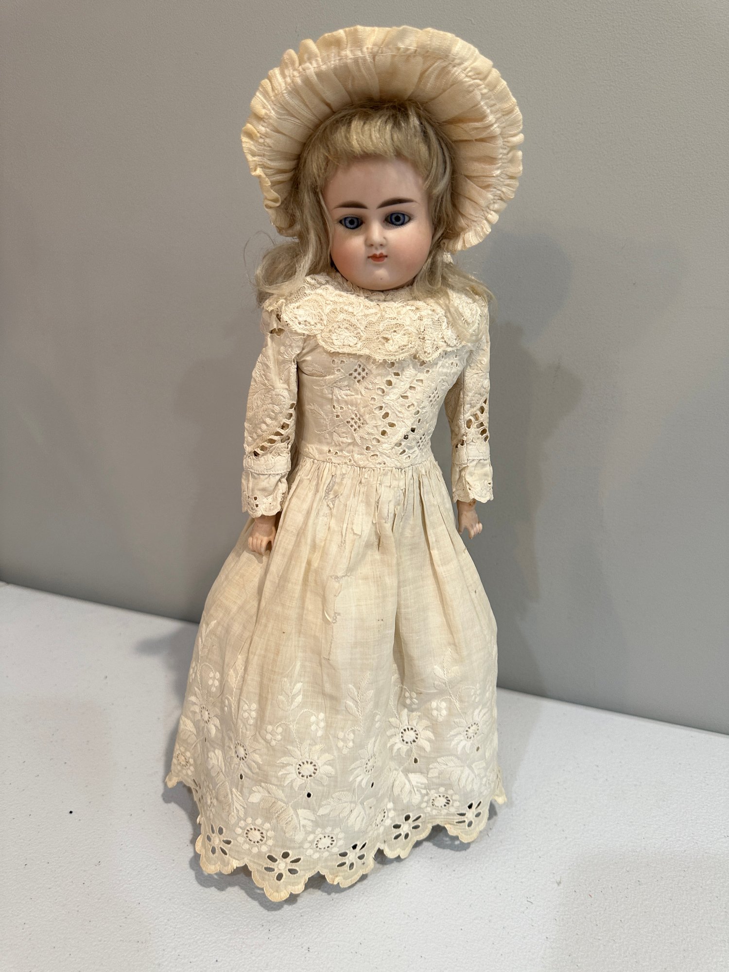 15” German turned head, blue eyes, dome head, antique costume and shoes, original blonde mohair wig, patches to leather body, left arm needs repair
