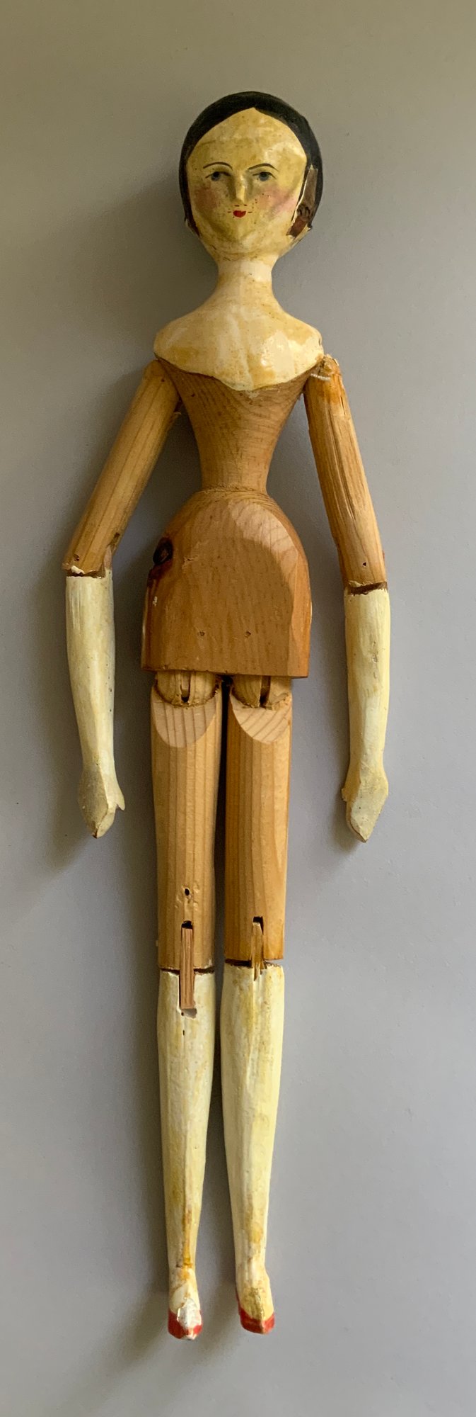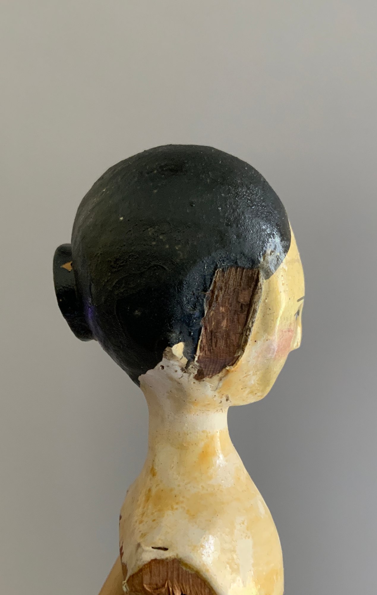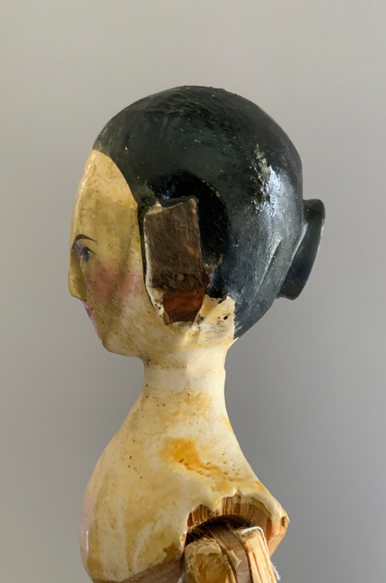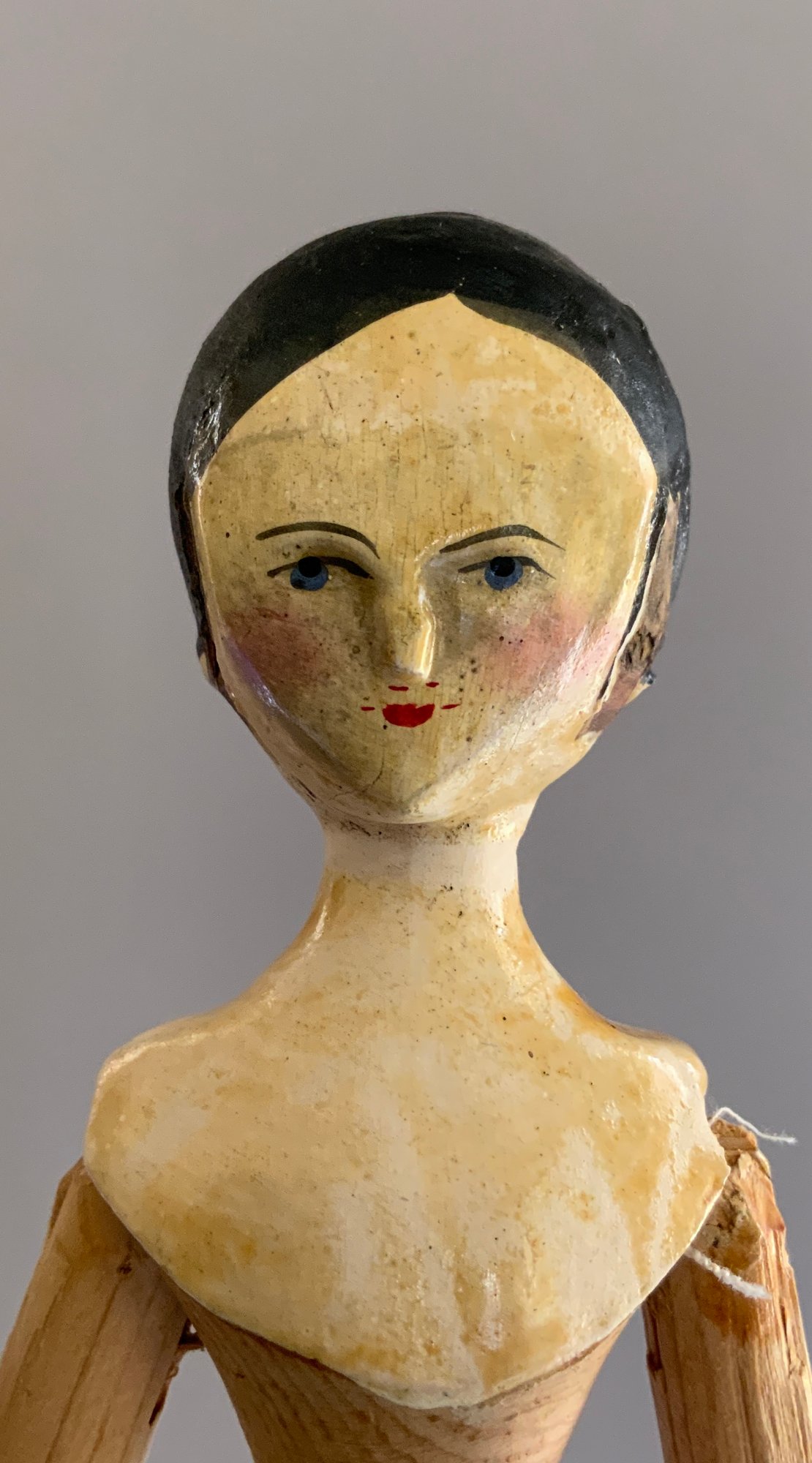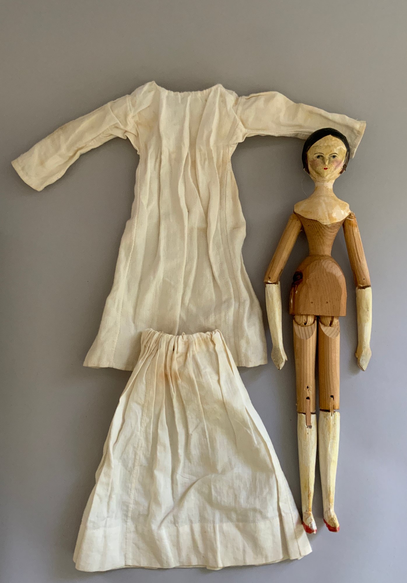 15” Grodnertal peg wooden doll, painted features, (paint touchups & repairs to body, (1 leg detached), white outfit