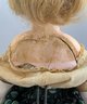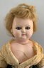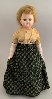 15” Wax over compo, S/H (major cracks on back of shoulder plate), c/m, sleep blue eyes, blonde wig, cloth body, wax-over arms, painted white boots, wearing skirt of green silk, & lace-trimmed blouse, P/E