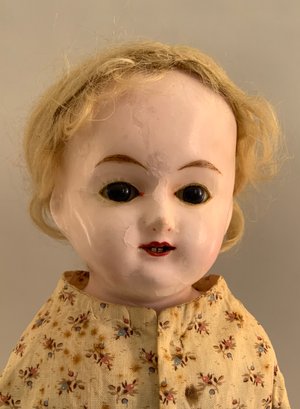 15” Wax over compo S/H doll mohair wig (as-is), sleep eyes, o/m w/ teeth, old cloth body, no shoes, wax over compo arms, wears calico print dress,