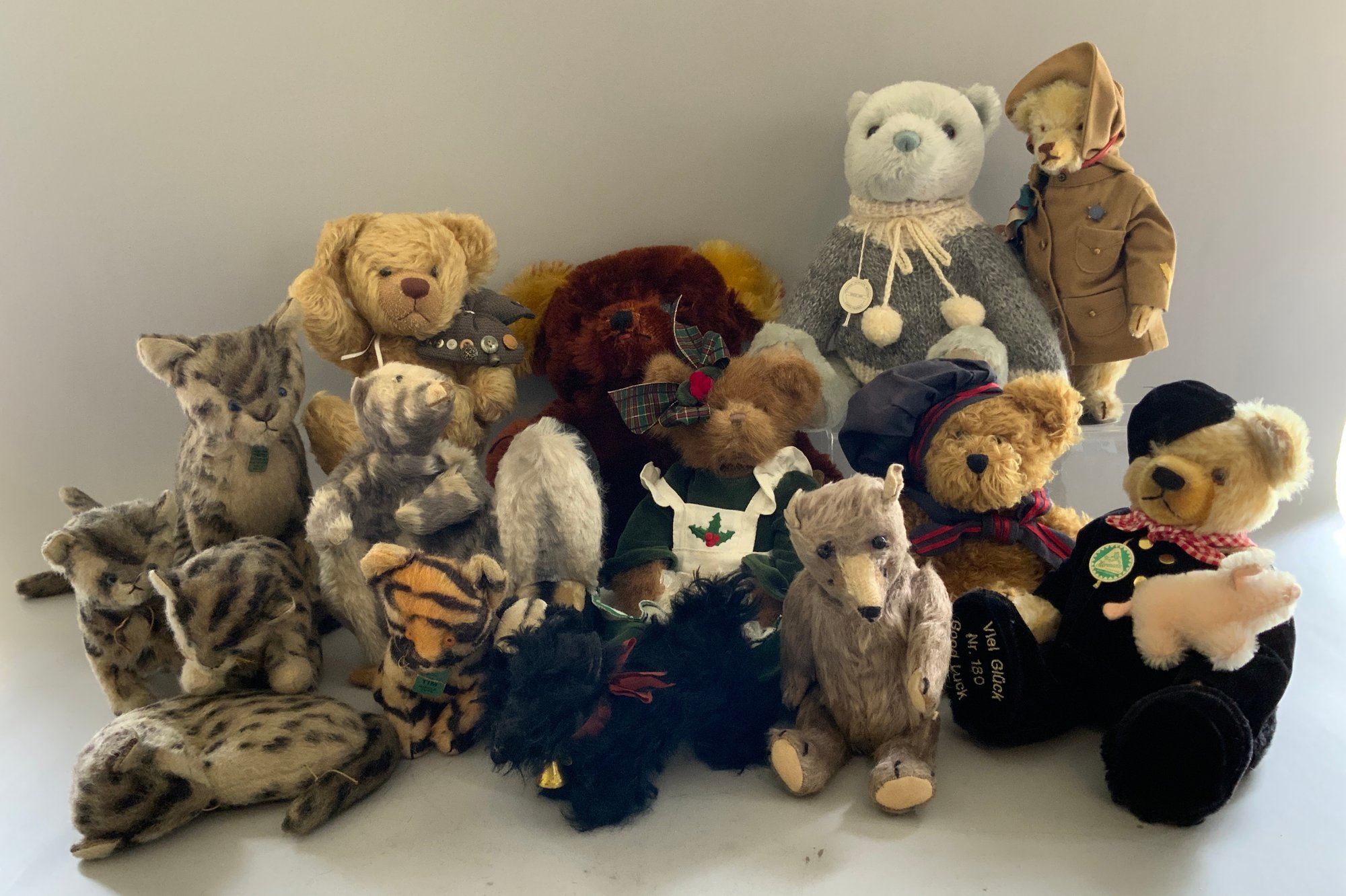 16 - assorted stuffed animals, 5 – Jungle toy cats, teddy bears, hand puppet, etc.