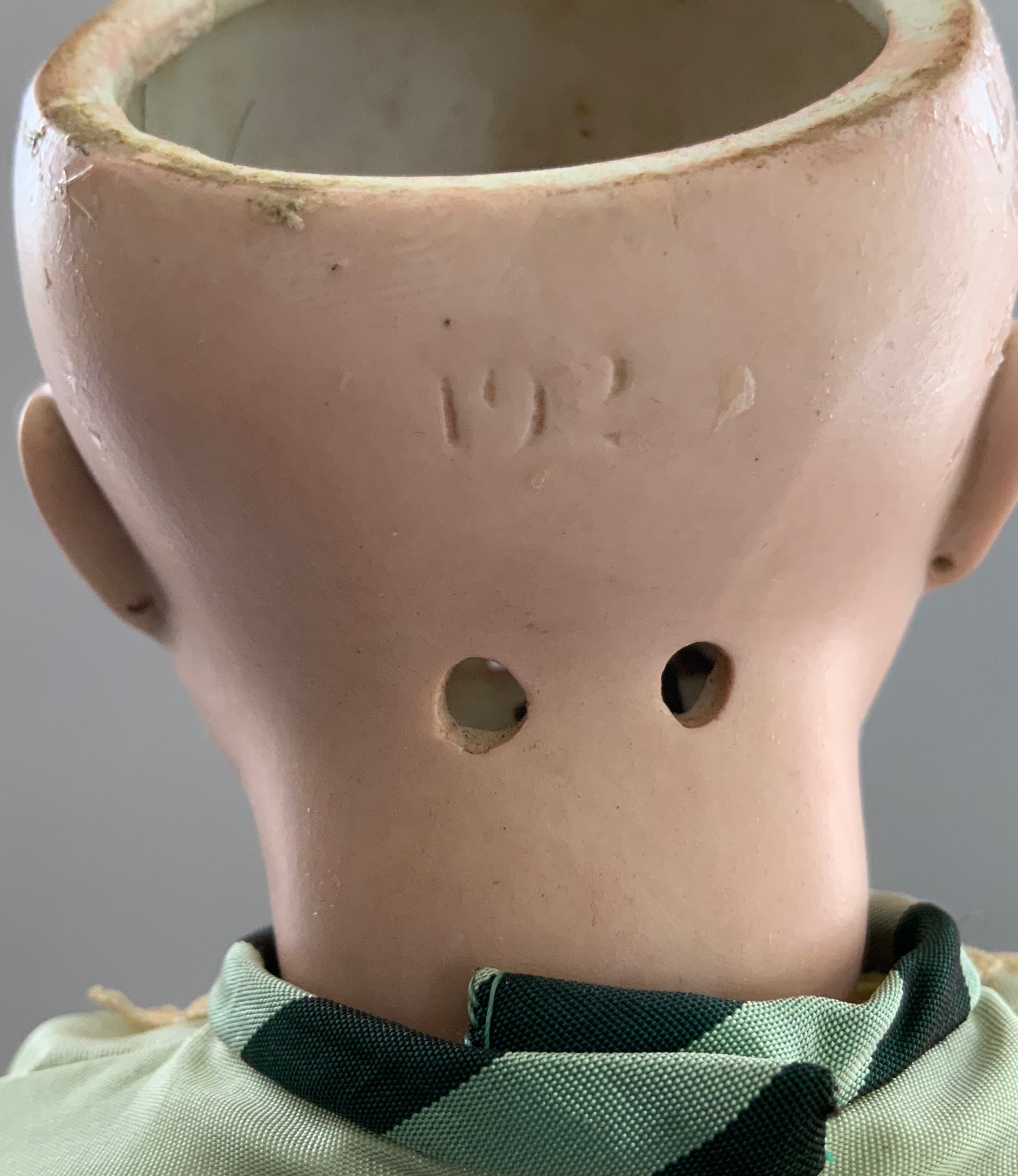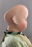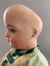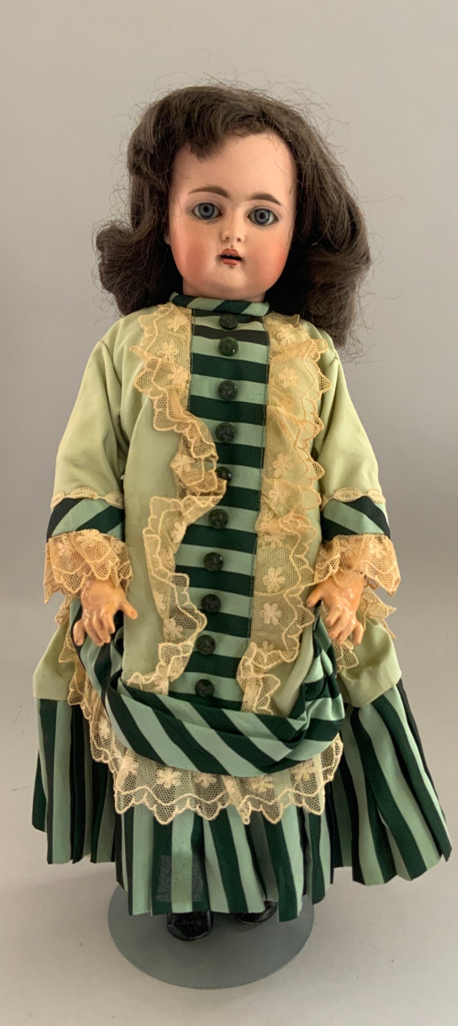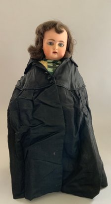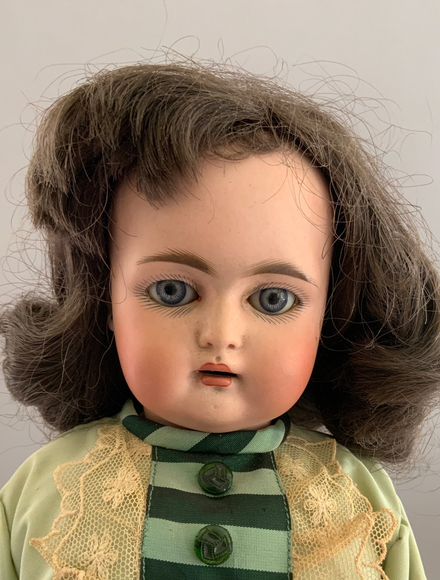 16” Bisque 192 child doll, blue glass sleep eyes, OM with teeth, PE (nicks), brown mohair wig, BJCB, green dress with black overcoat (melting)