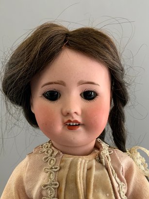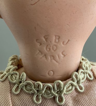 16” Bisque SFBJ 60 Paris 0, brown glass sleep eyes, OM with teeth, brown HH wig, BJCB, pale peach silk & lace outfit (stains)