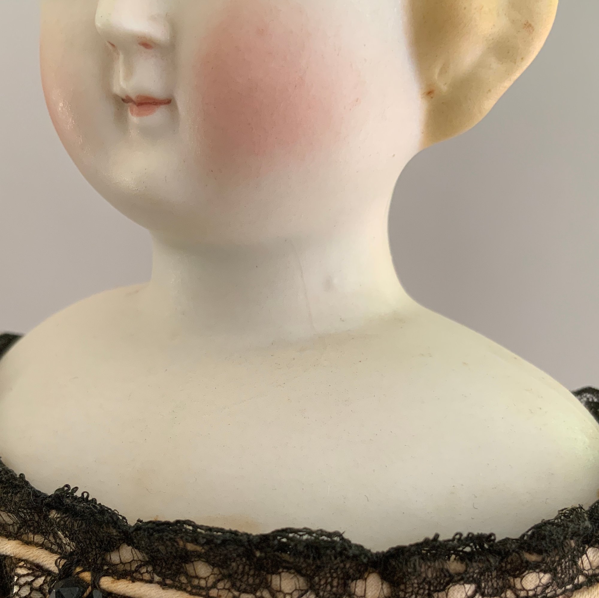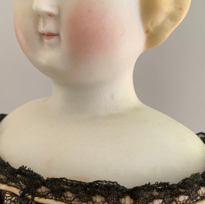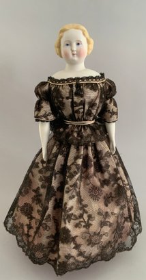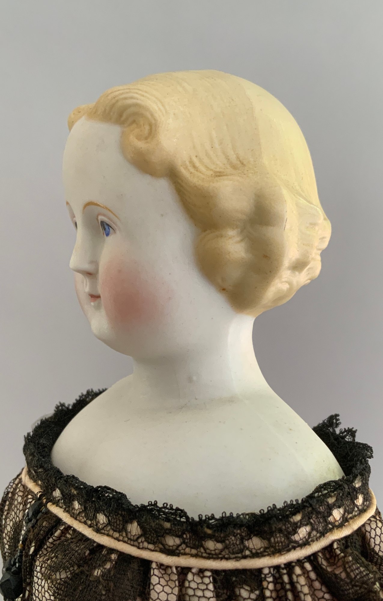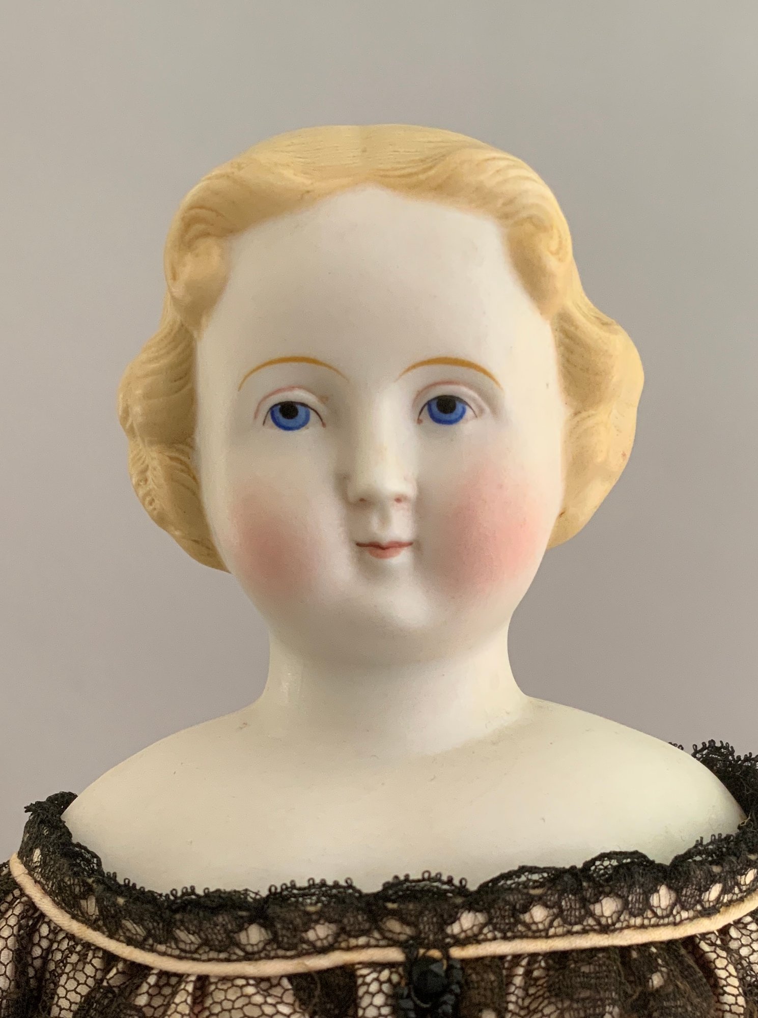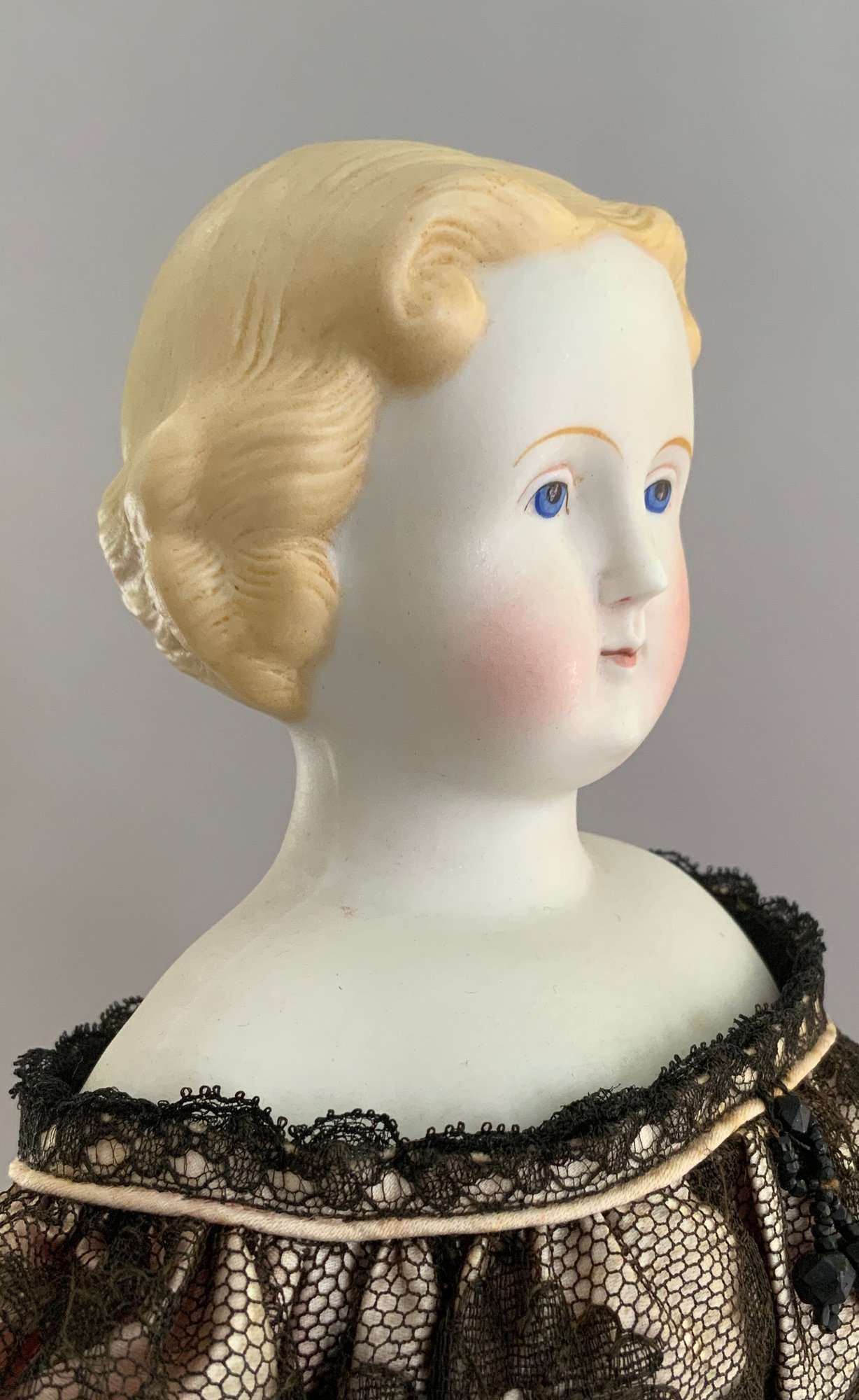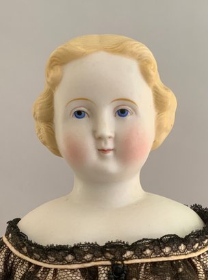 16 ½” Blonde hair Parian SH, painted features, sculpted blonde hair, cloth body with Parian limbs, black lace dress (very faint hairline front left shoulder plate/chin)