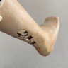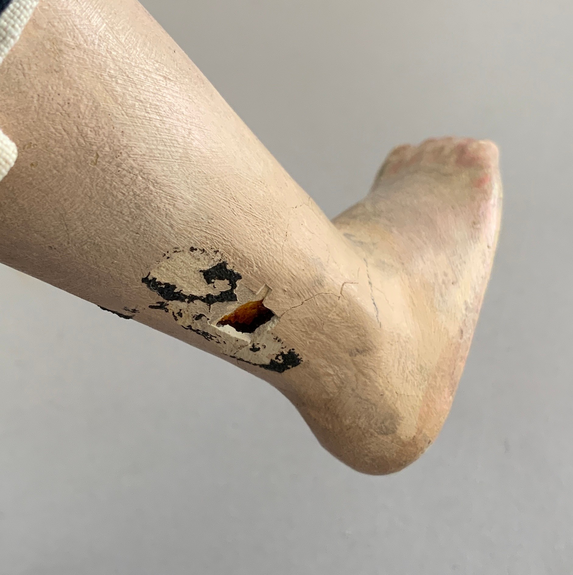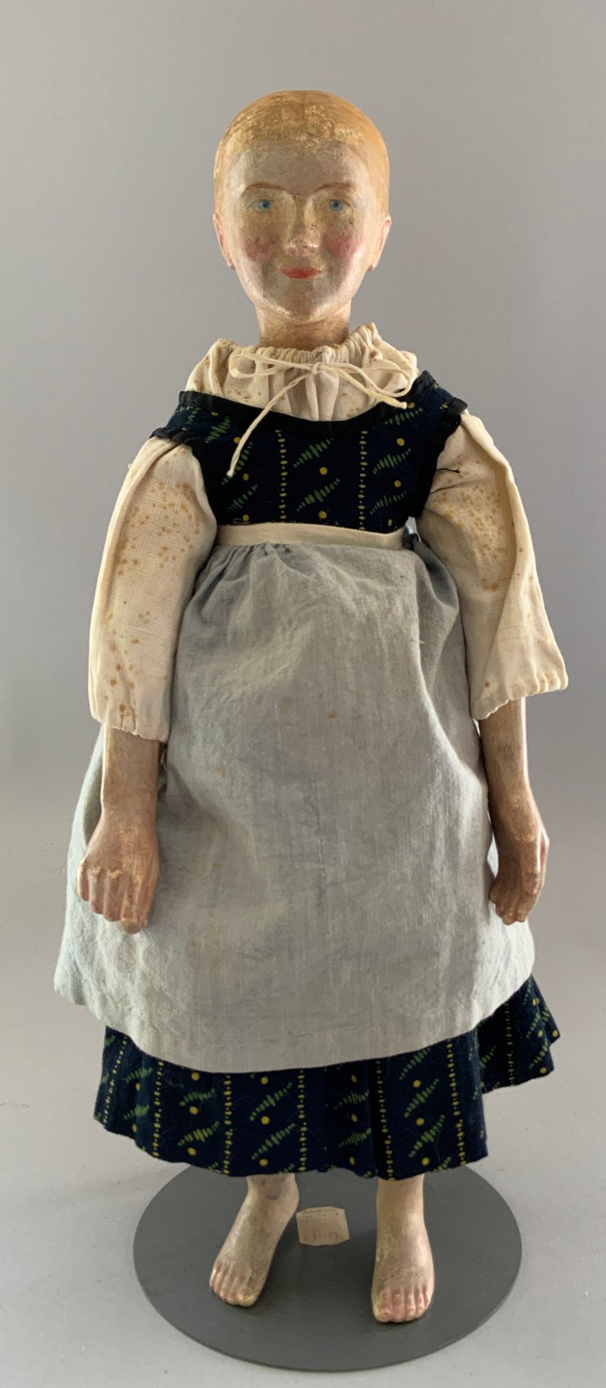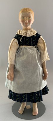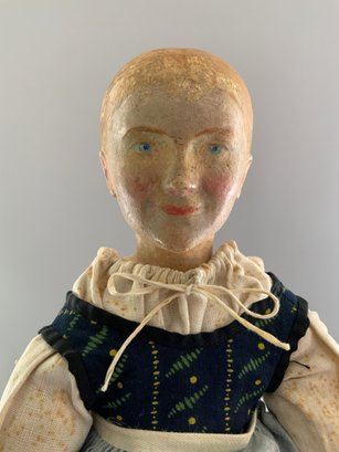 16 ½” Early carved wood peasant lady, painted features, center part hair, cloth body with wood limbs, blue dress, bare foot, (rubs)
