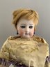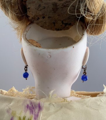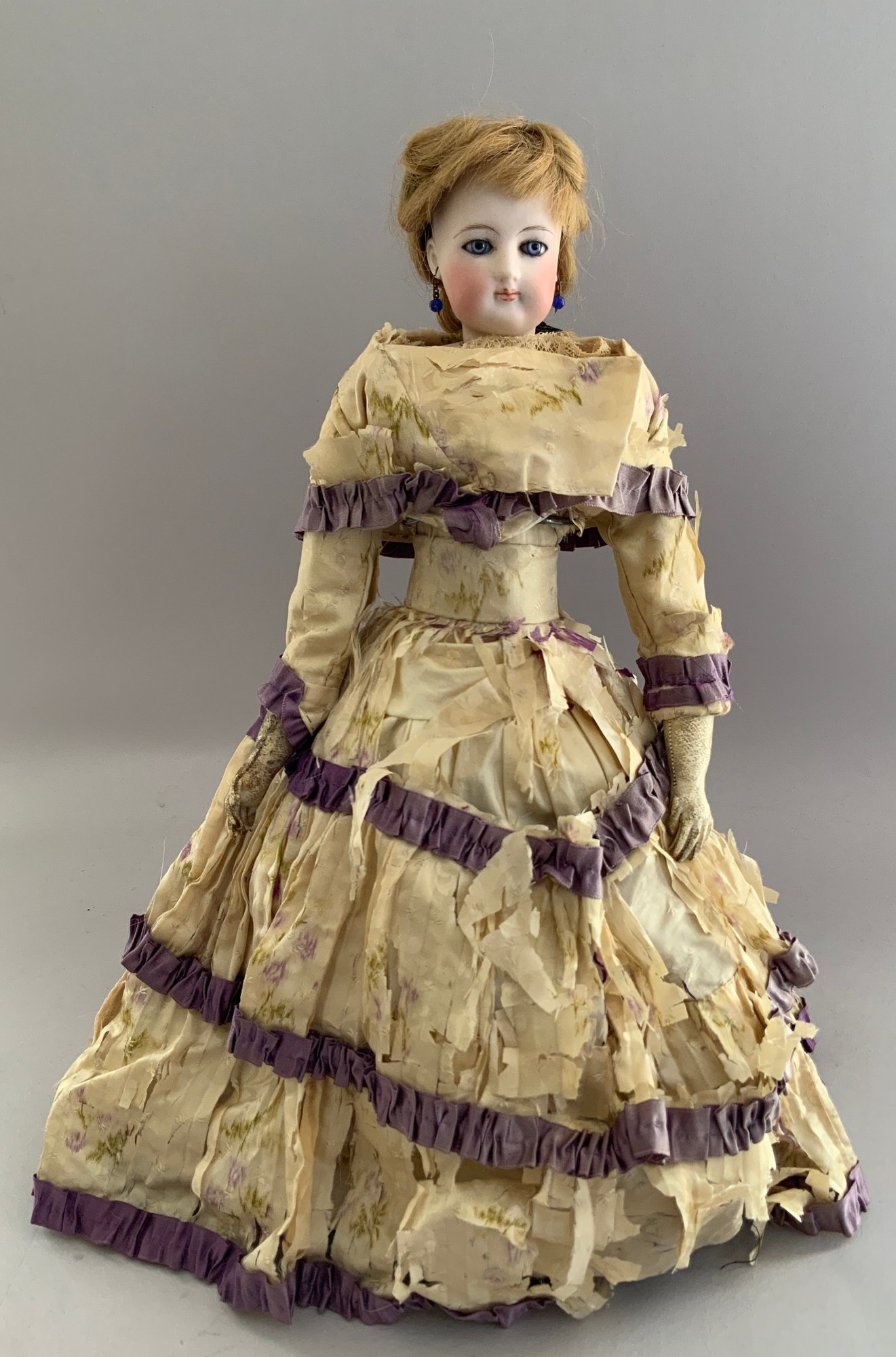 16 ½” French Fashion FG on shoulder 3 back of head, swivel neck shoulder plate, blue glass eyes, CM, PE, blonde HH wig, kid body (soiled), silk white dress/purple trim (melting badly) (sm. black dot top of right forehead, ink line above left eye)