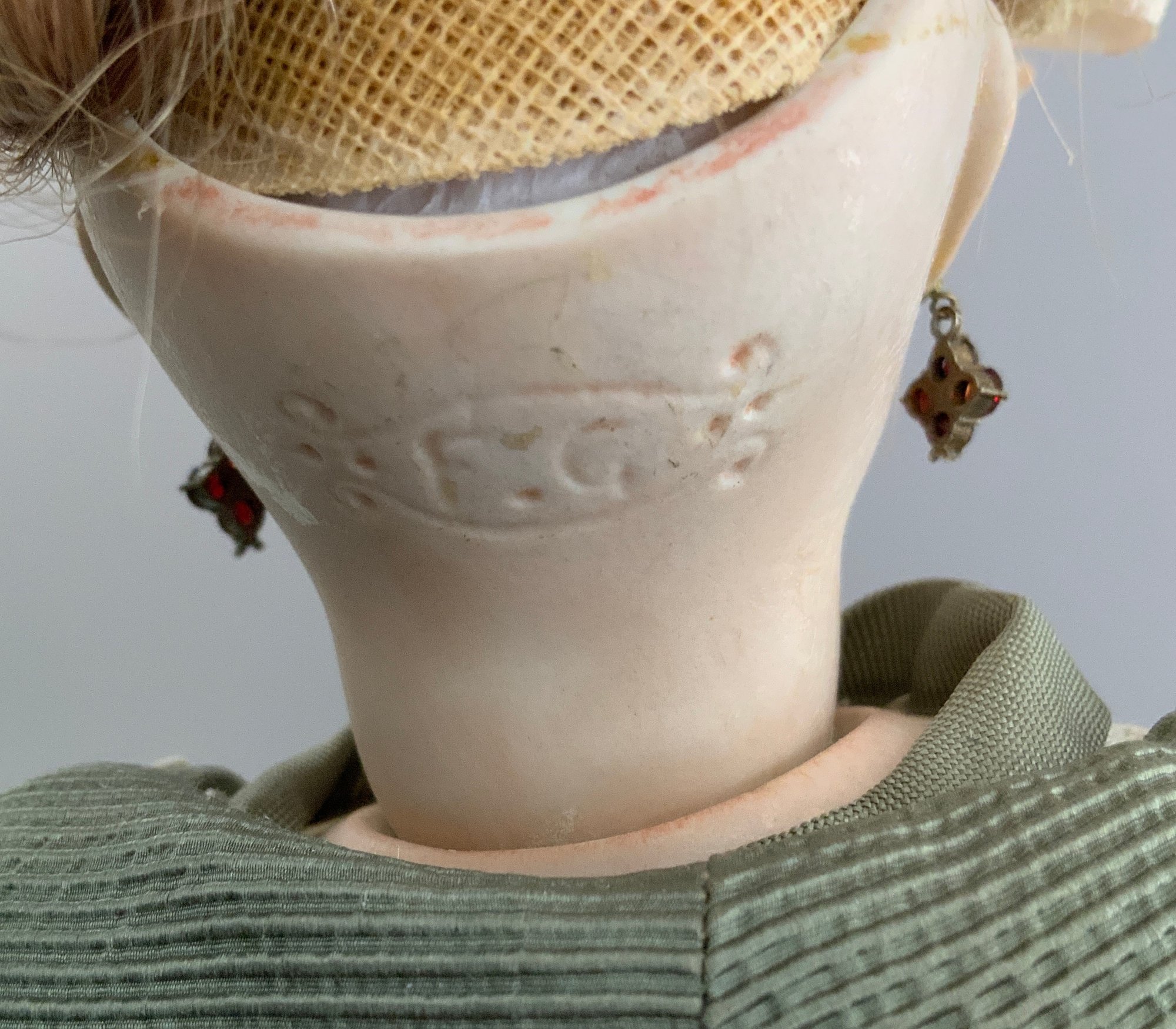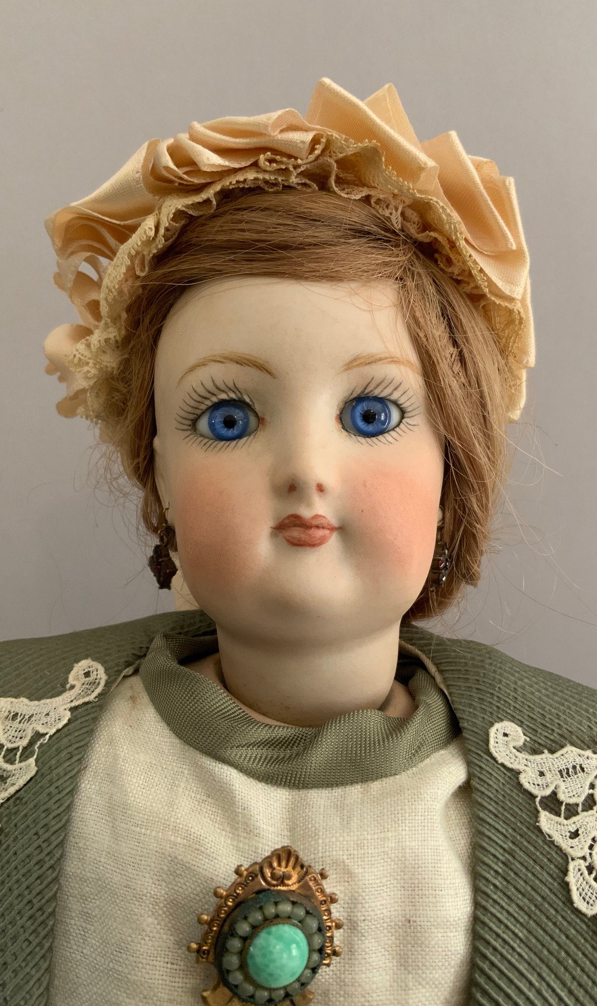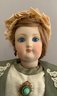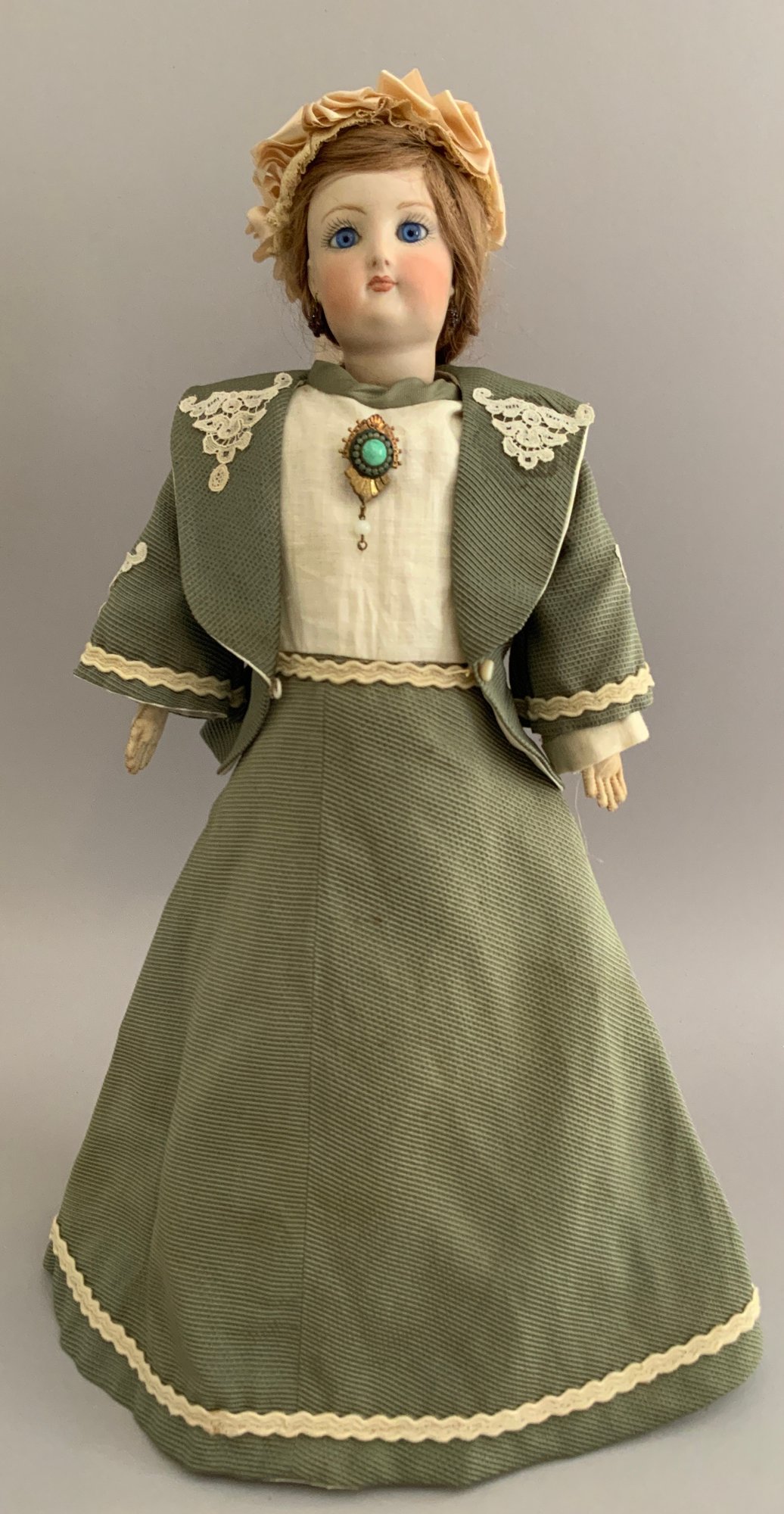 16 ½” French Fashion FG in scroll mark, blue glass eyes, CM, Blonde HH wig, kid body, green walking suit, (eyes have been reset)