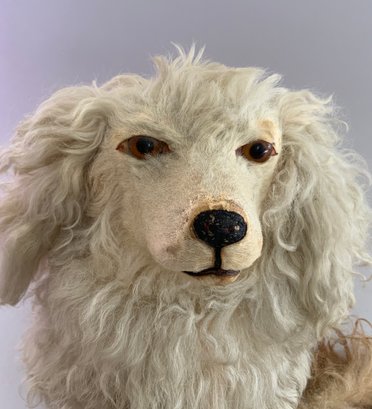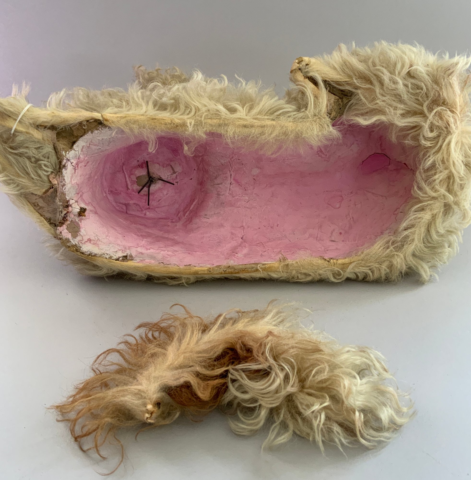 16” French pajama dog, white mohair & paper mache, glass eyes, some wear spots, tail is detached, missing bottom pouch