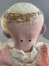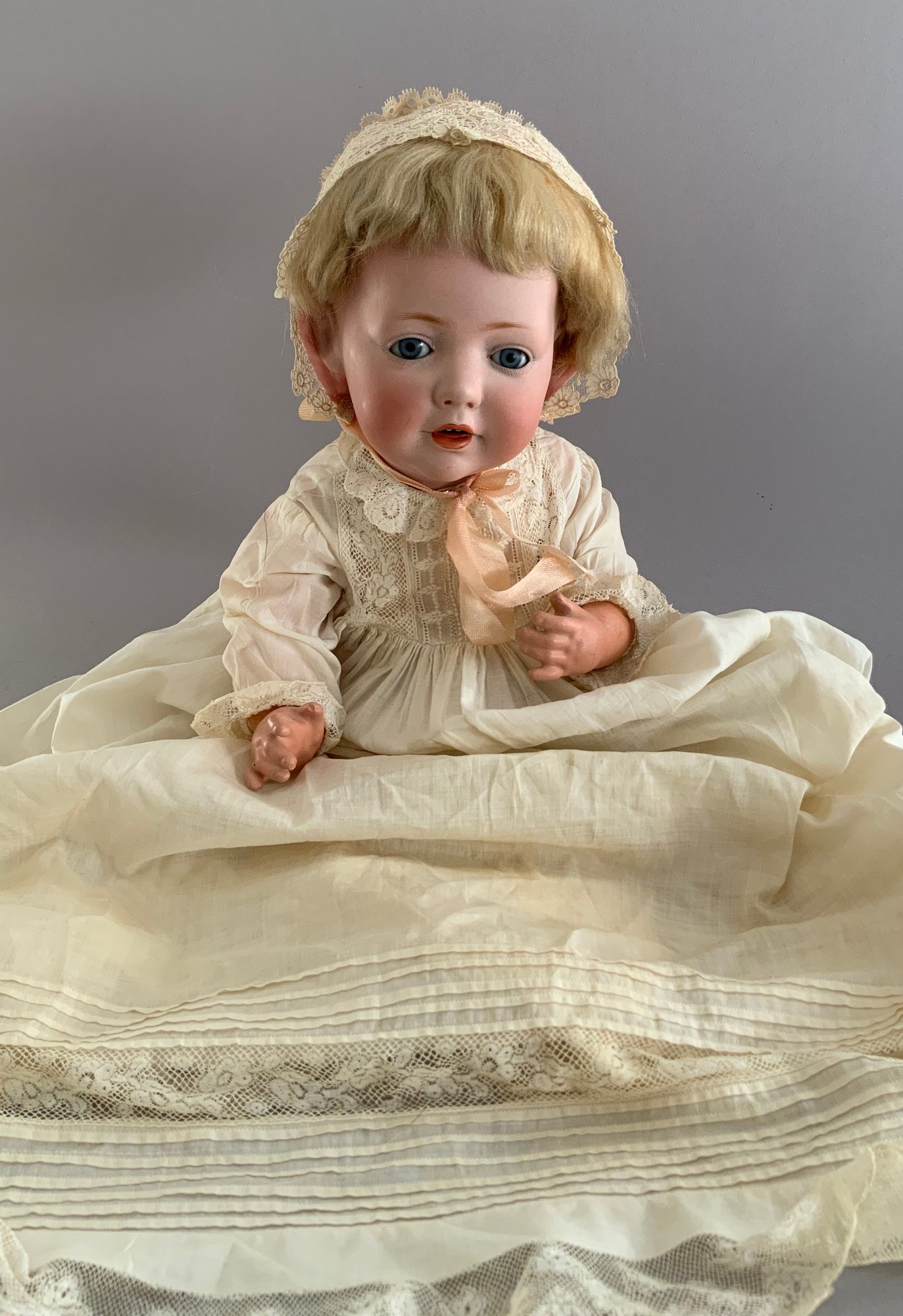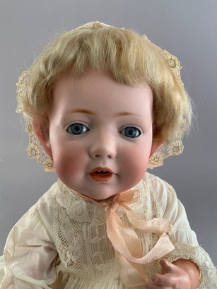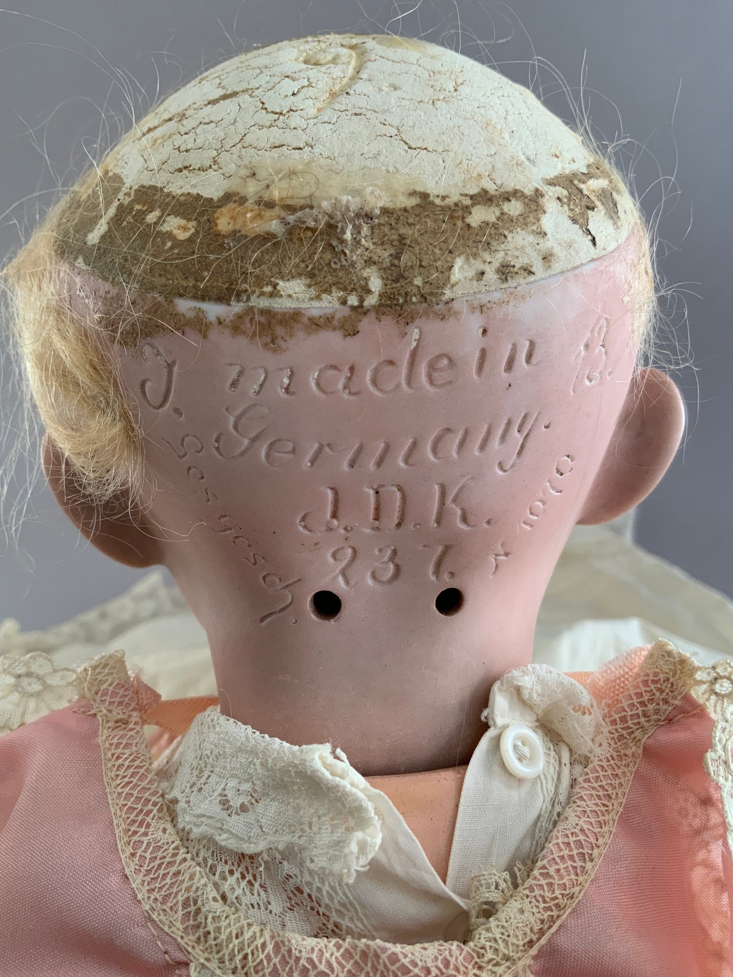 16” JDK 237 “Hilda”, blue glass eyes, OM wit teeth, blonde mohair wig, plaster pate (excessive wig glue), compo baby body, white dress (few holes)