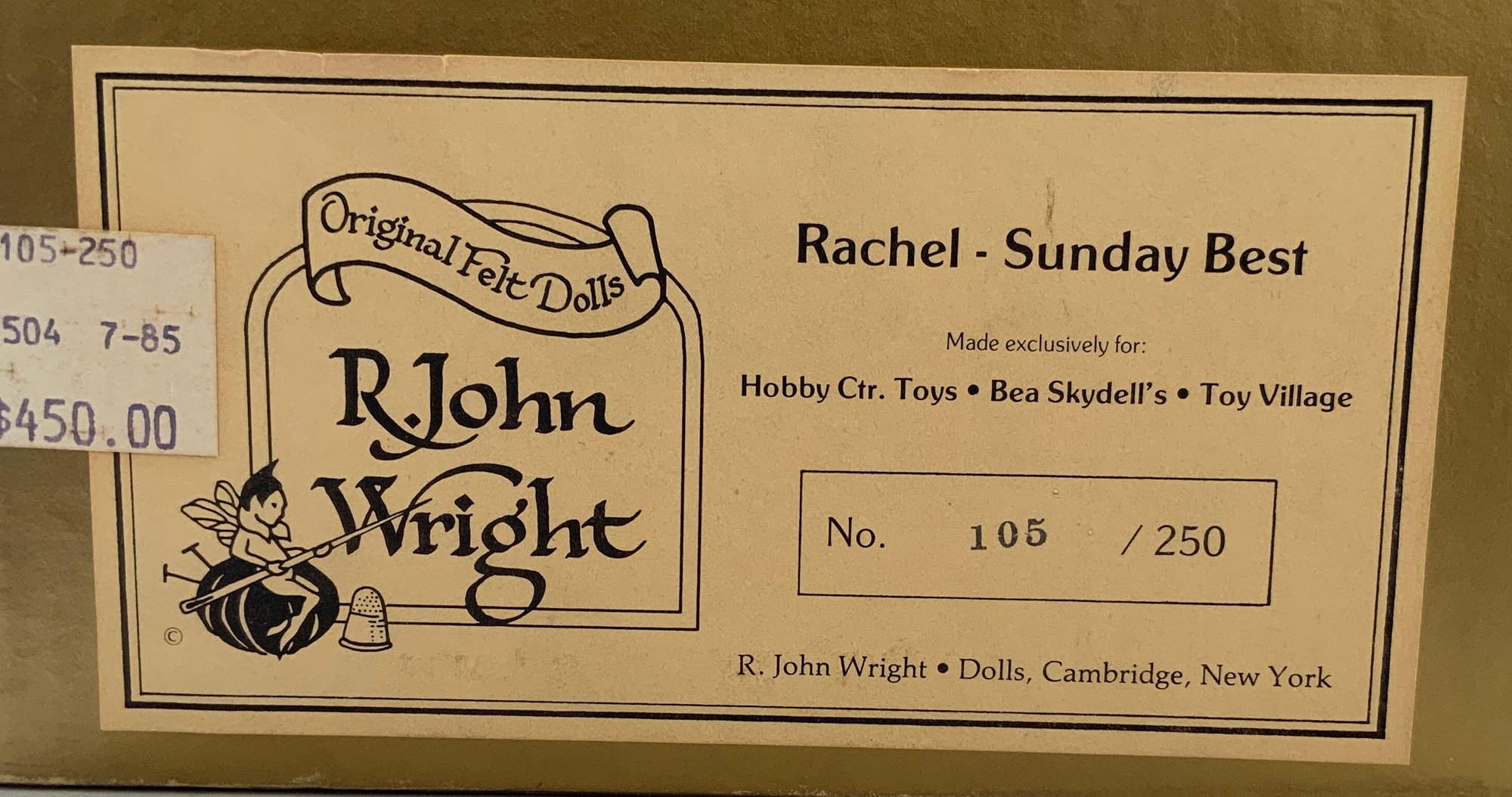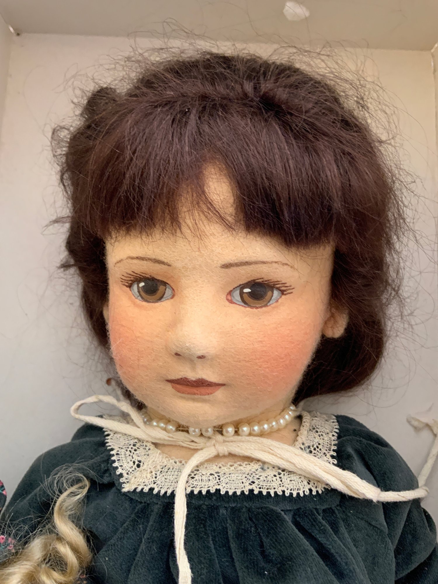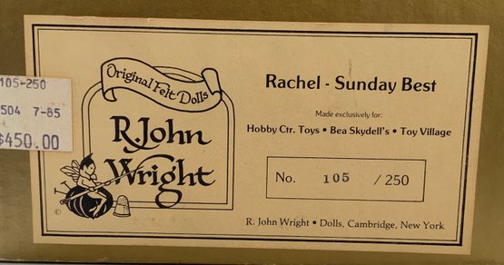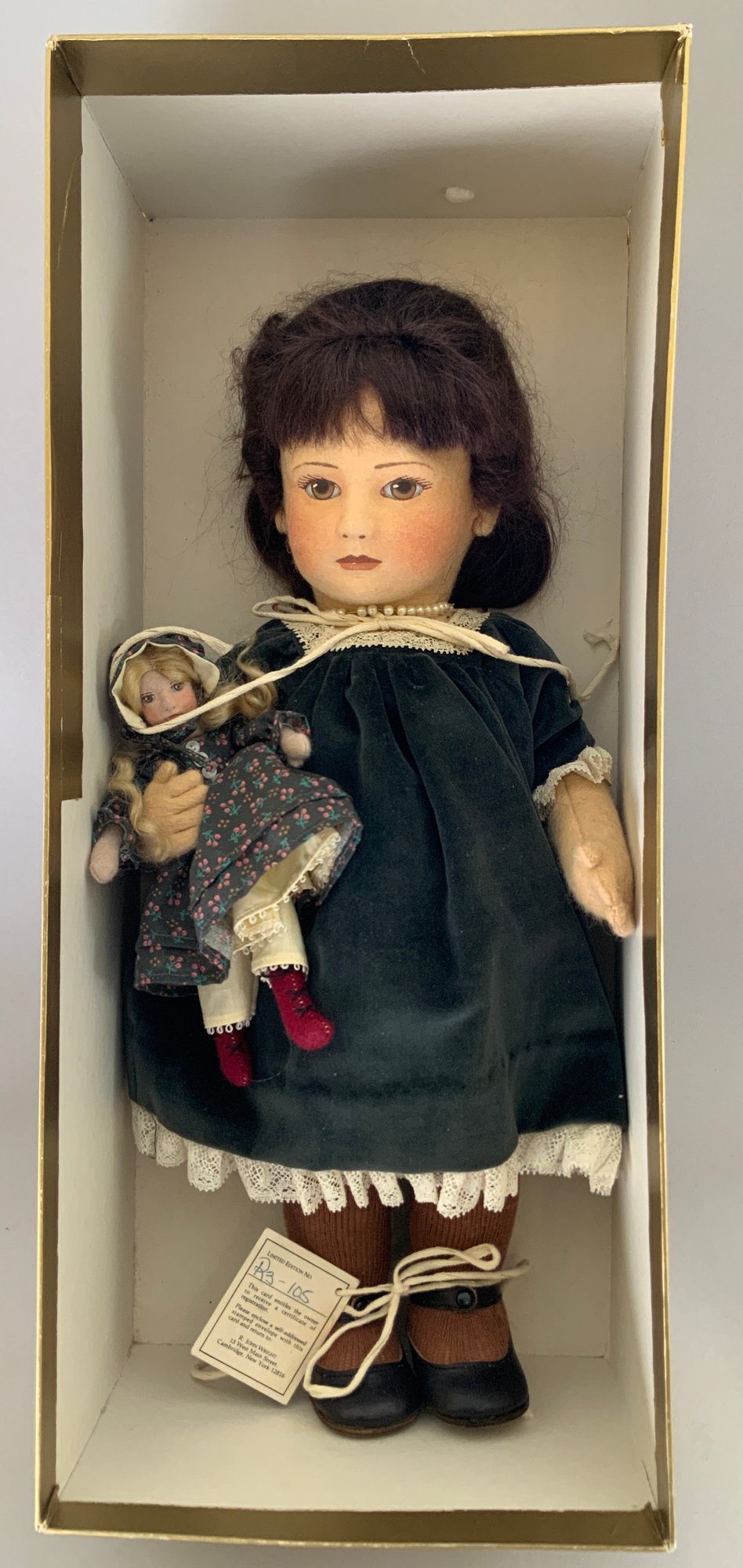 16” R John Wright felt doll “Rachel” 105/250, holding a doll, painted features, blue velvet dress, no COA, original box (light wear), very good condition