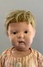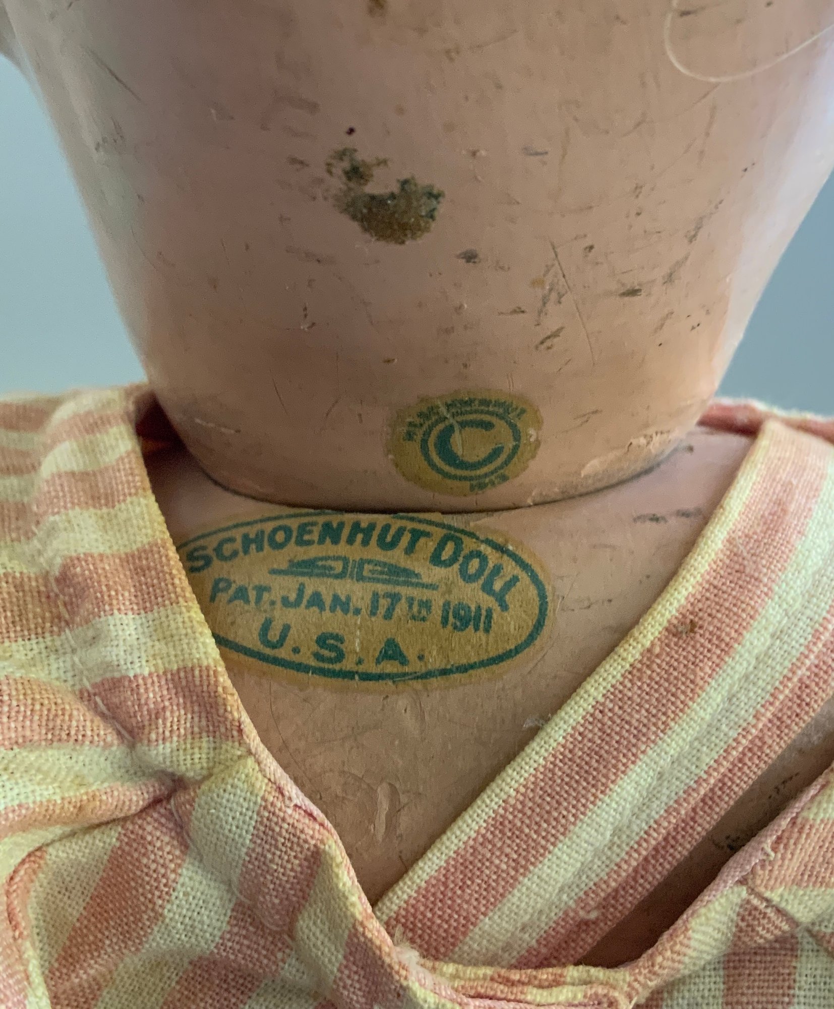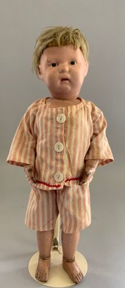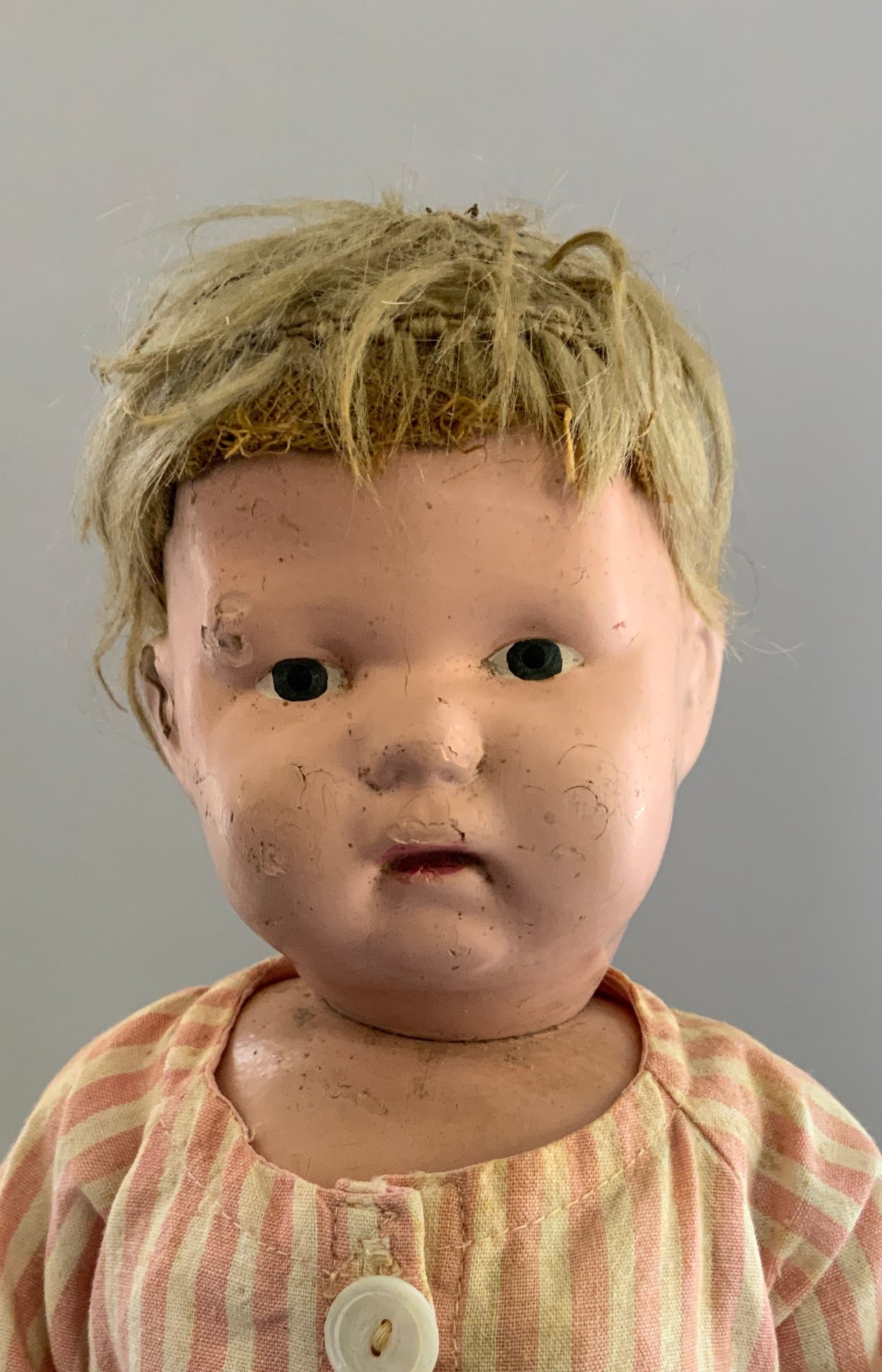 16” Schoenhut boy, painted features, blonde mohair wig, green label, pink stripe outfit (fading), (facial rubs & cracking)