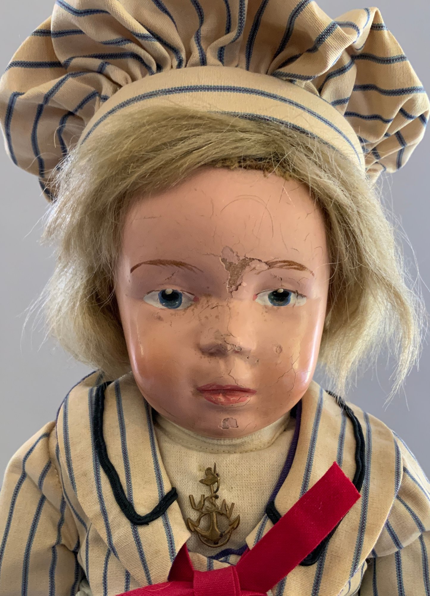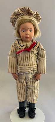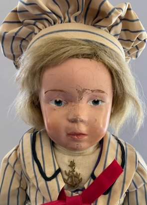 16” Schoenhut boy, painted features, blonde mohair wig, yellow/blue sailor outfit, green label (chips & rubs, touchups)