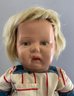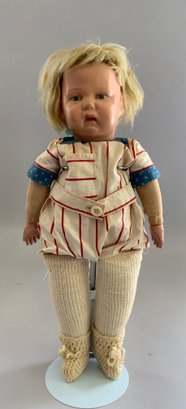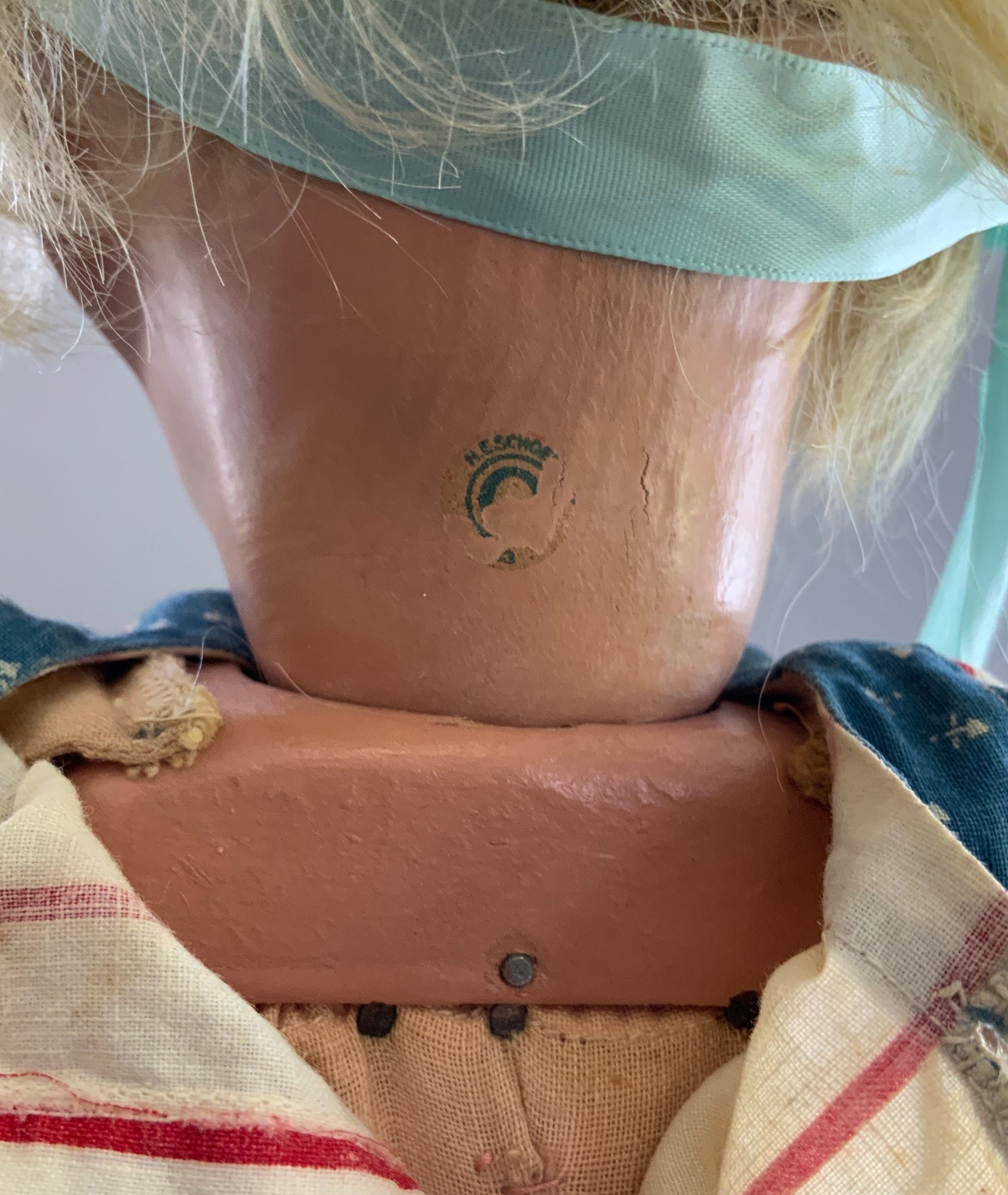 16” Schoenhut girl, painted features, blonde mohair wig, partial green label, cloth body with wood hands, patriotic outfit, (rubs)