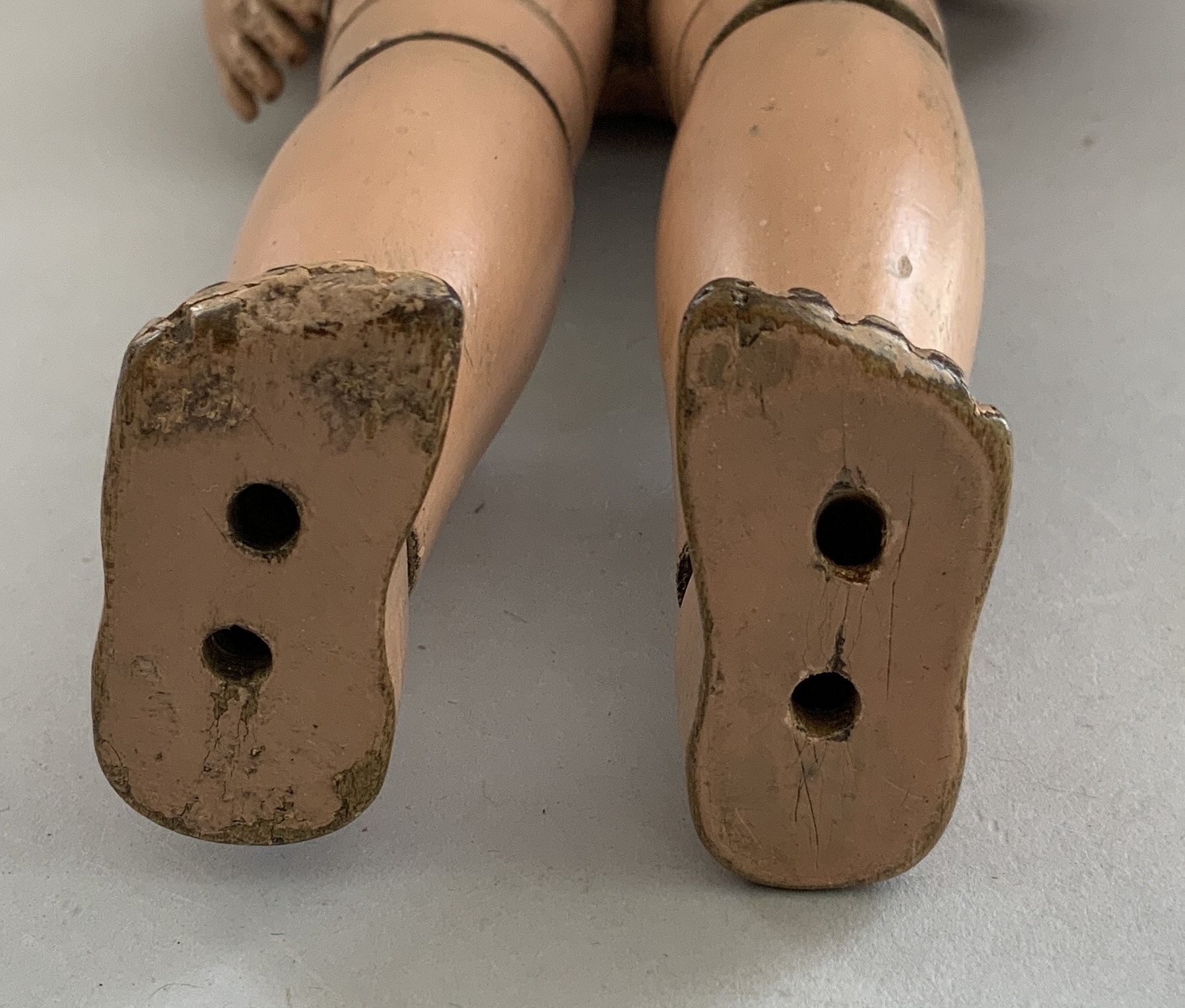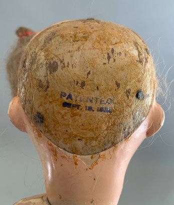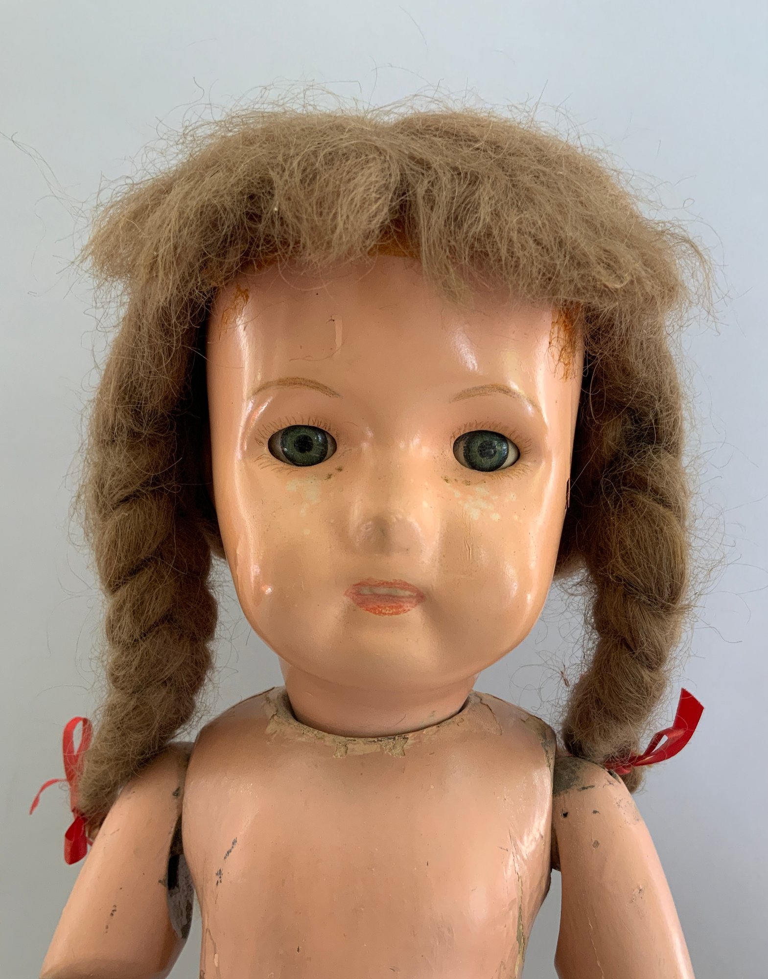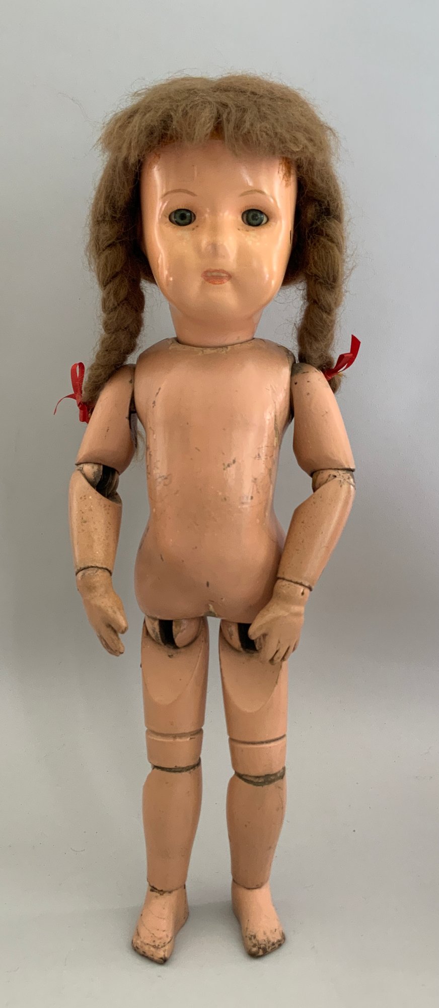 16” Schoenhut girl, blue glass sleep eyes, brown mohair wig, patent on pate Sept 13, 1921, (head & body match?), red gingham dress