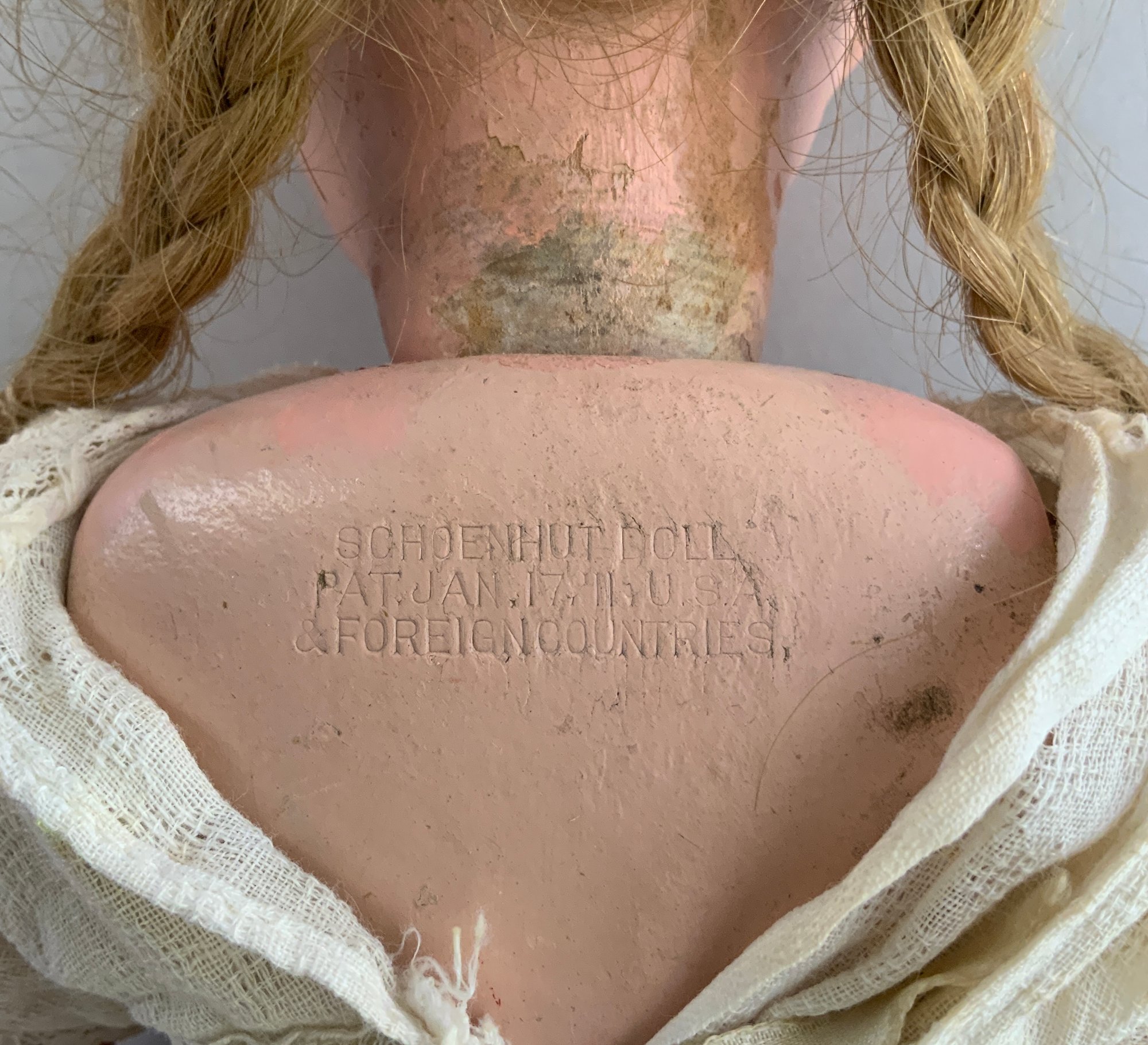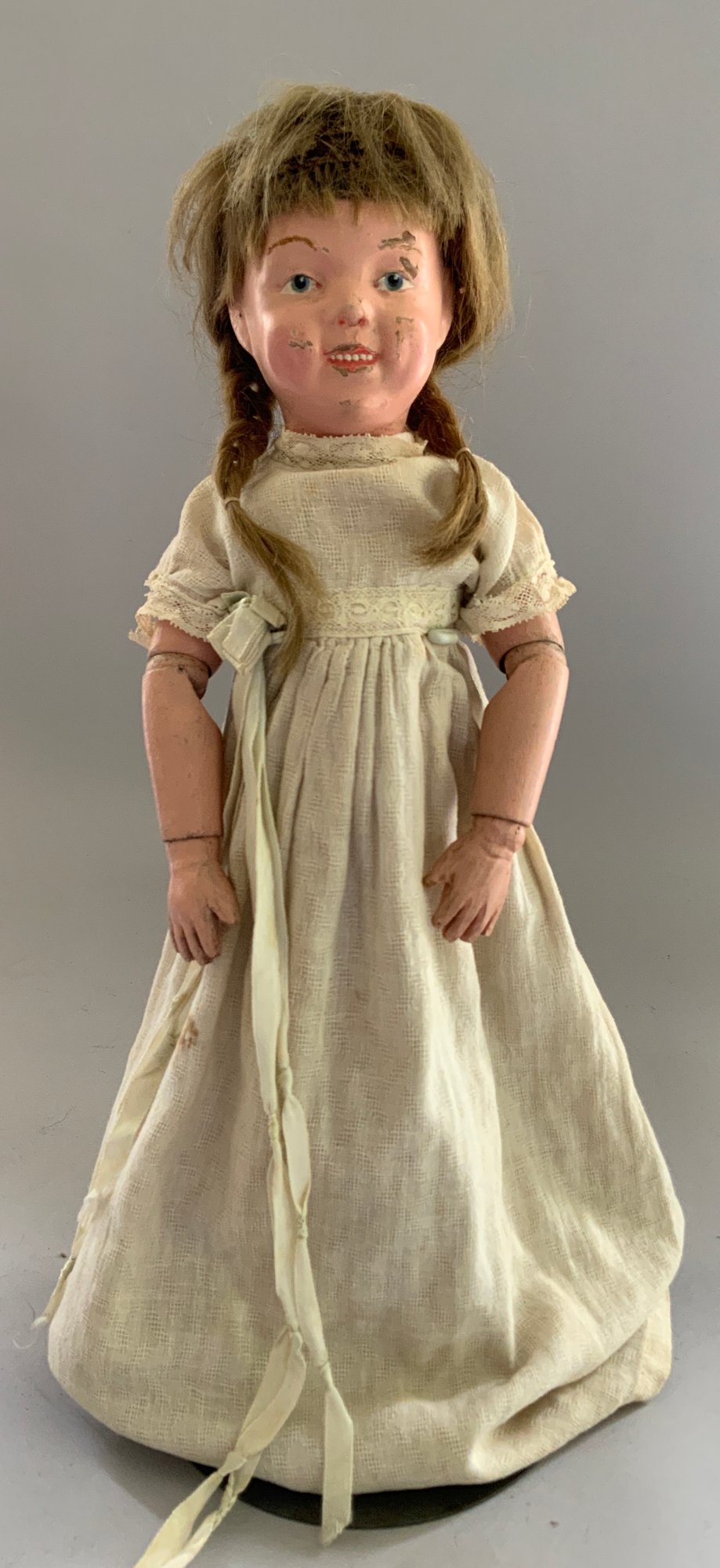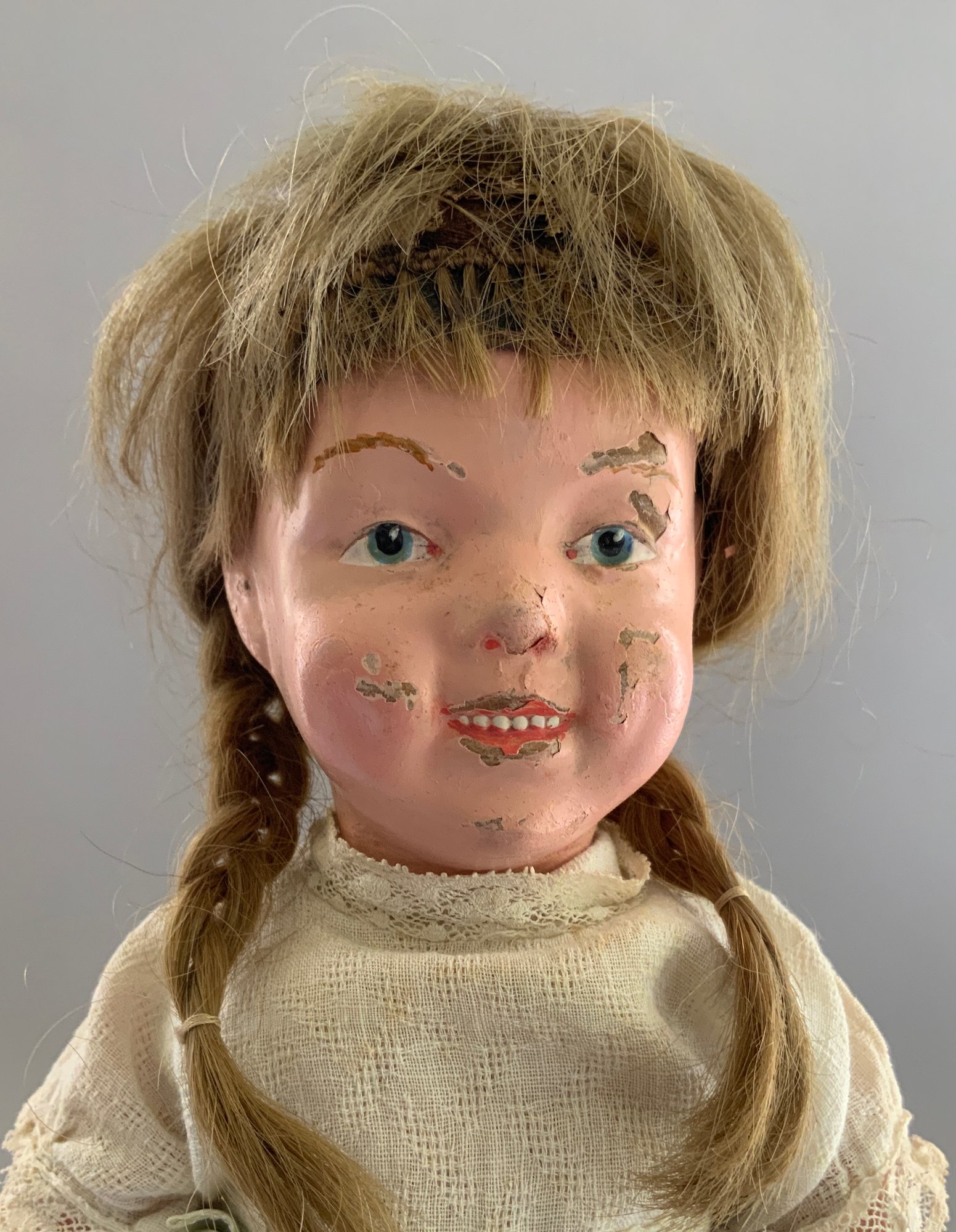 16” Schoenhut girl, painted features, blonde mohair wig, OM with teeth, light yellow dress (stains), (wear, rubs, area of repaint)