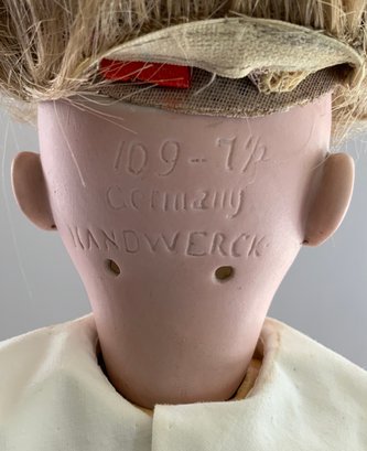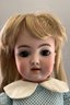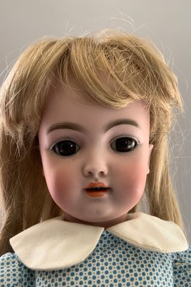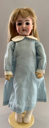 17” Bisque 109 Handwerck, brown glass sleep eyes, OM with teeth, blonde mohair wig, PE, BJCB, blue/white print dress