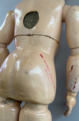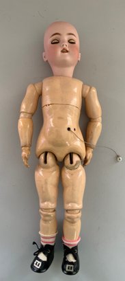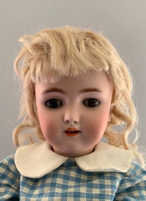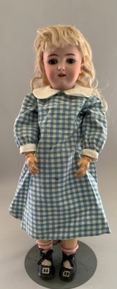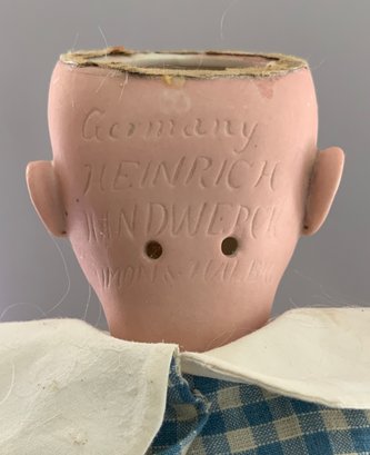 17” Bisque Heinrich Handwerck, brown glass sleep eyes, OM with teeth, PE, BJCB, blue/white check dress