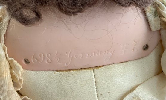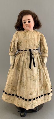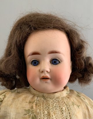17” Bisque shoulder head 698 1/2 , blue glass sleep eyes, OM with teeth, brown mohair wig, kid body, white green floral dress (stained)