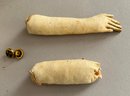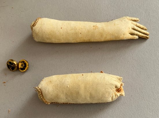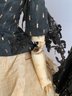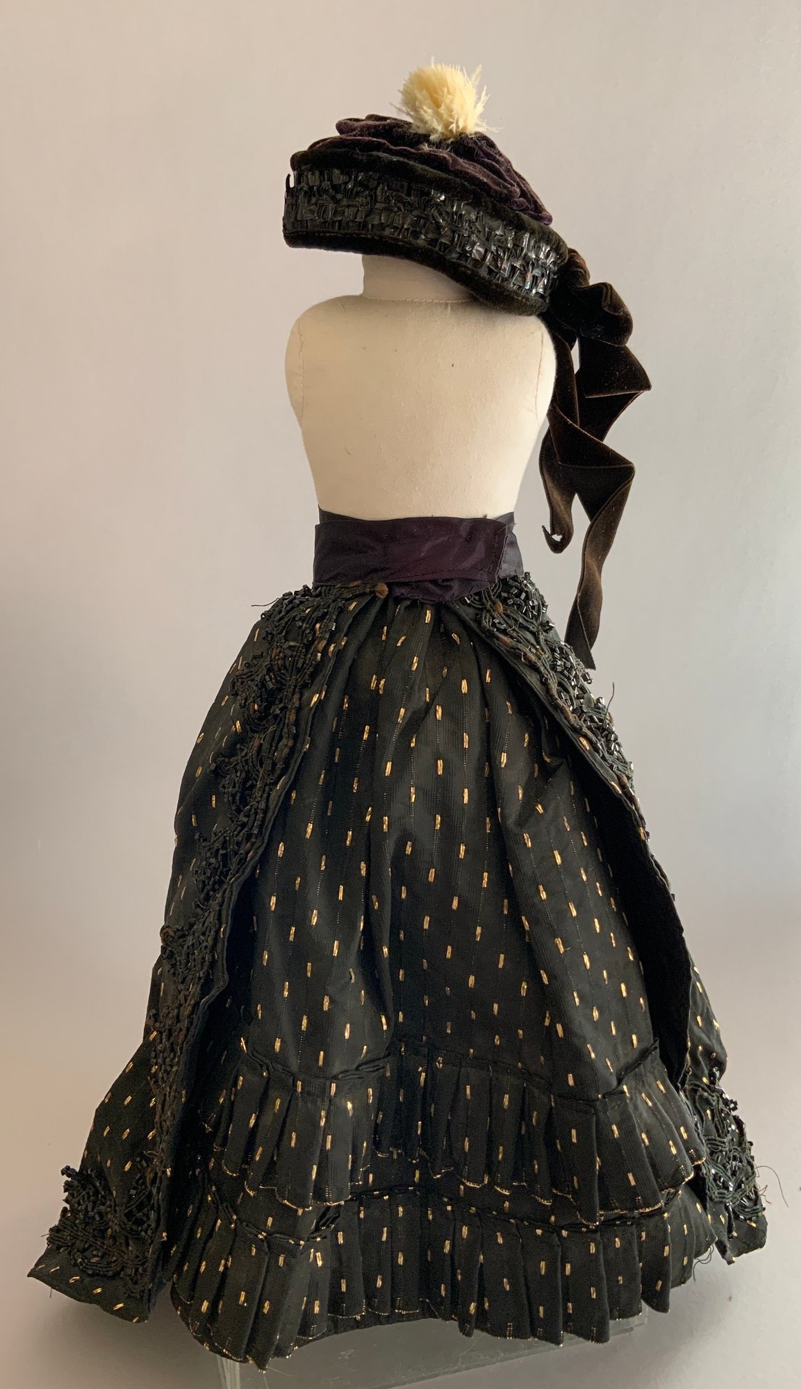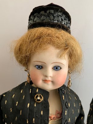 17” Bisque shoulder head Belton type fashion, blue glass eyes, CM, PE, blonde mohair wig, cloth body with kid arms (detached & damaged), black and gold outfit, antique hoop corset