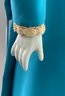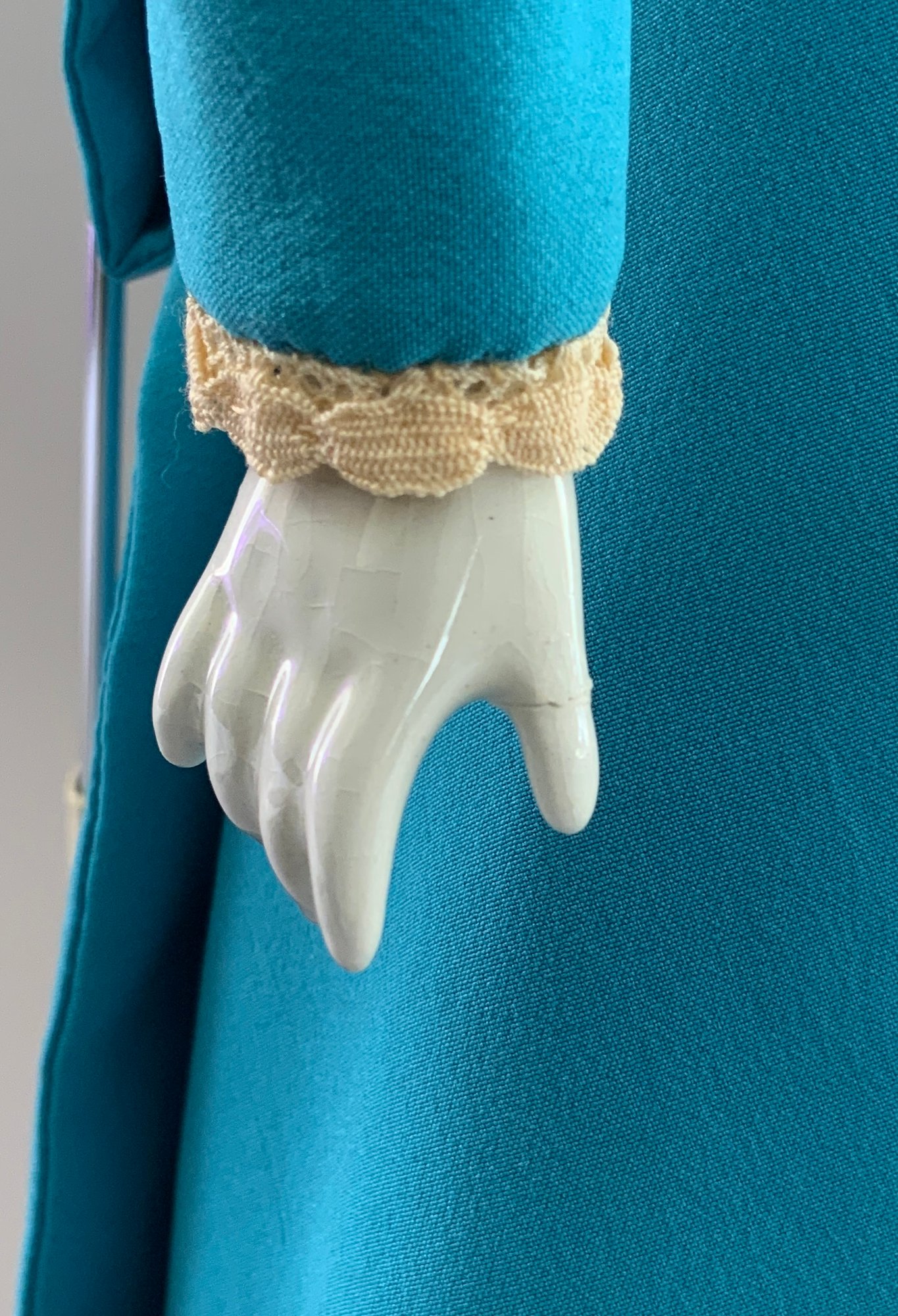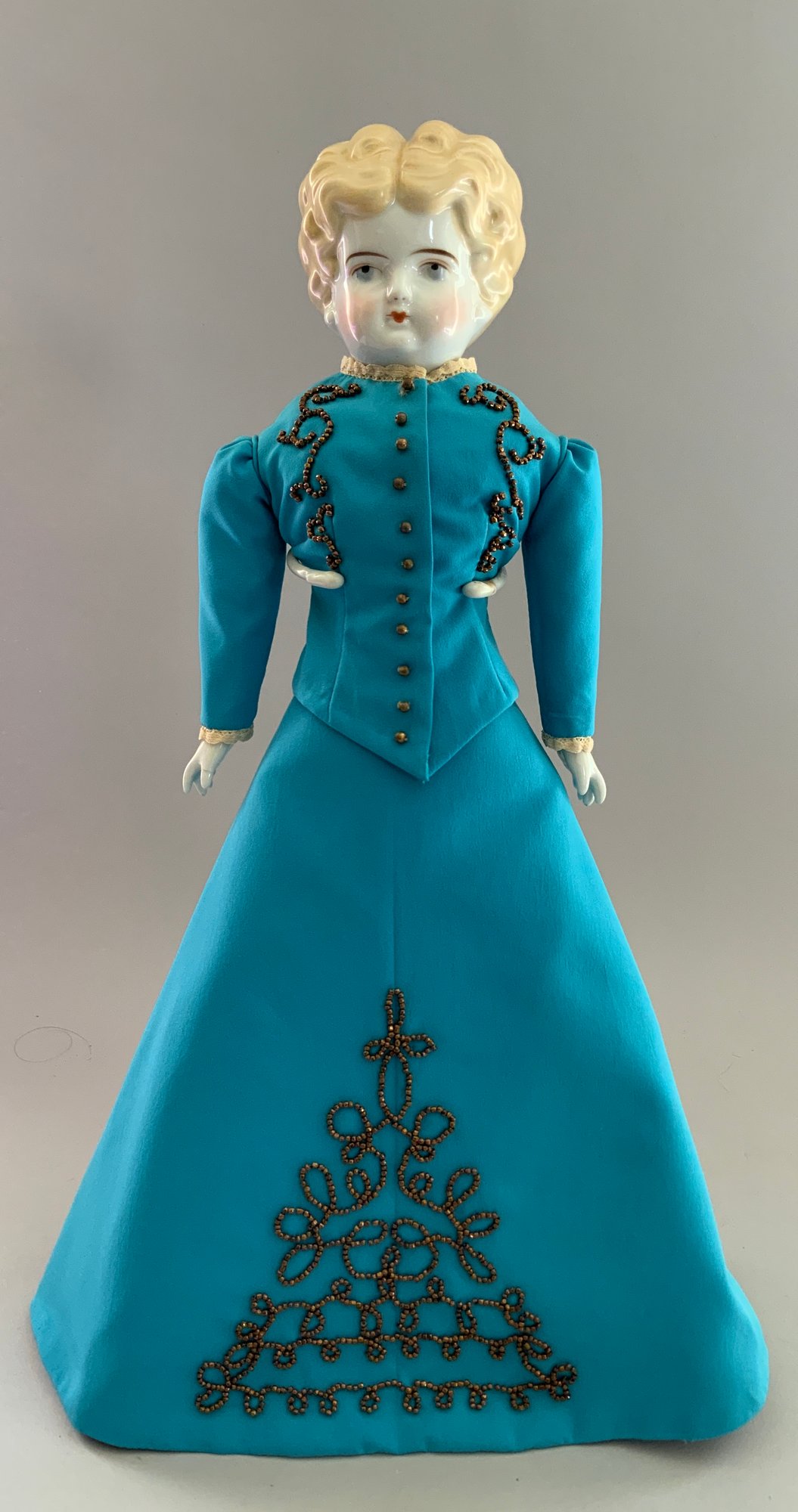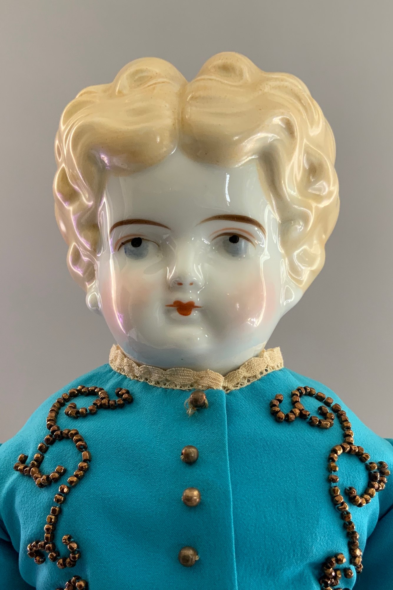 17” Blonde hair china shoulder head incised 5, painted features, cloth body with china limbs, sculpted hair, blue dress with beaded trim, (right thumb repair)