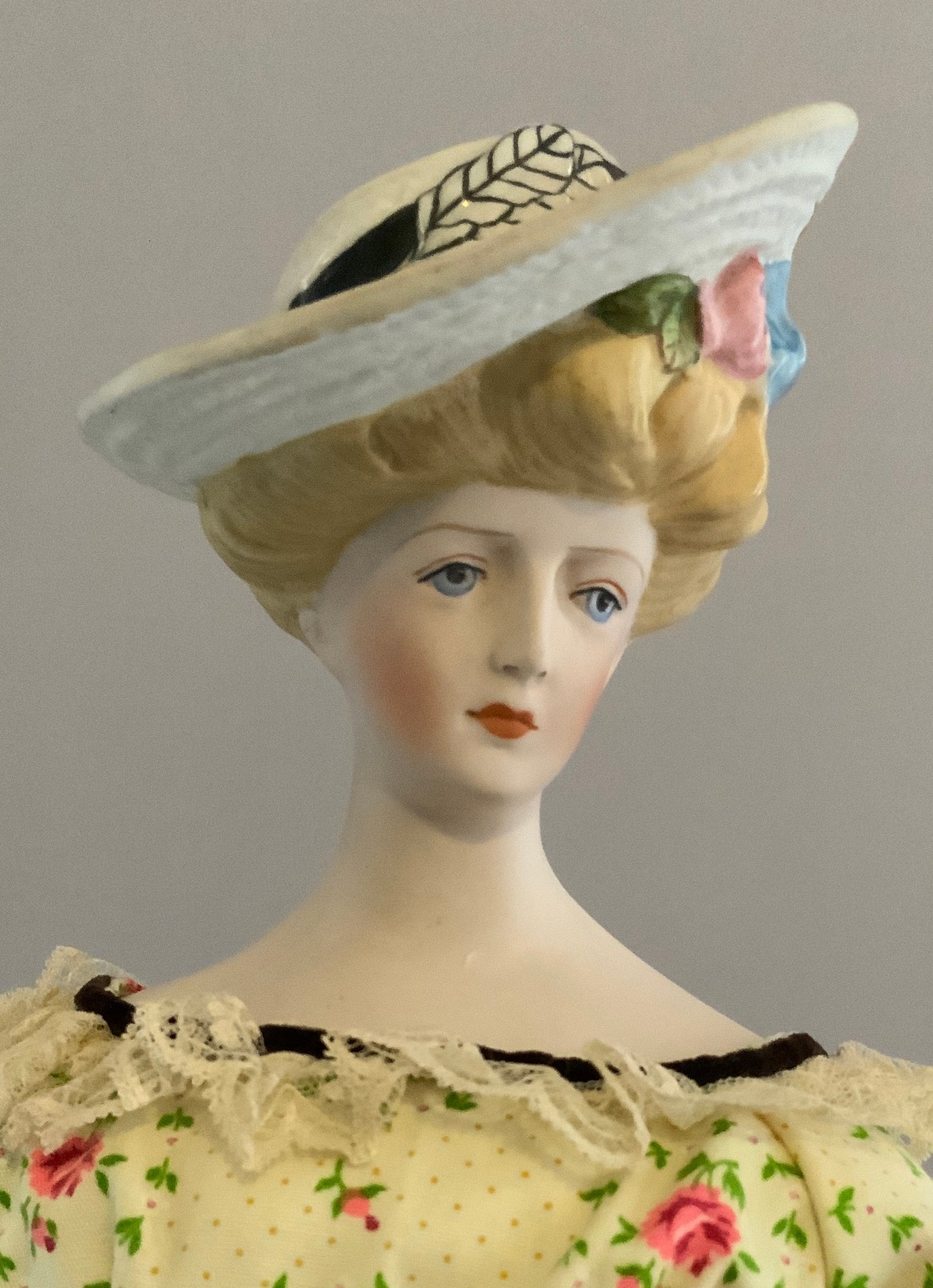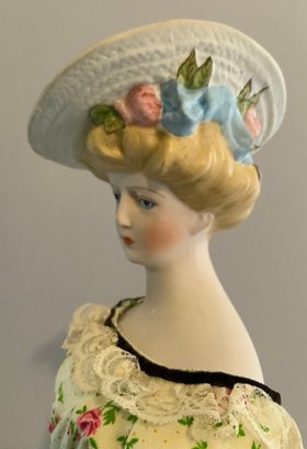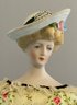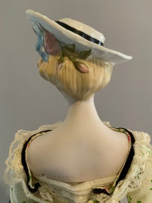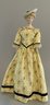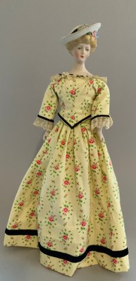 17” Emma Clear shoulder head parian artist doll, painted features, blonde sculpted hair with molded hat, cloth body with parian limbs, black & gold trim boots, yellow floral dress