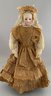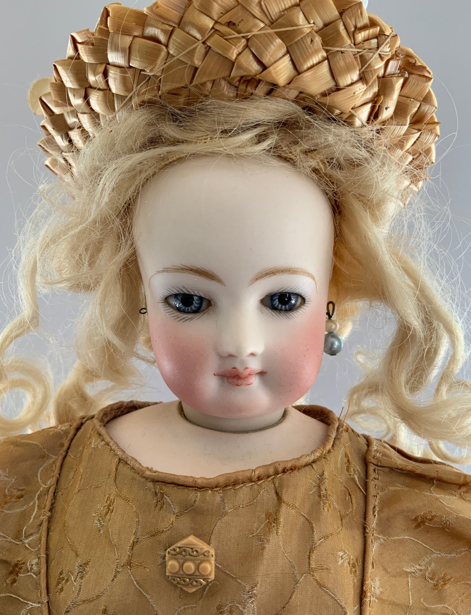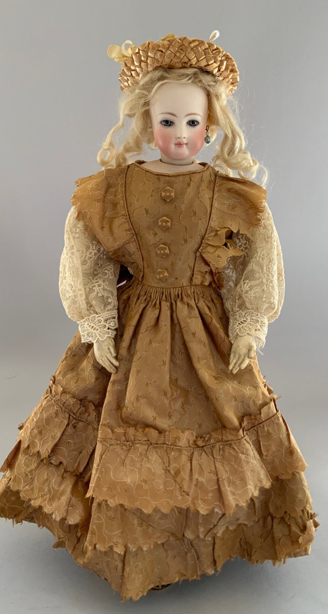 17” French Fashion swivel neck, blue glass eyes, CM, PE, blonde mohair wig, kid body, brown silk dress with needlework/lace arms (minor melting)