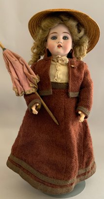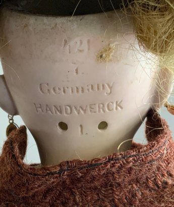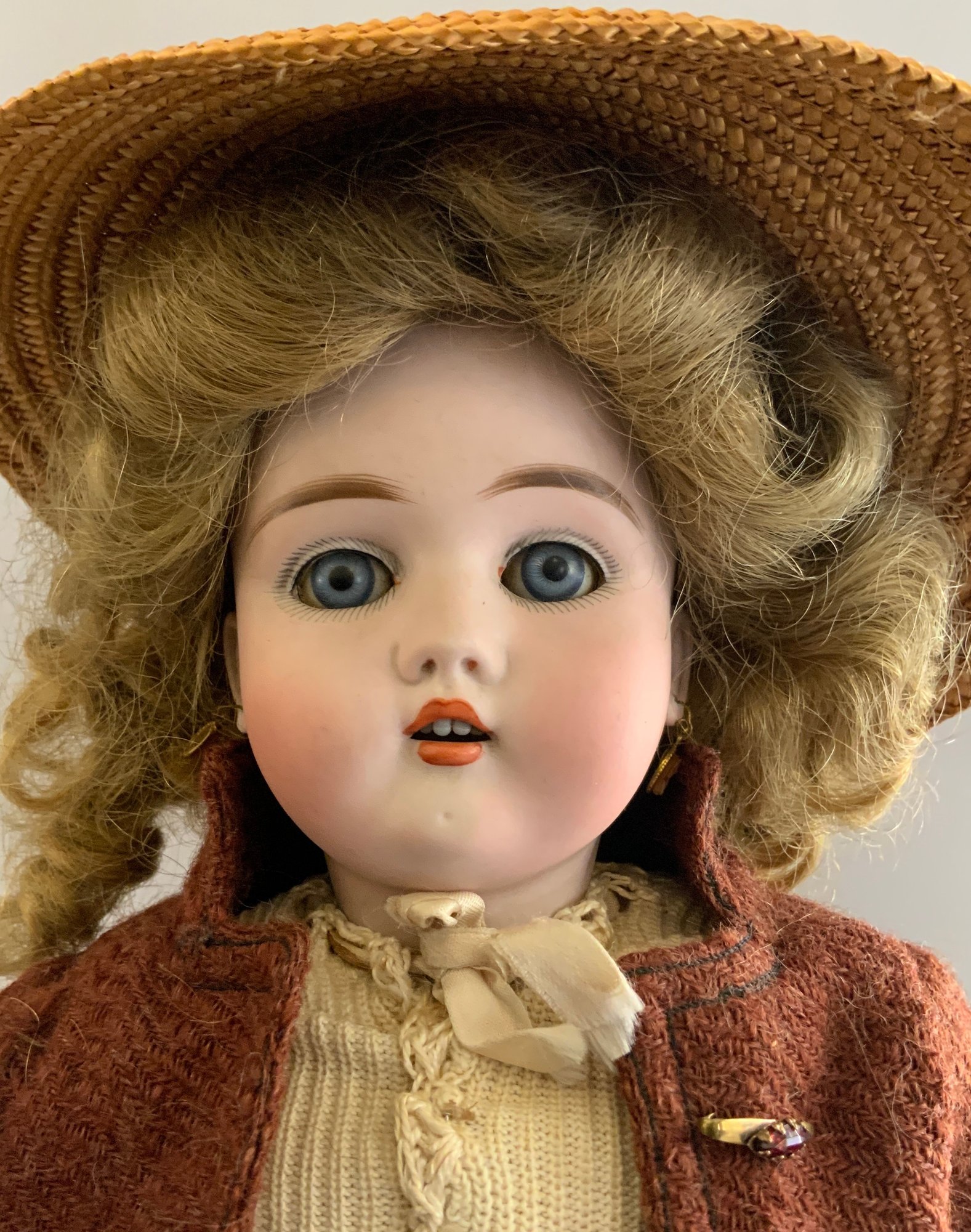 17” Handwerck 421 1, blue glass sleep eyes, OM with teeth, PE, blonde mohair wig, BJCB, red wool outfit