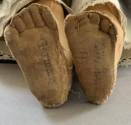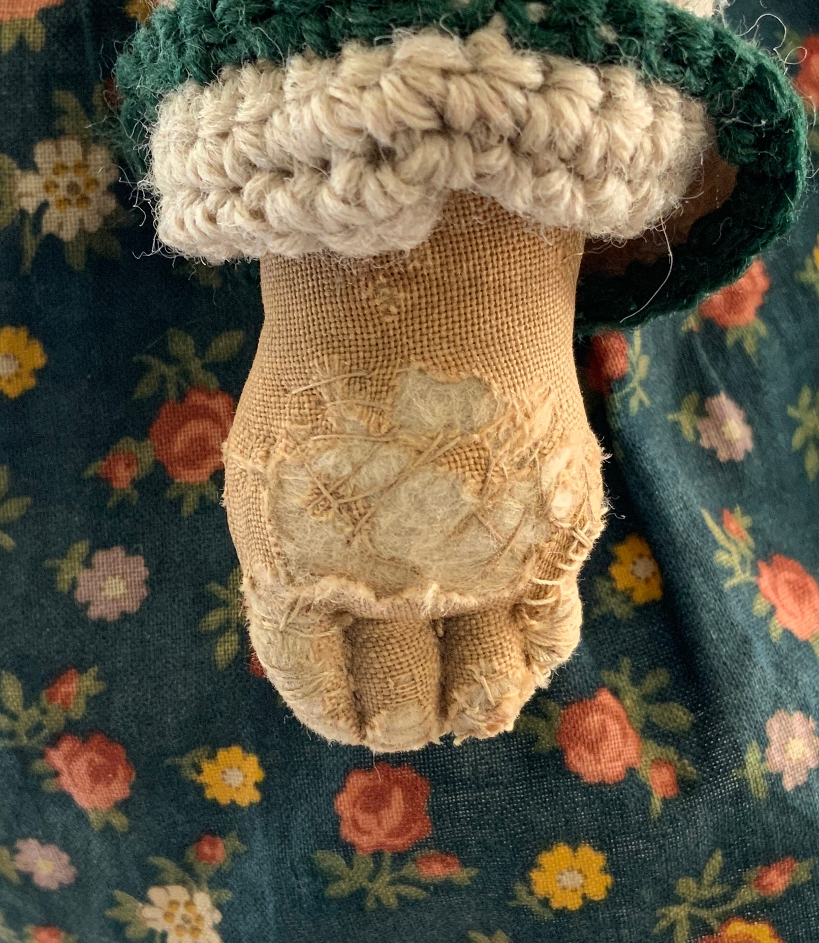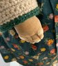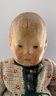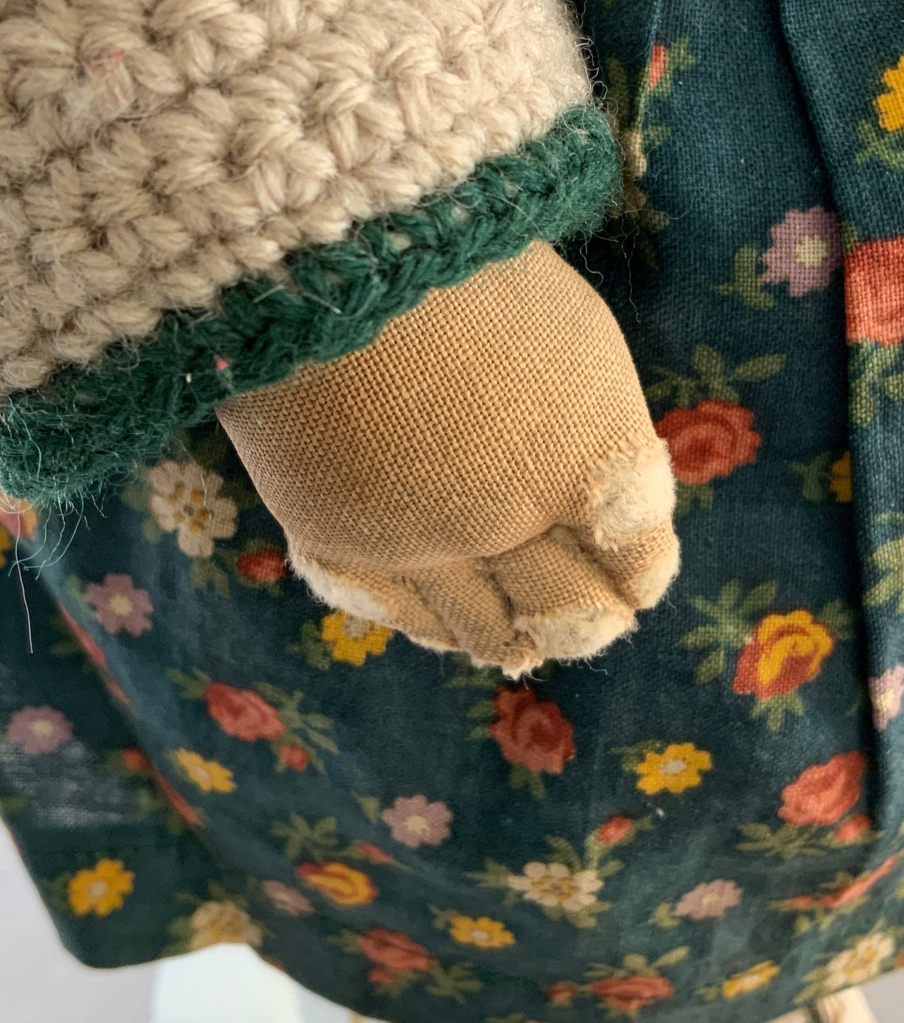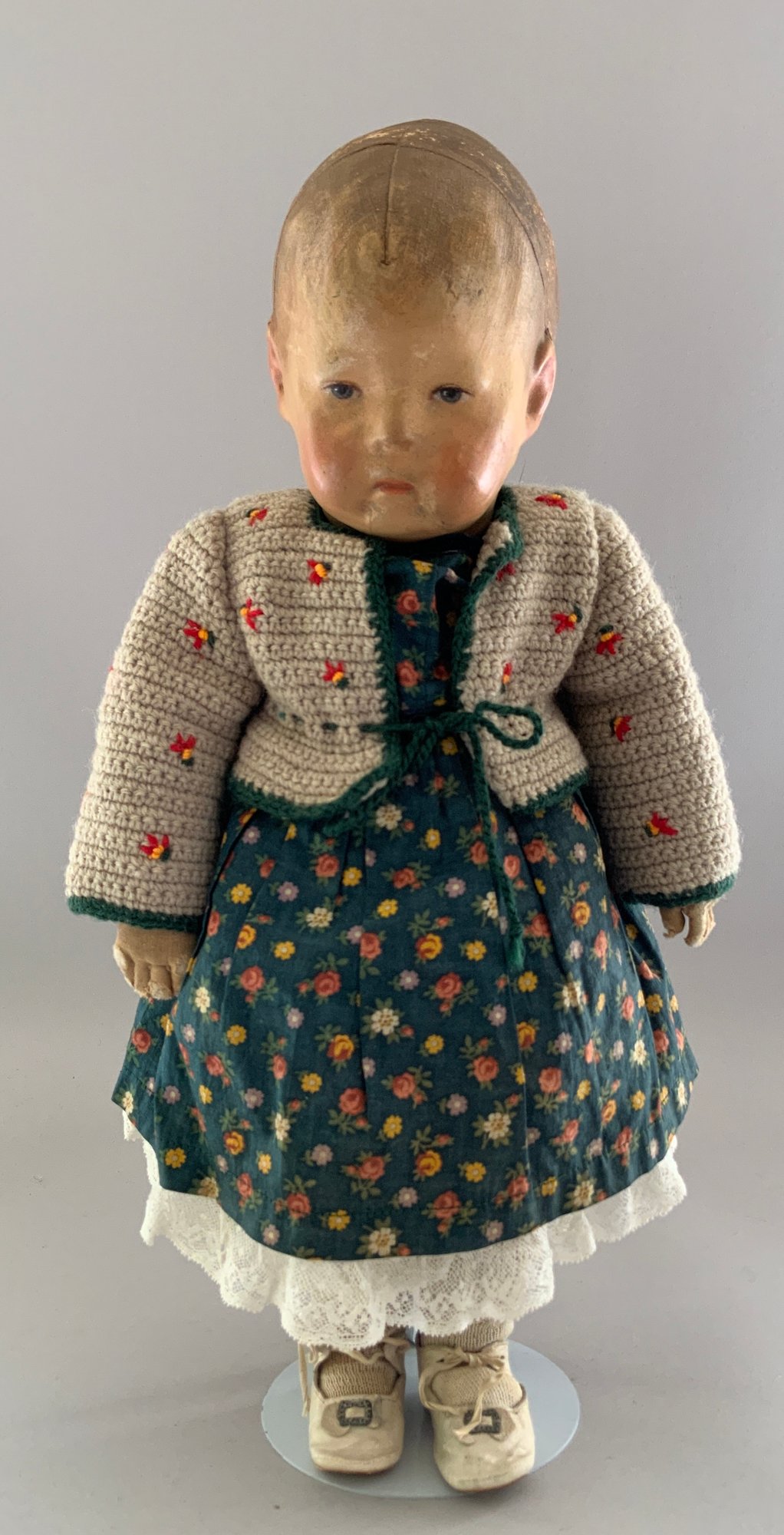 17” Kathe Kruse, molded muslin head, painted features, wide hip, cloth body, knit sweater & green floral dress, 9finger & hand wear, minor head rubs