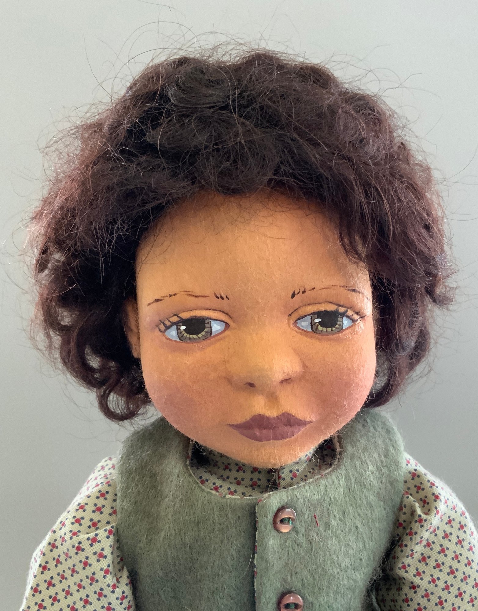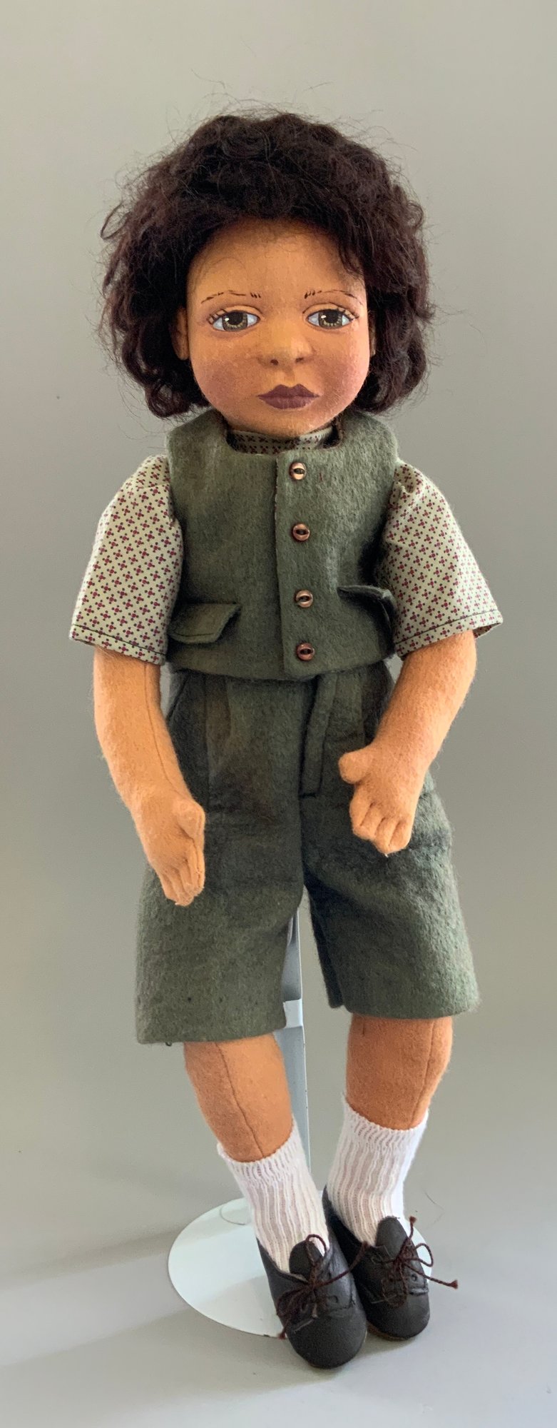 17” Maggie Iacono “David” felt doll 10/25, painted features, black hair, green wool outfit, earlier jointed arms, hips, neck, very light wear